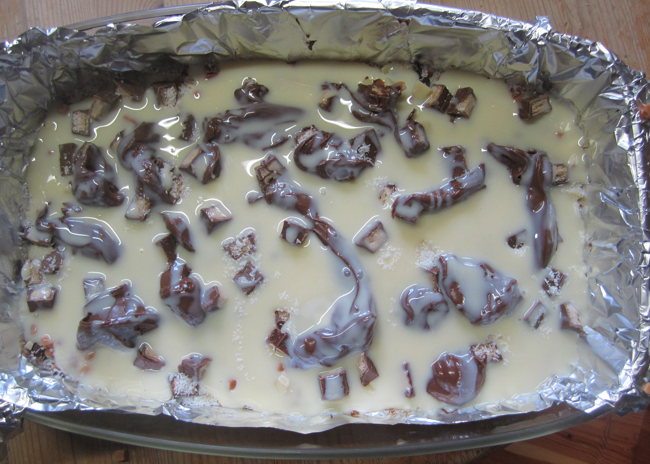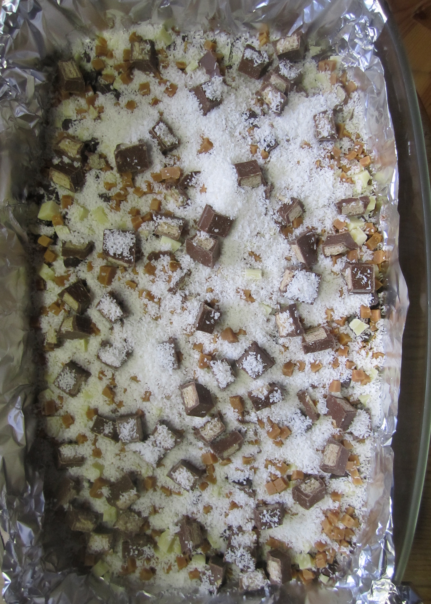 Jetzt dunkle Schokolade, weisse Schokolade, Caramel-Würfel, Kitkats und Kokosflocken nacheinander in der Form verteilen. Das Nutella löffelweise daraufgeben/daraufklecksen.