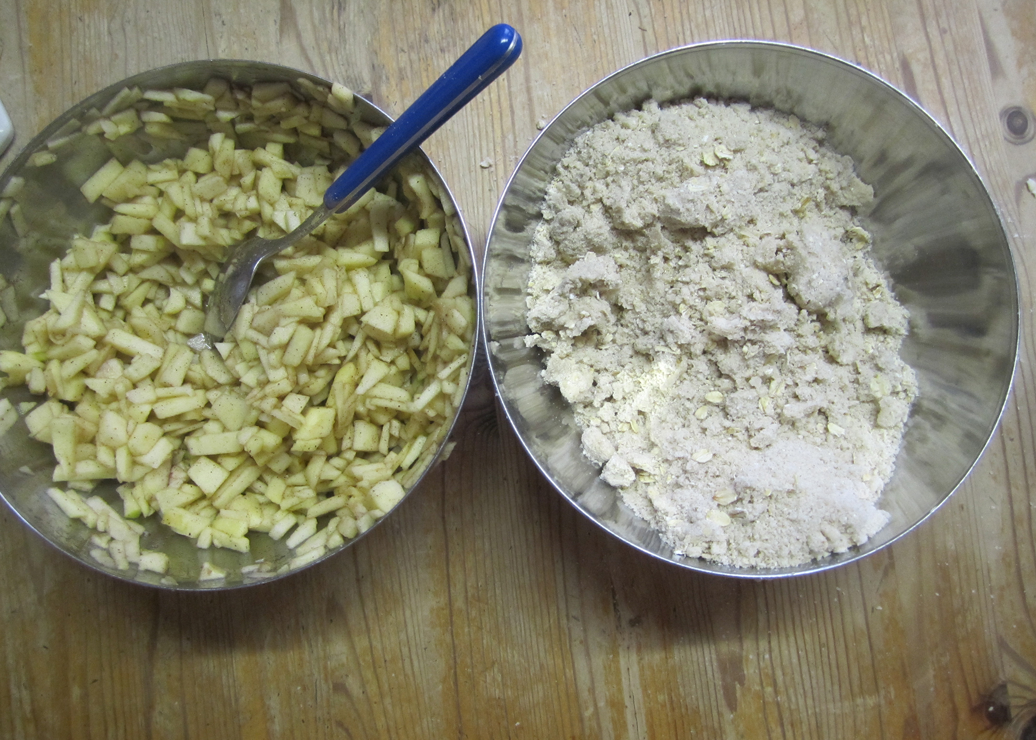 Als erstes wird die Apfelschicht vorbereitet. Dazu die Äpfel schälen, halbieren, entkernen, fein schneiden, und in eine kleine Schüssel geben. Zuerst mit dem Zitronensaft mischen und anschliessend Zucker, Zimt und Muskatnuss dazugeben und wiederum vermischen. Die Schüssel beiseite stellen.