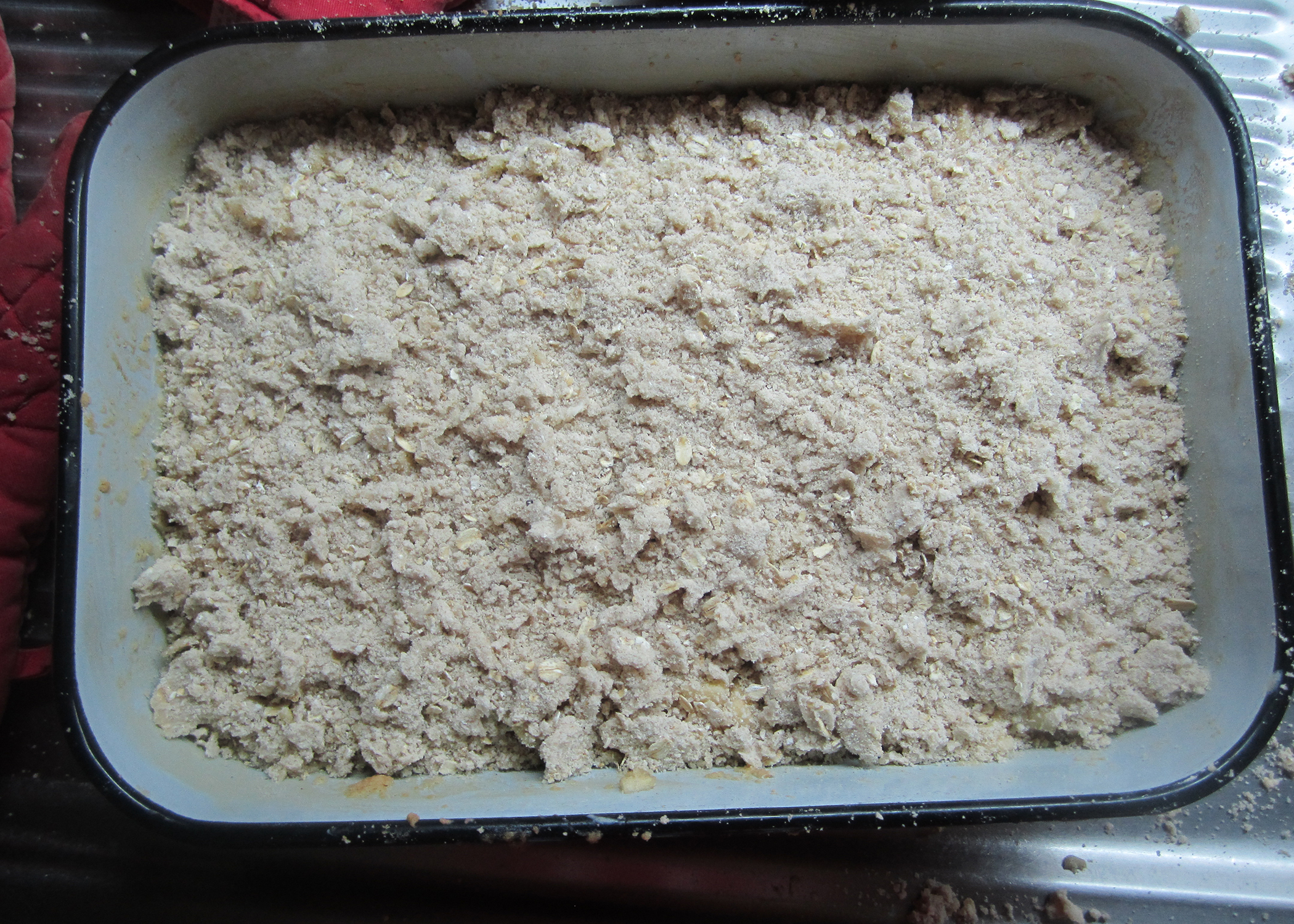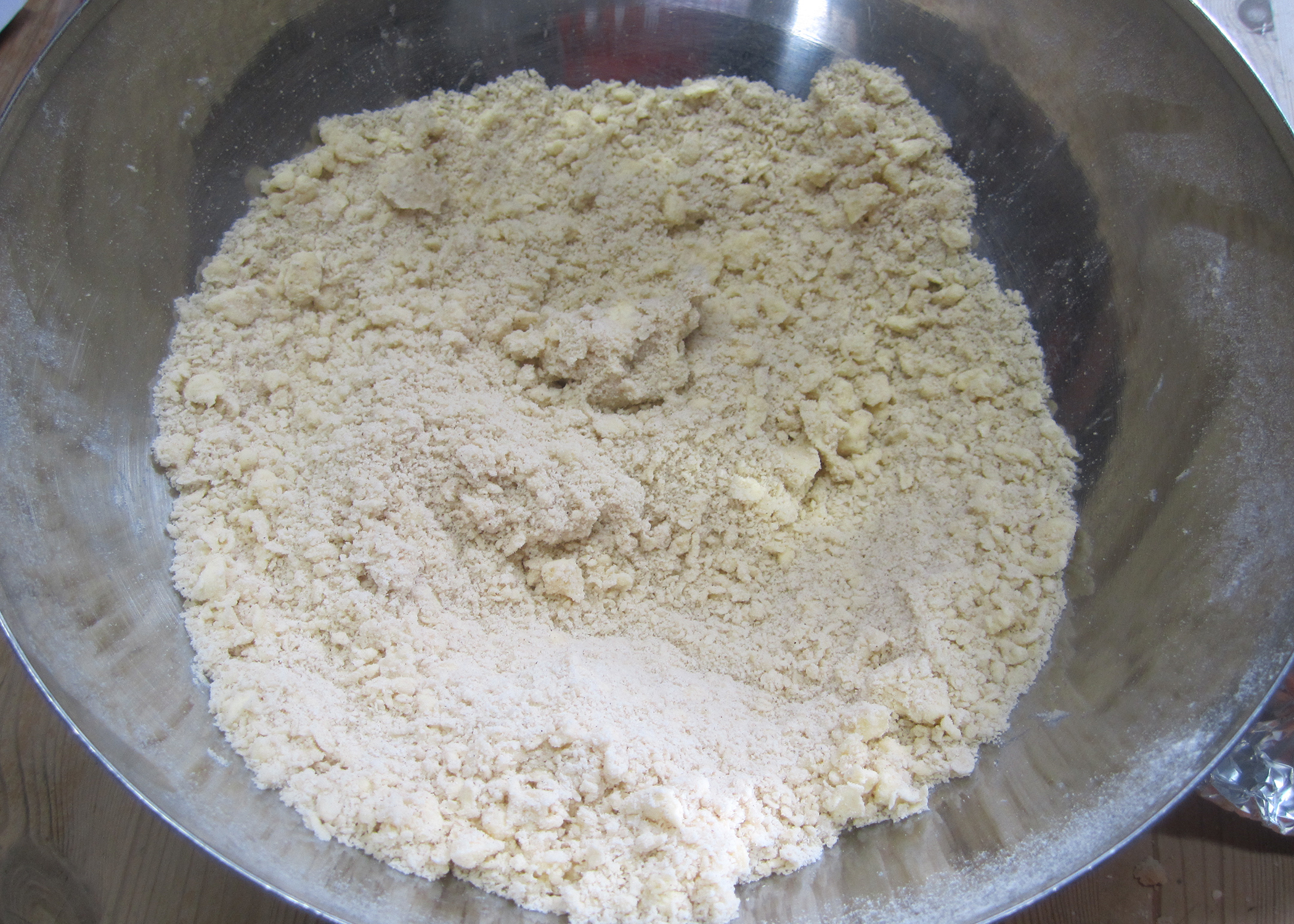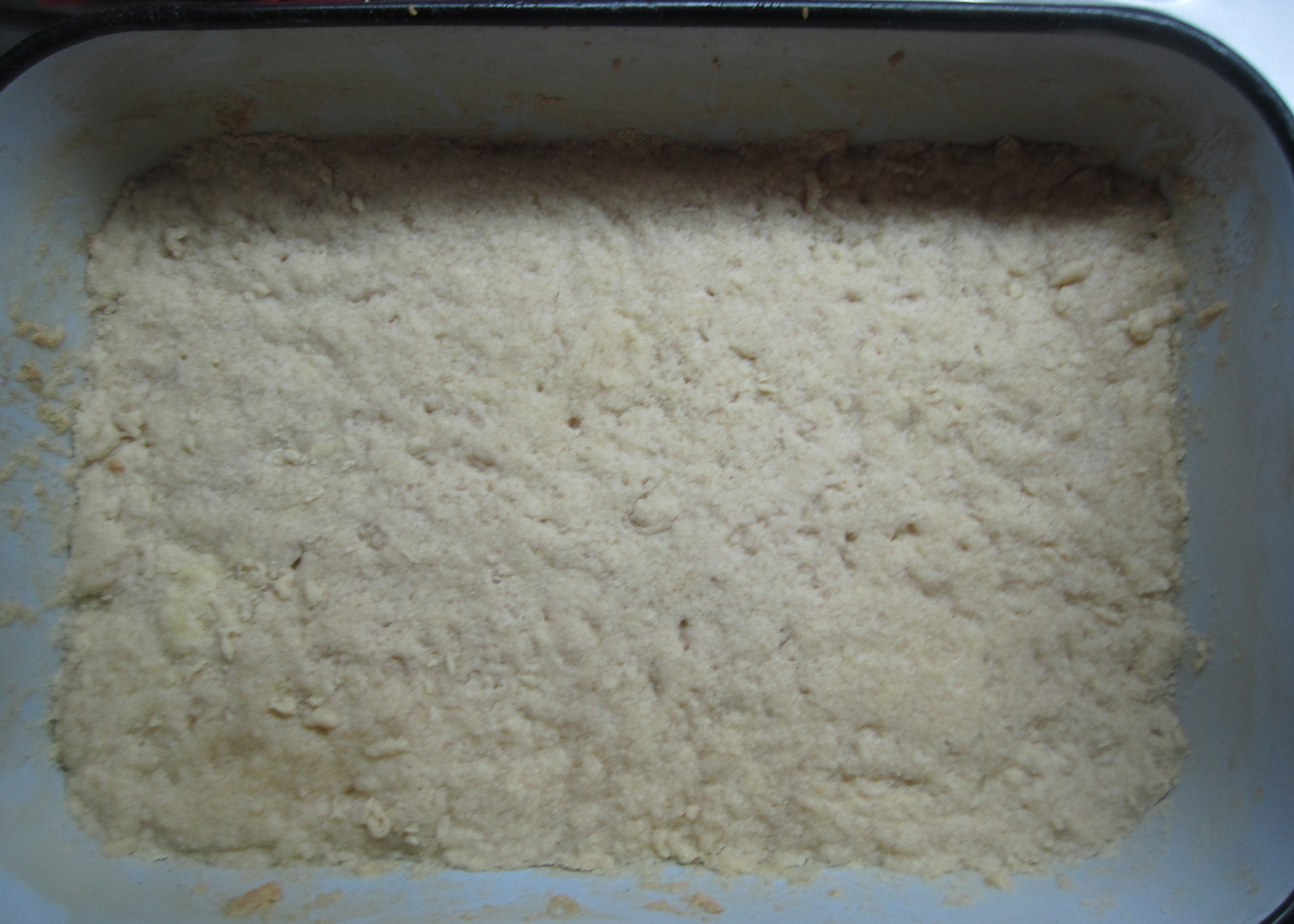 Nun geht es an den Teigboden. Dafür Mehl, brauner Zucker, Salz und Zimt in einer Schüssel vermischen. Die Butter in Stücken dazugeben mit den Händen mit der Mehlmischung verreiben. (So ensteht eine Art Mürbeteig). Diese Mischung in die vorbereitete Form verteilen und sehr gut andrücken. Den Teigboden für 10-15min backen, sodass er leicht braun wird.