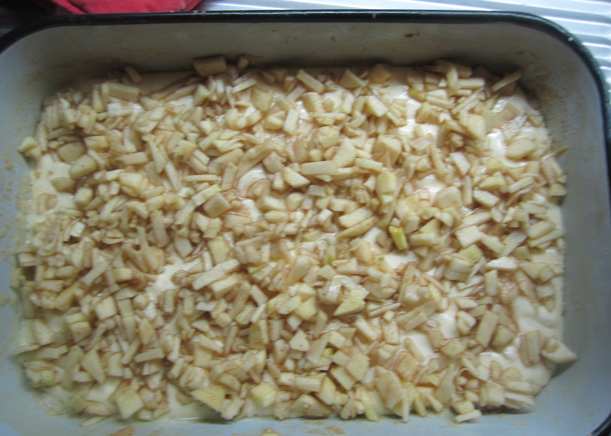 Die Cheesecake-Schicht auf dem vorgebackenen Teigboden verteilen. Anschliessend zuerst dieÄpfel und als letztes die Streusel darüber verteilen. Das Ganze für ca. 30min backen und vollständig auskühlen lassen.