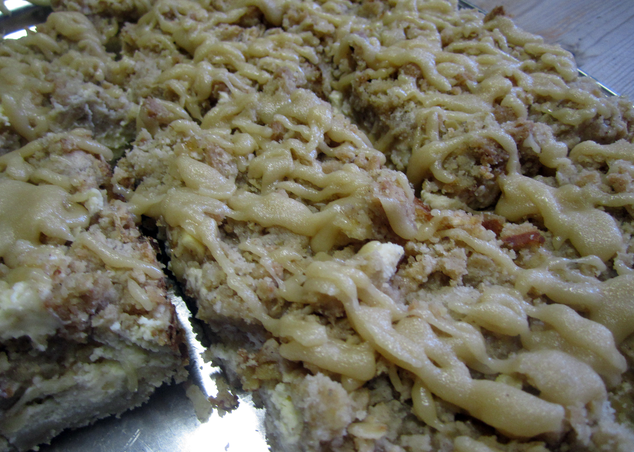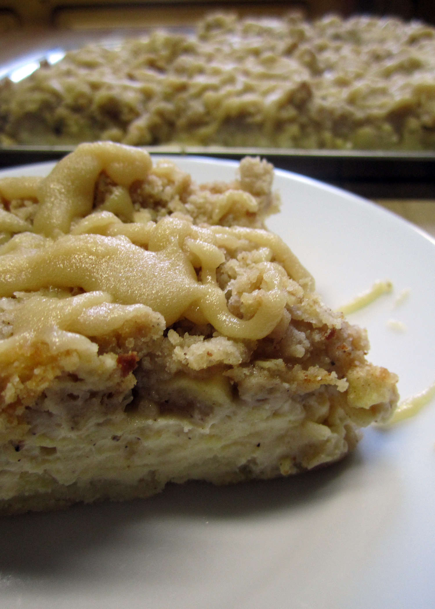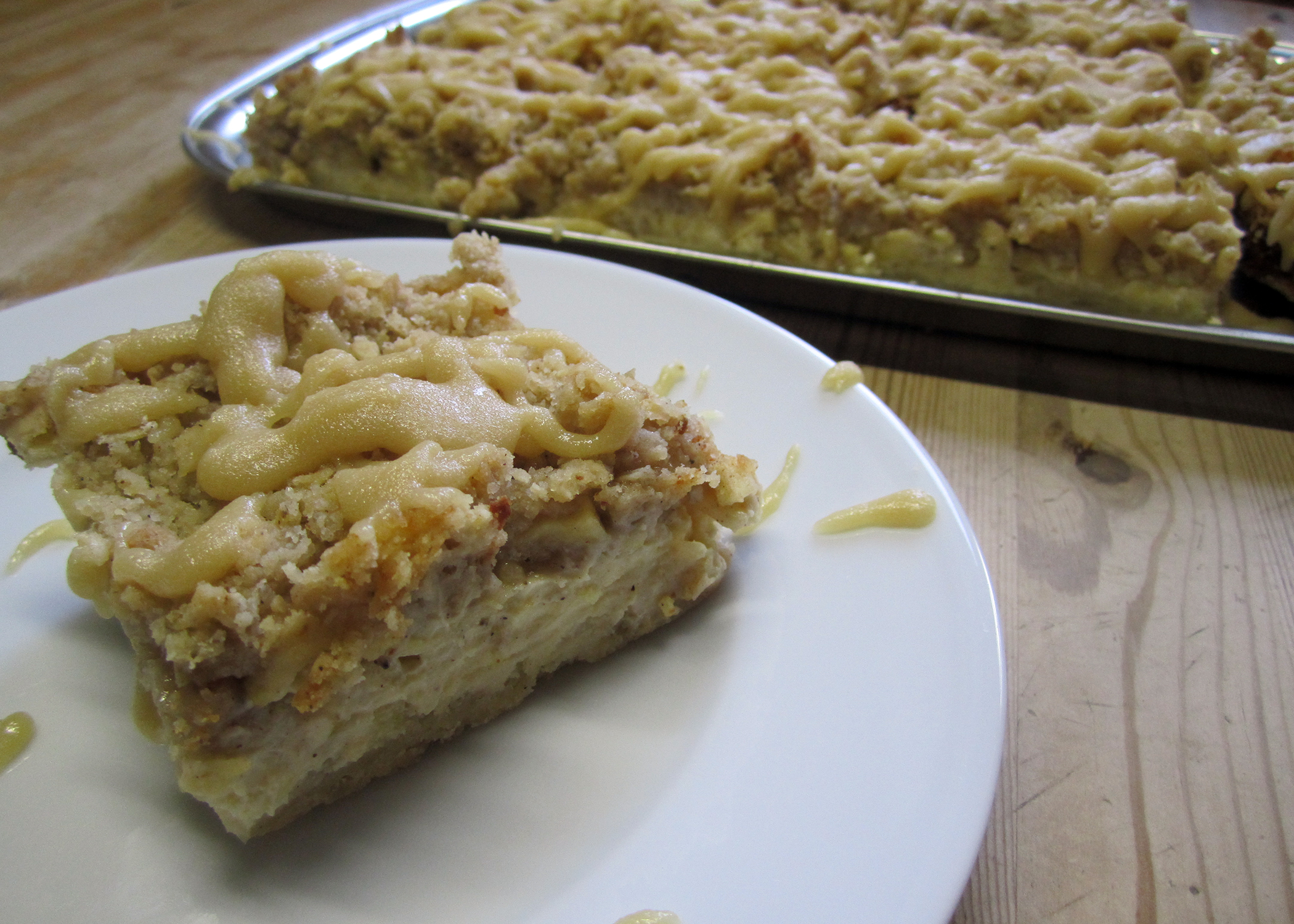 Wer kann da schon wiederstehen: Unten ein krustiger Teigboden, als nächstes eine erfrischende Cheesecake-Schicht, dann eine Apfel-Zimt-Mischung und oben drauf noch eine Schicht krümeliger Streusel. Und als ob das nicht schon genug Herausforderung für jeden Gaumen wäre; noch etwas Caramel-Sauce obendrauf. So viel Abwechslung in der Konsistenz und so viel Harmonie im Geschmack. Einfach toll!