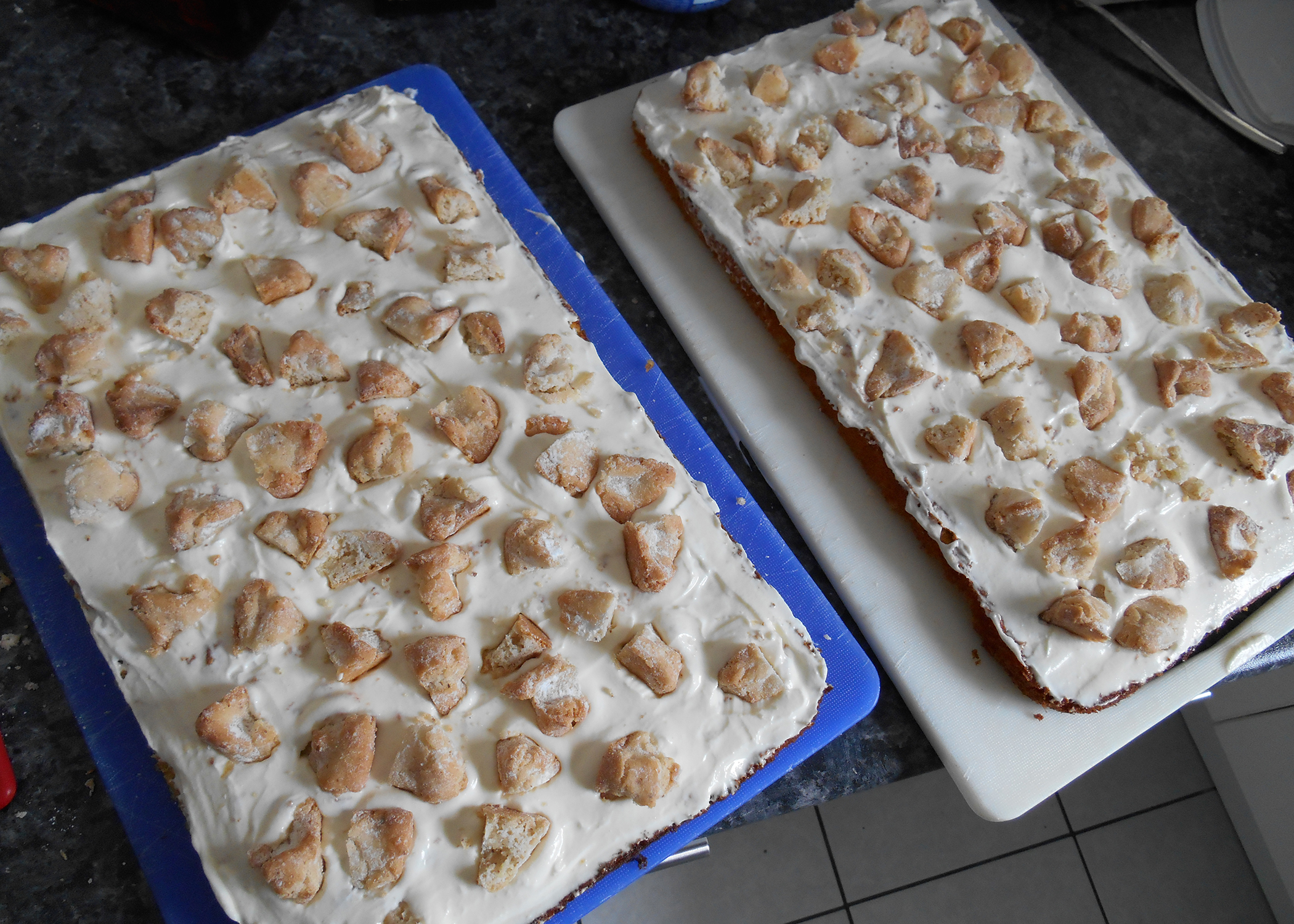Als nächstes ca. 1/3 der Quarkmischung auf die Beiden Böden gleichmässig verstreichen und die Amarettistücke darauf verteilen und leicht andrücken. Nun das ganze noch mit der übrigen Creme bedecken und für 2 Stunden in den Kühlschrank stellen.
