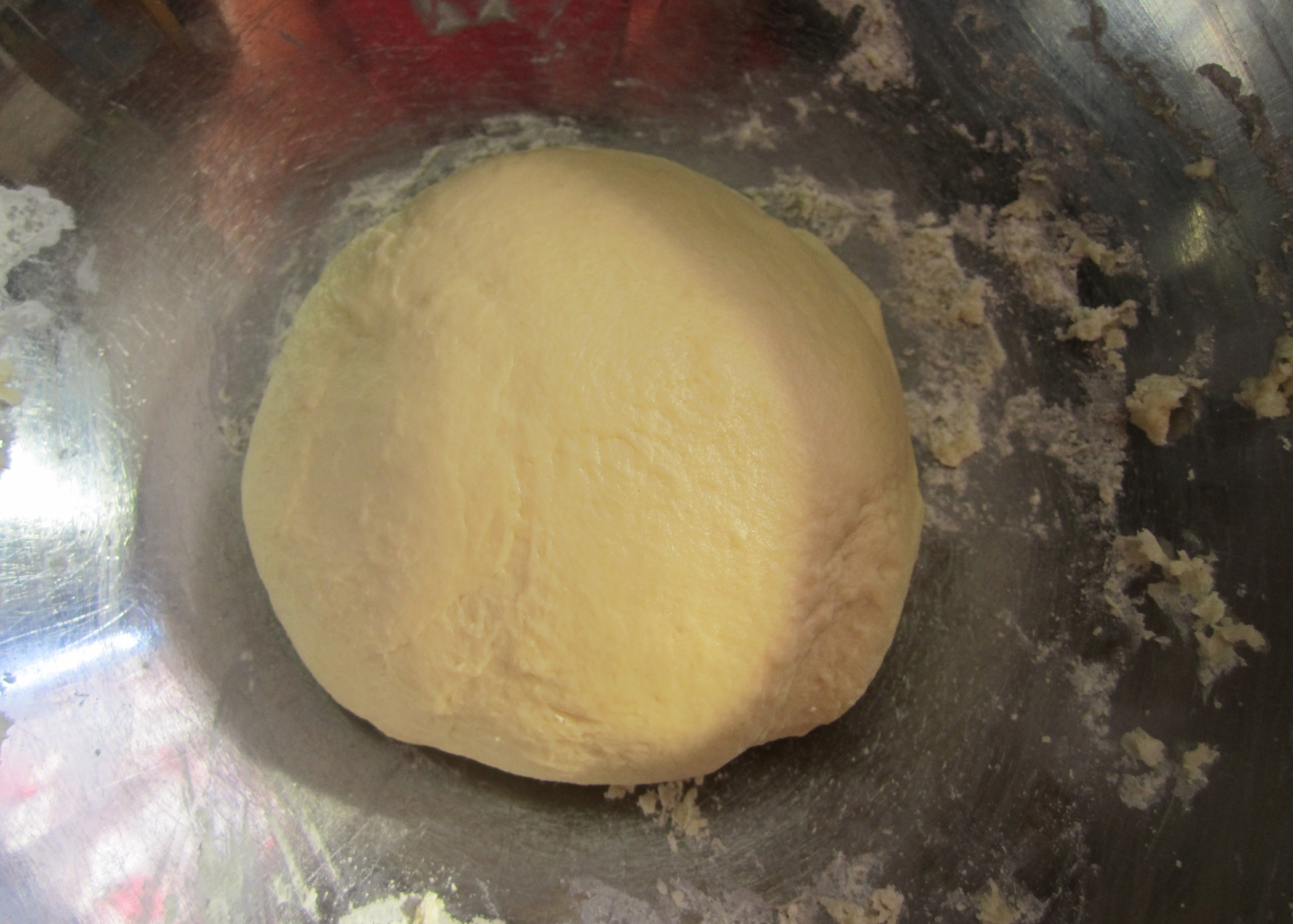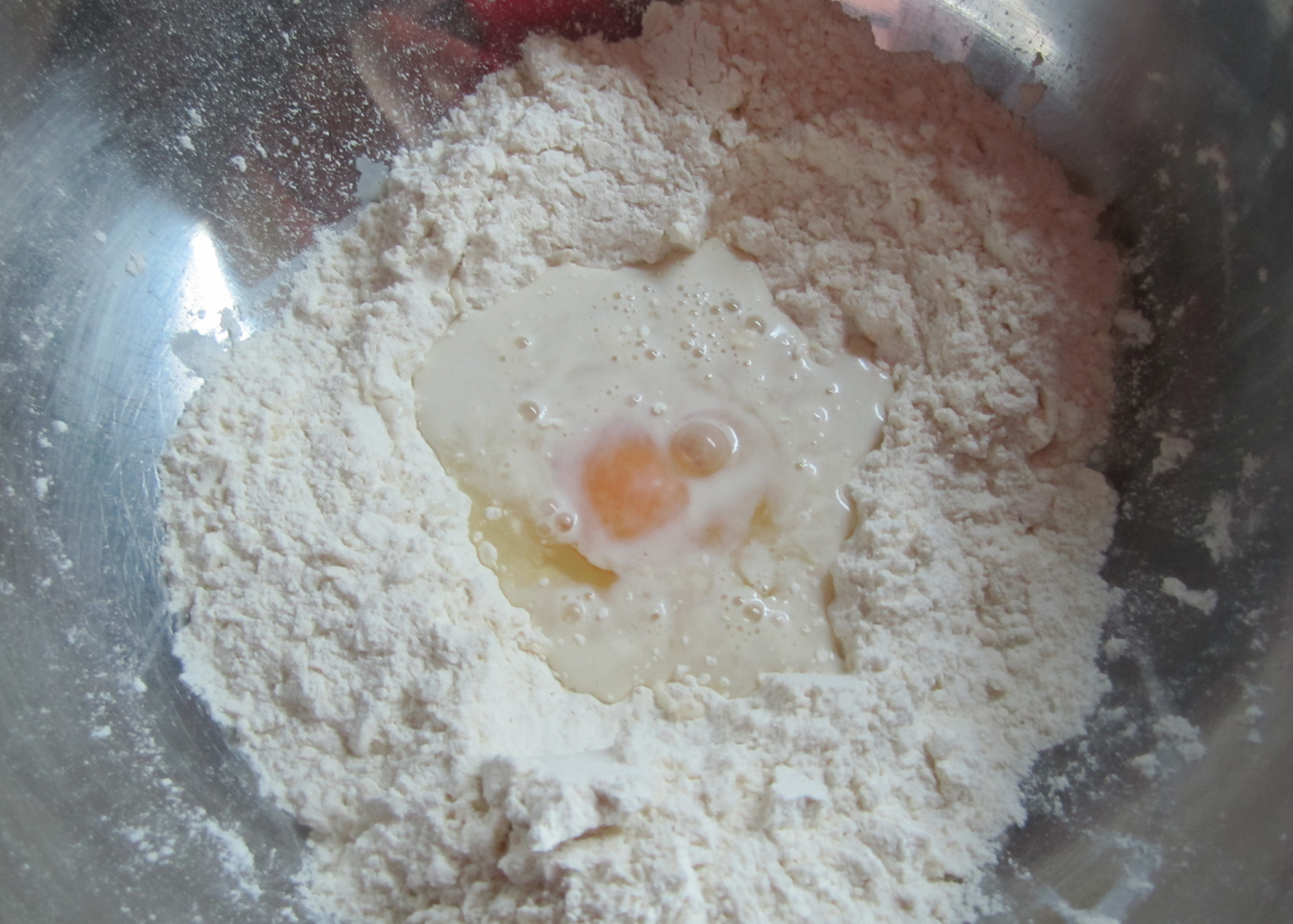 Jetzt die Hefe in der Milch auflösend und gemeinsam mit dem Ei in die Mulde geben. Den Teig nun von der Mitte aus anrühren und anschliessend sehr gut auf einer Arbeitsfläche kneten, bis er schön glatt ist. Wieder in die Schüssel legen und diese mit einem warmen, feuchten Tuch bedecken. Den Teig nun um das Doppelte aufgehen lassen.