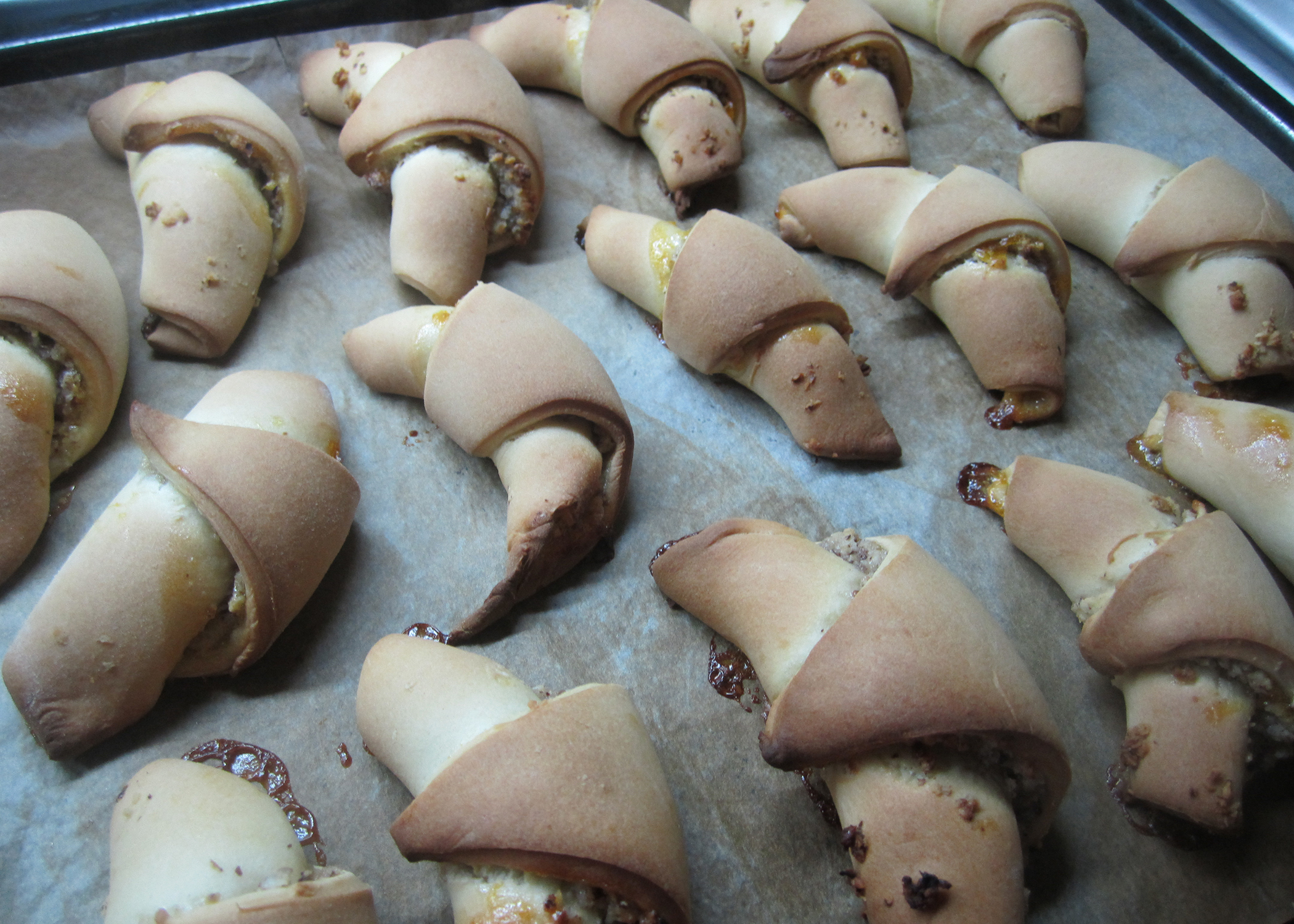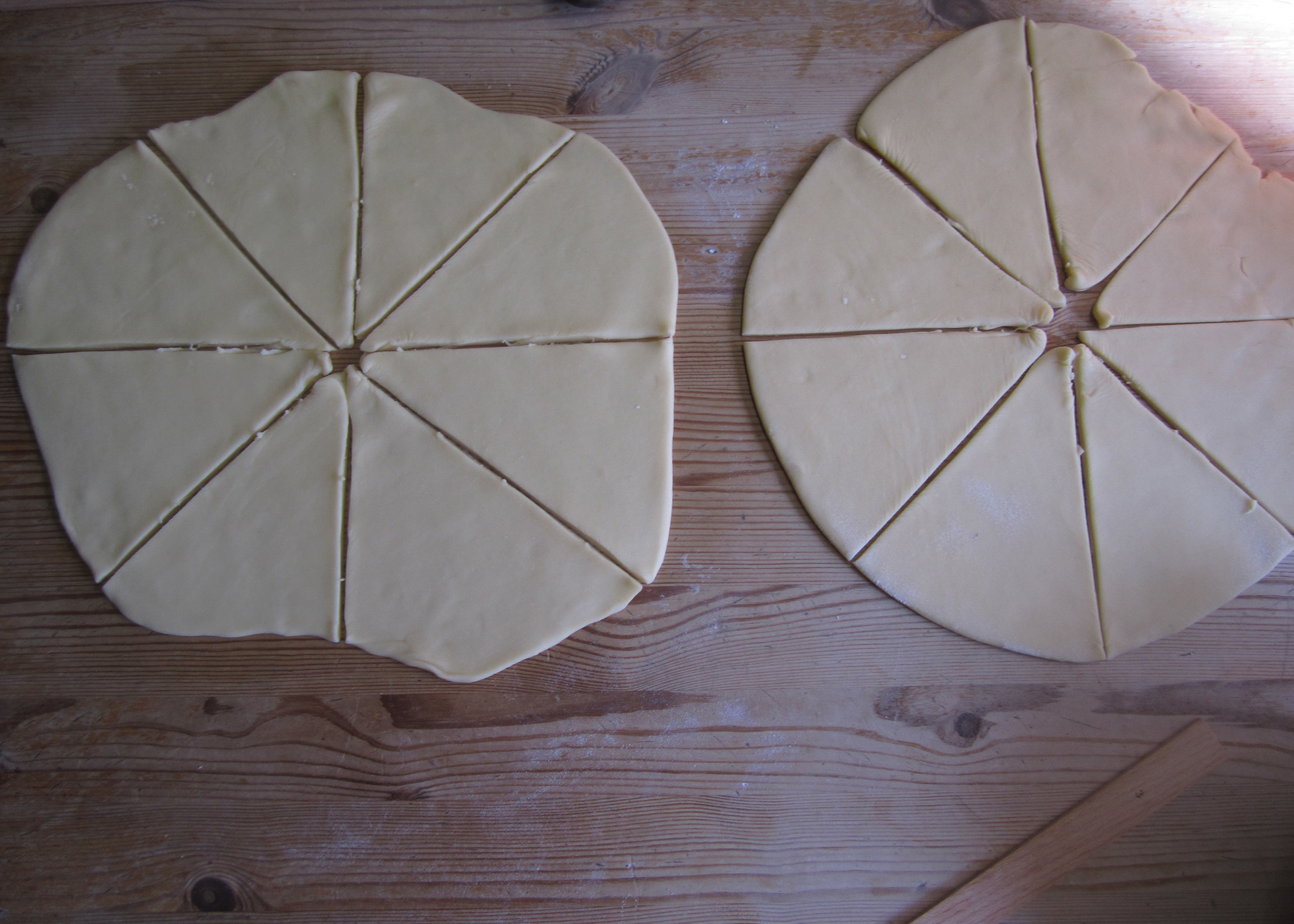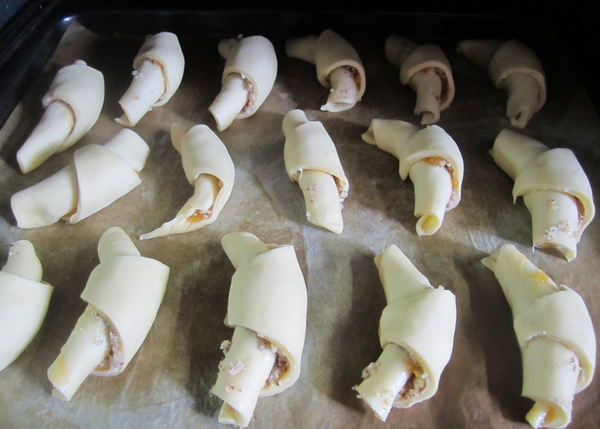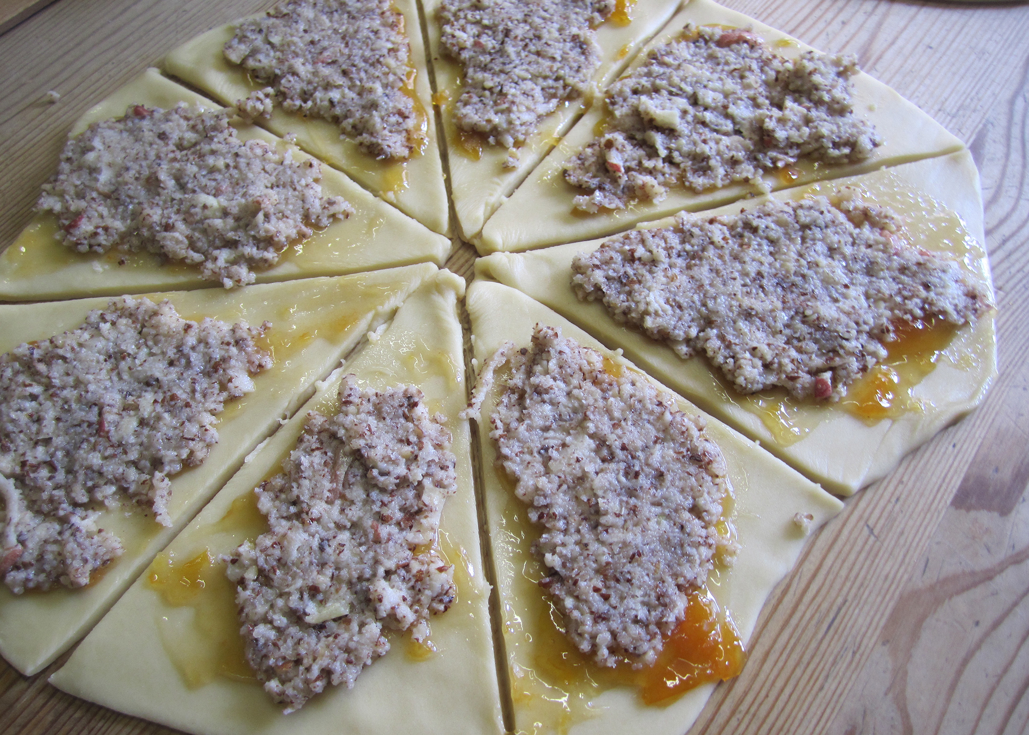 Den Backofen auf 180° C Umluft vorheizen und ein Blech mit Backpapier belegen. Nach dem Aufgehen den Teig halbieren und beide Hälften 3mm dick rund auswallen. Jede Hälfte in acht Stücke schneiden und die Aprikosenkonfitüre darauf verteilen. Als nächstes die Füllung gleichmässig auf die Stücke verteilen (nicht bis an den Rand). Jedes Stück von der runden, breiten Seite hin zur Spitze aufrollen. Die Nussgipfel leicht gebogen auf das vorbereitete Blech legen und 15-20min goldbraun backen.