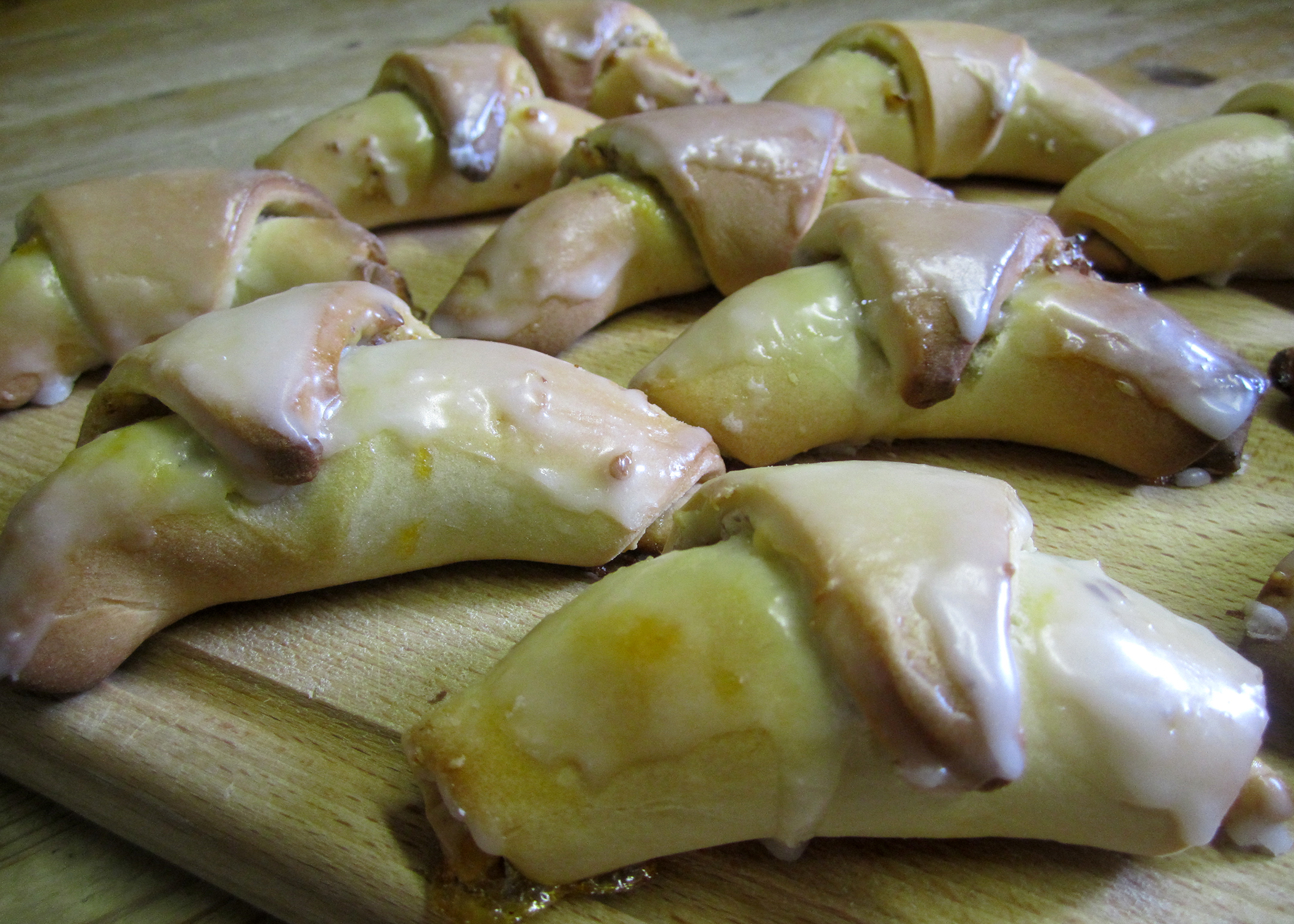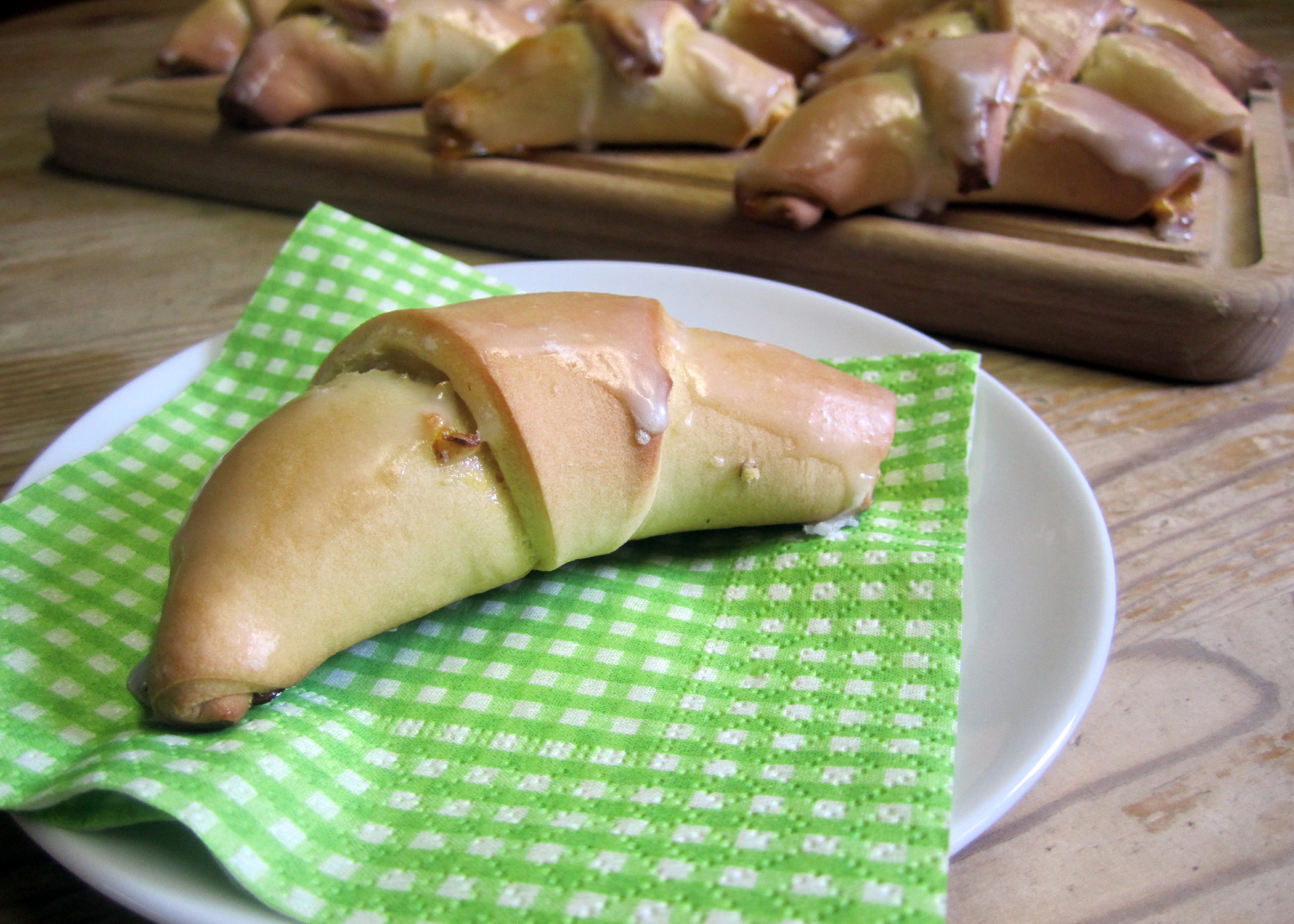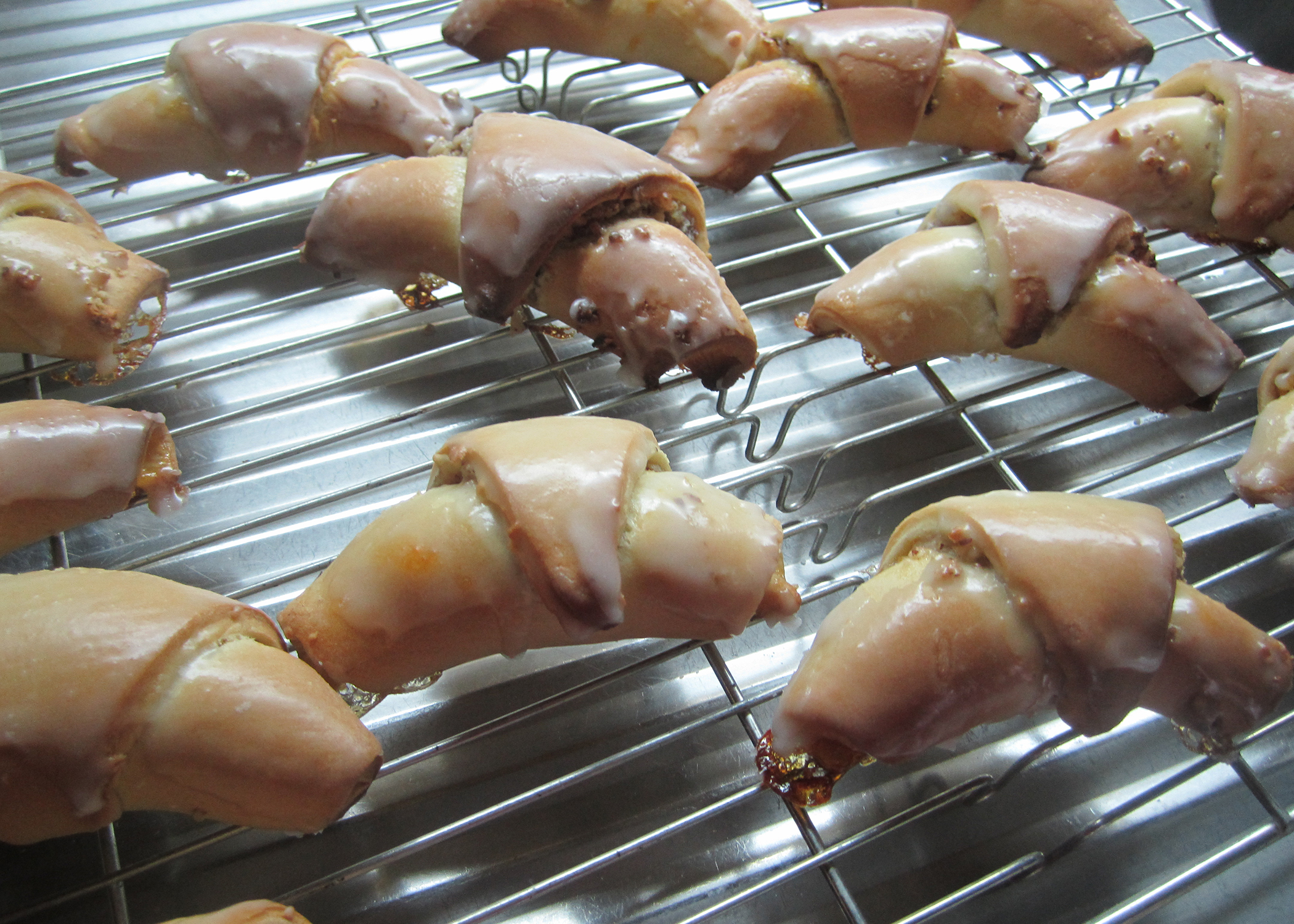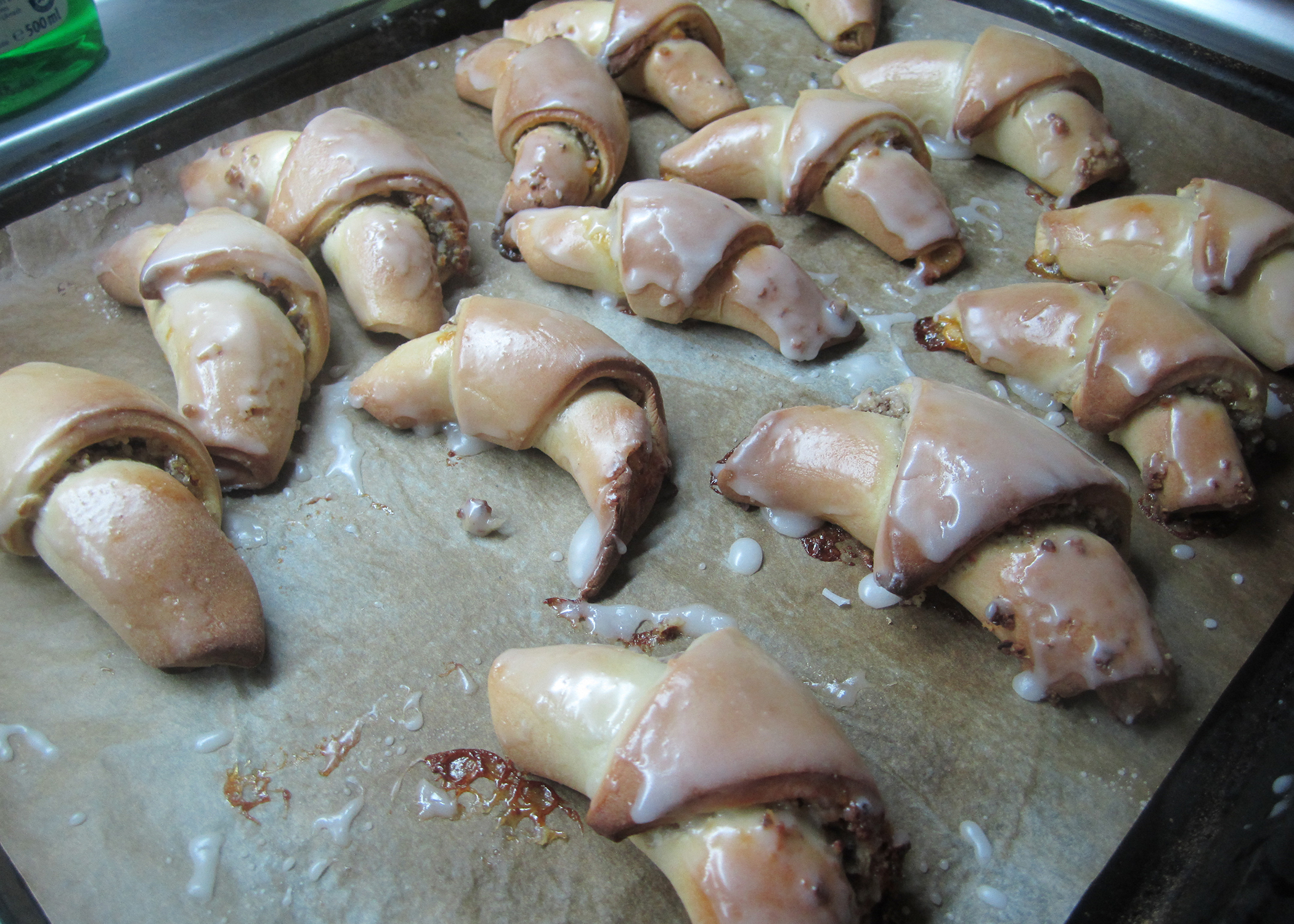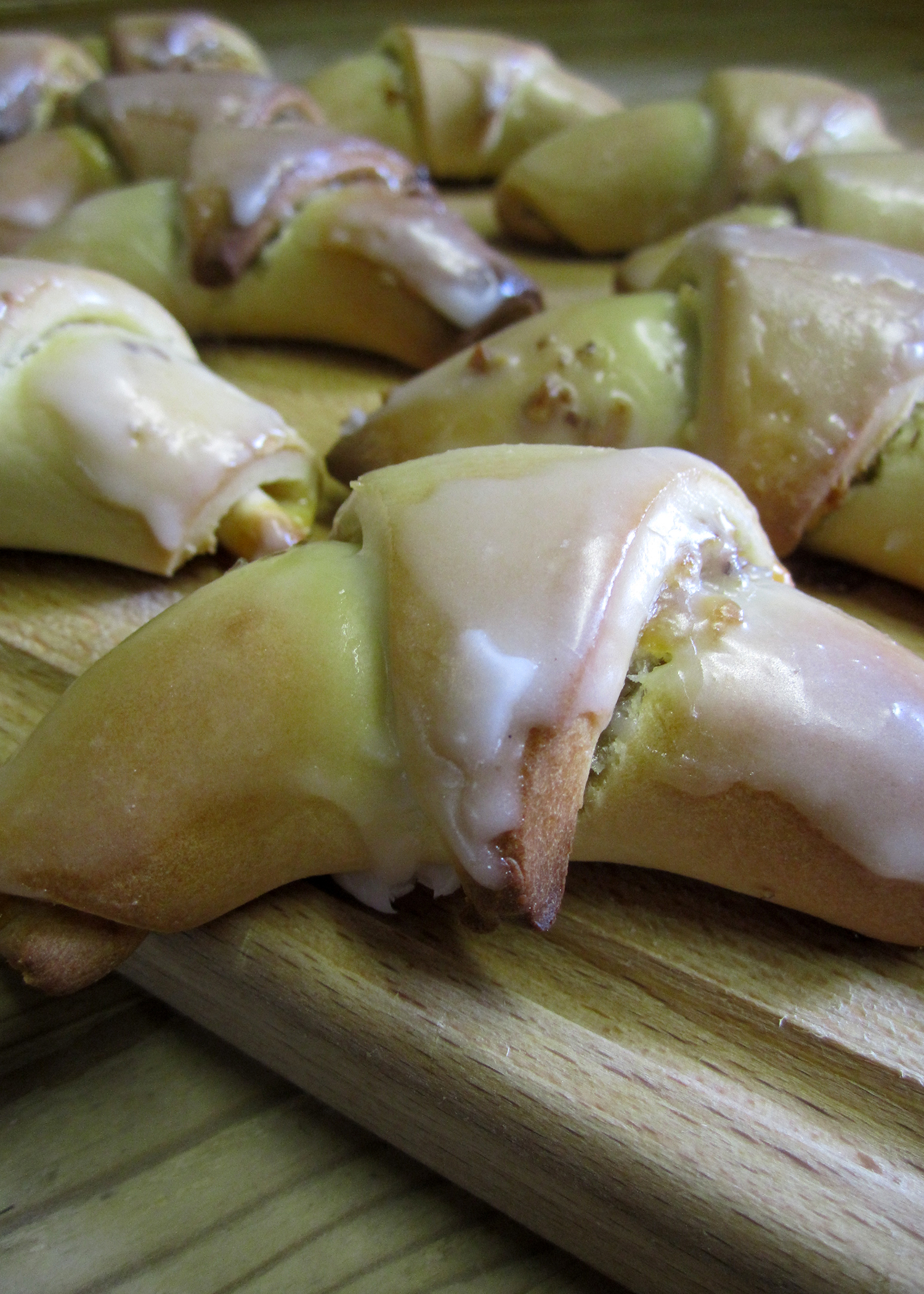 Nach dem Backen Puderzucker, Zitronensaft und Wasser verrühren. Die noch heissen Nussgipfel mit einem Pinsel mit Glasur bestreichen und auf einem Gitter auskühlen lassen.