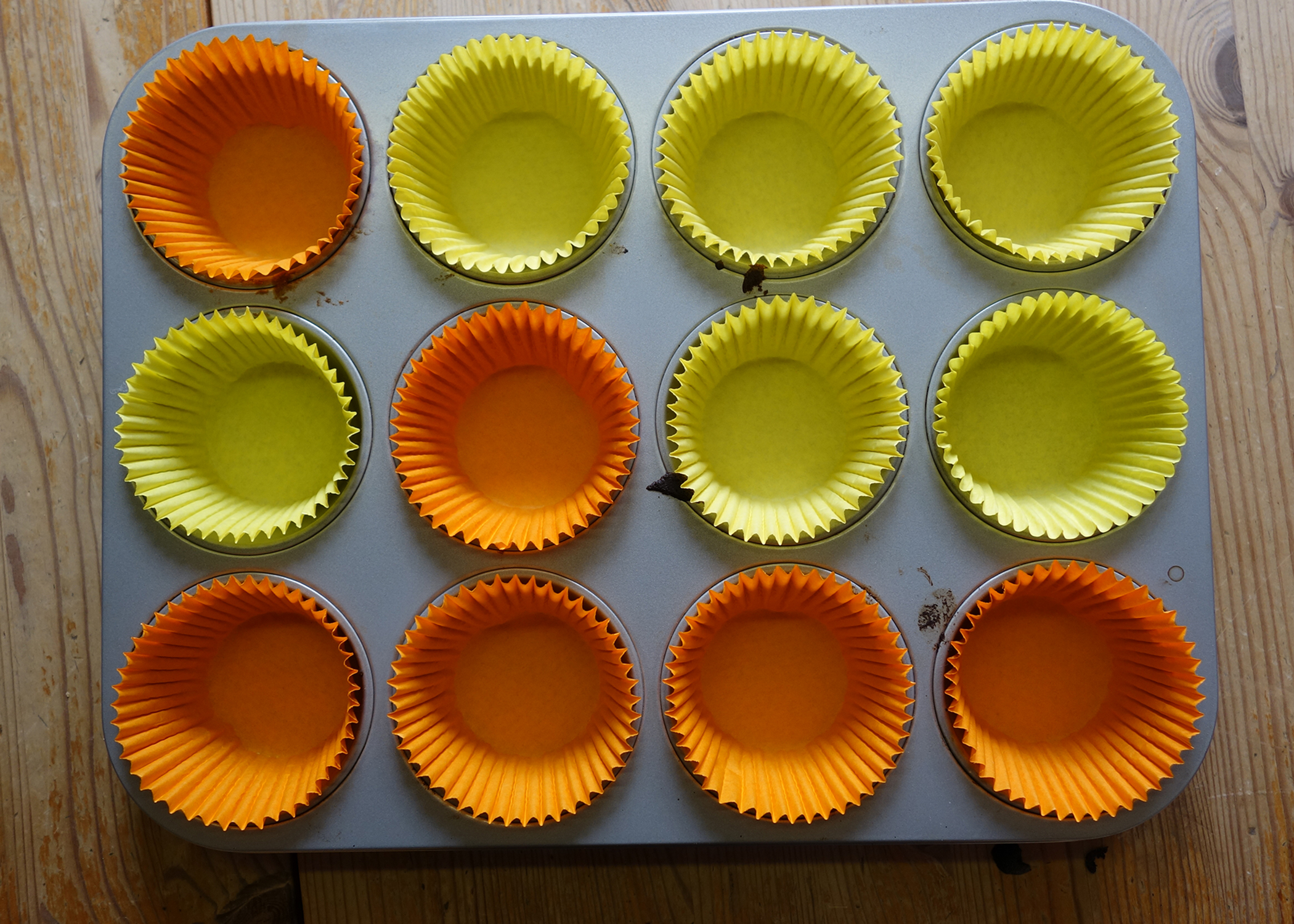 Den Ofen auf 190-200° C Umluft vorheizen und ein Muffinblech mit Papierförmchen auslegen.