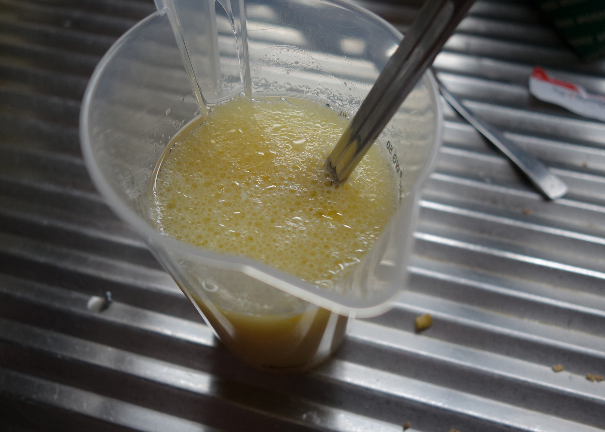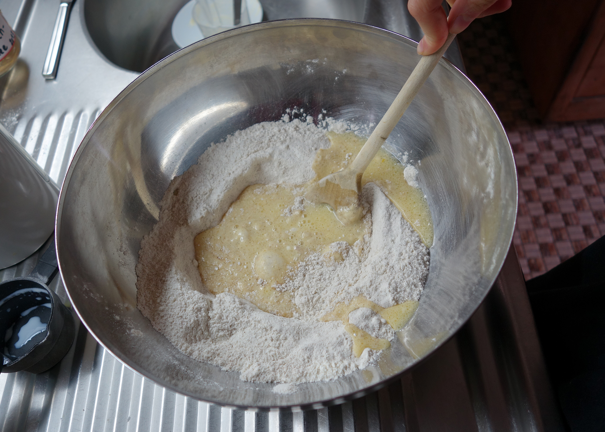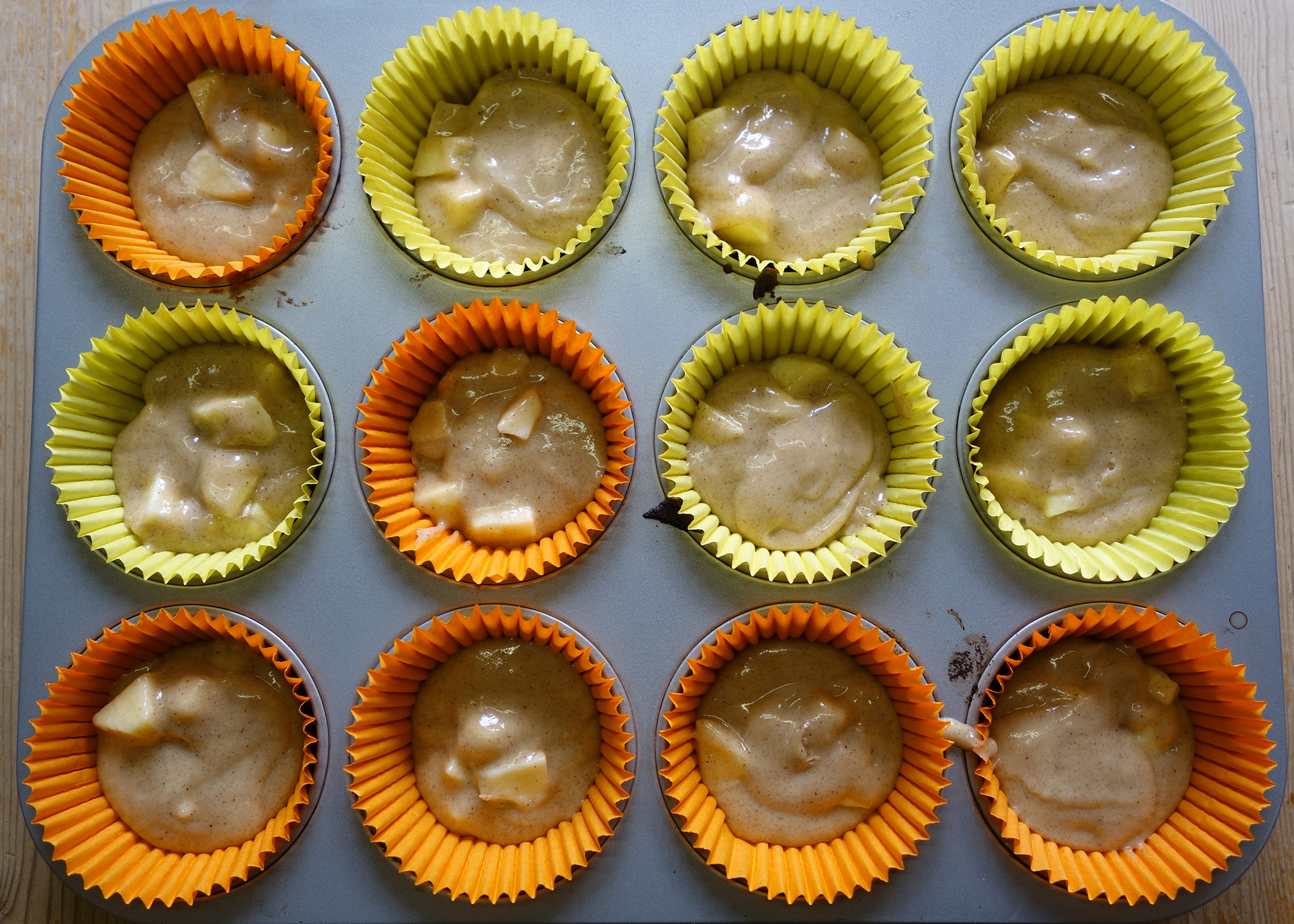 Anschliessend das Ei mit dem Öl und der Milch verrühren. Die Flüssigkeit in die Mulde giessen und von der Mitte aus ohne Mixer verrühren, damit ein gleichmässiger Teig entsteht. Als letztes ca. 120g der Apfelstücke unter die Masse mischen und diese auf die Förmchen verteilen.