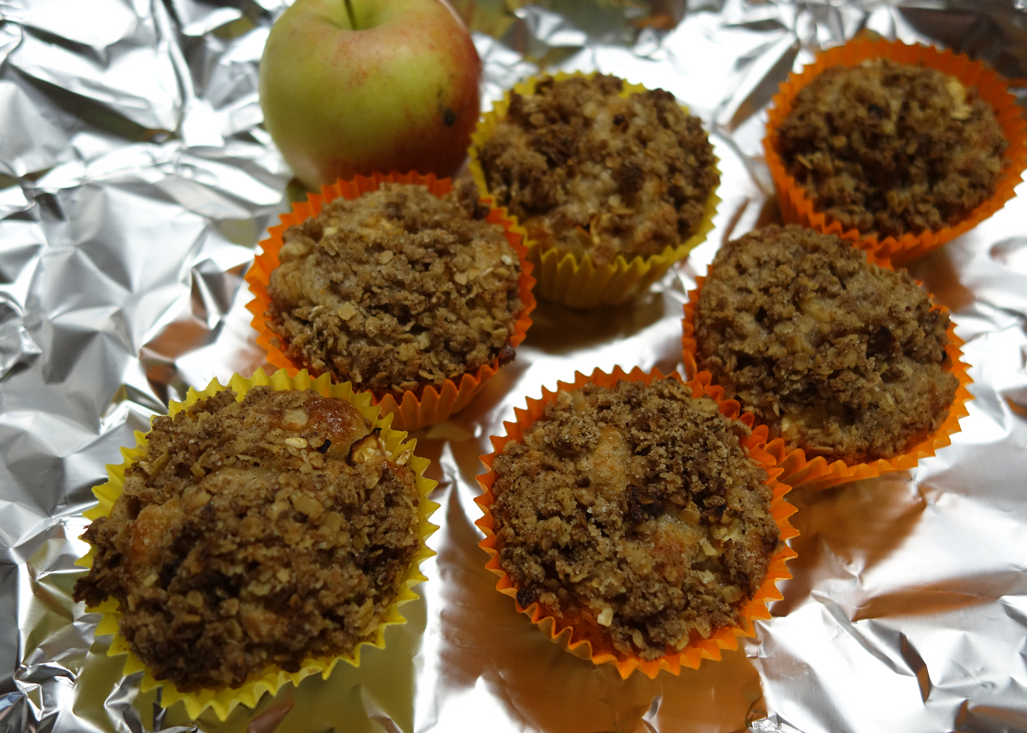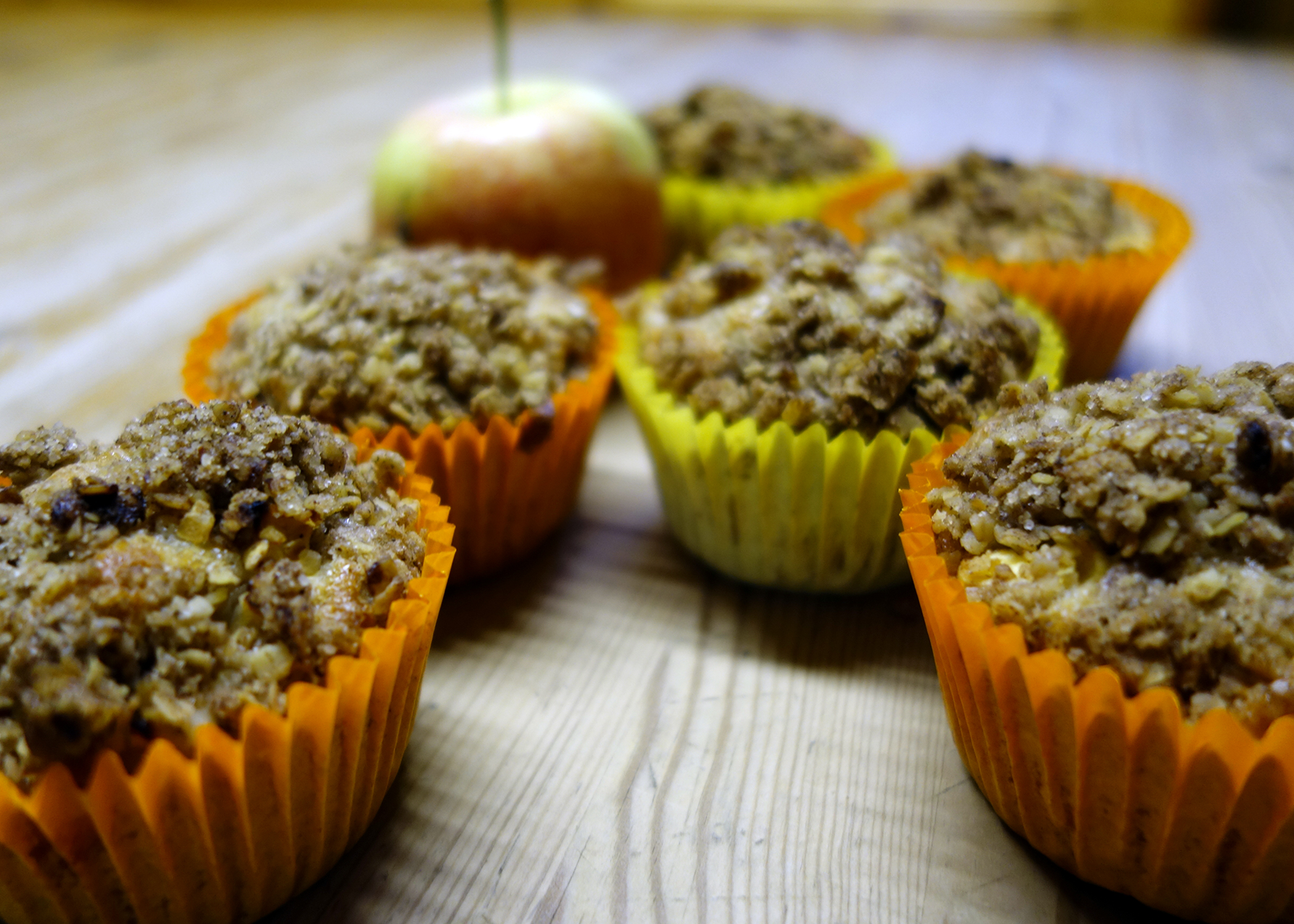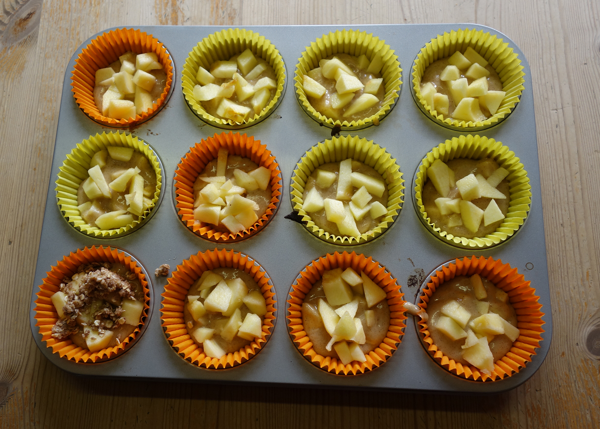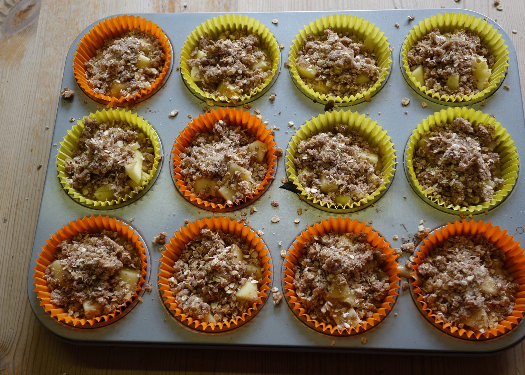 Dann zuerst die Apfelstücke und dann die Streusel auf die Förmchen Verteilen. Die Muffins während 20-25min backen und auskühlen lassen.