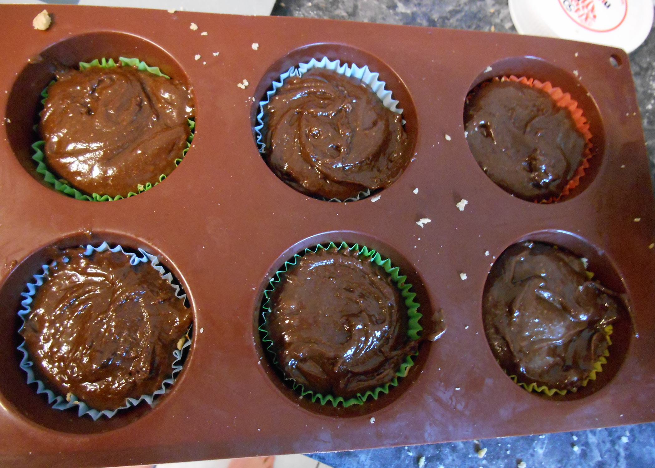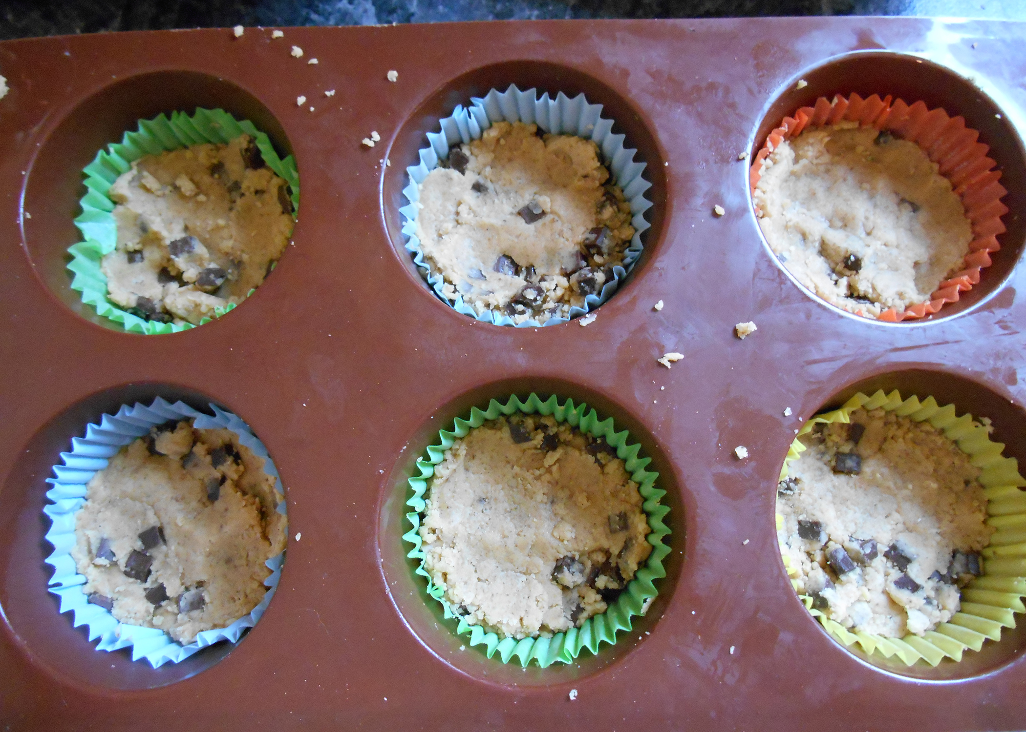 Anschliessend Mehl, Salz, Backpulver und Zimtpulver unterheben. Dann noch die letzte Zutat für den Cookieboden, die Schokoladenwürfel, unterrühren. Jetzt die Muffinmulden mit Förmchen auslegen und den Backofen auf 180°C Umluft vorheizen. Die Cookiemasse auf die Förmchen verteilen und mit einem Löffel andrücken.