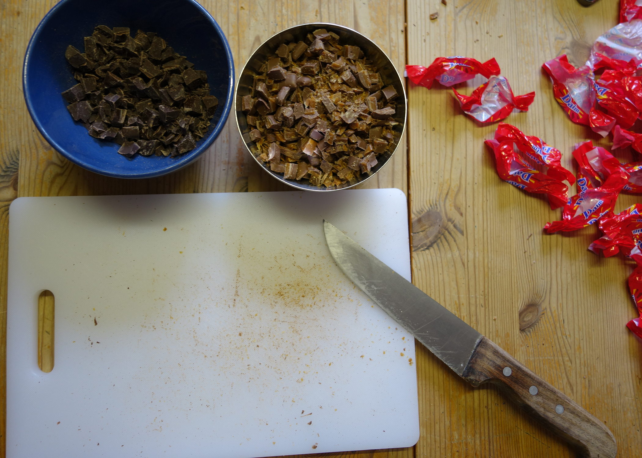 Für die Brownie-Schicht den Backofen auf 150°C Umluft vorheizen und eine Springform ø26cm gut mit Backpapier auslegen, einfetten und bemehlen. Die Butter schmelzen und etwas abkühlen lassen. Währenddessen die Schokolade und Daims separat grob hacken und in zwei kleinen Schüsseln beiseite stellen.