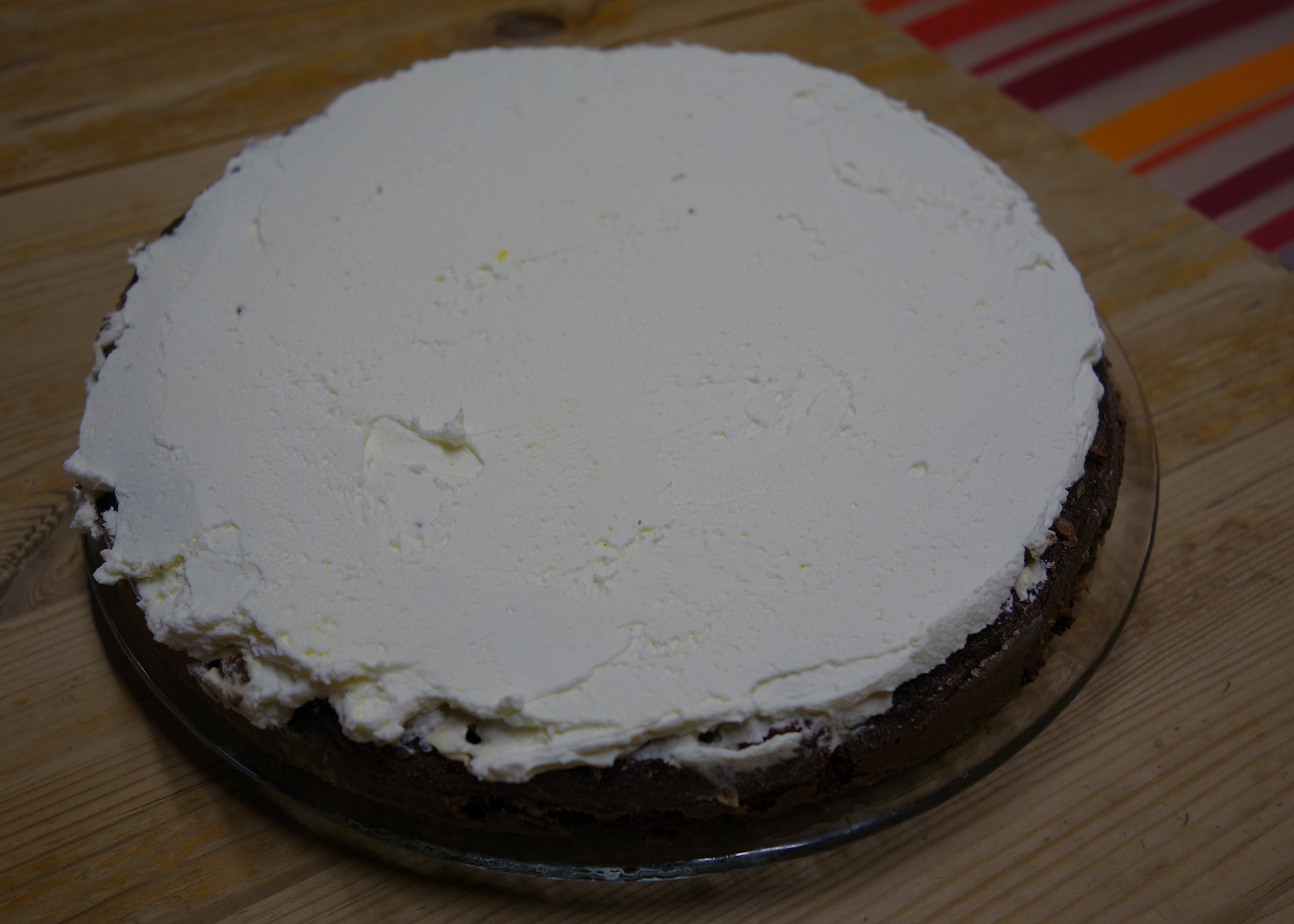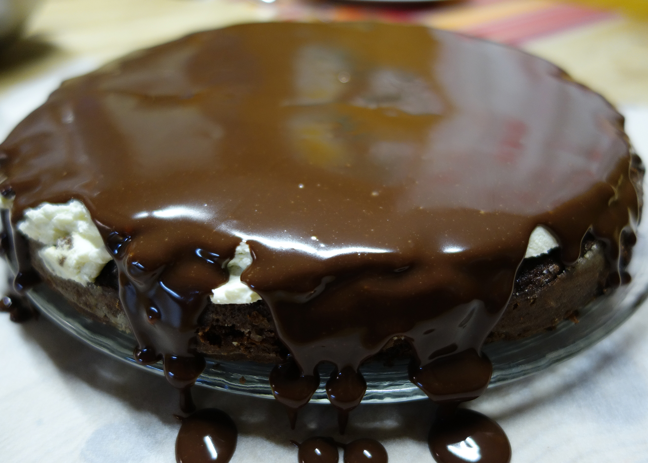 Die Torte ist ziemlich einfach zu machen, benötigt jedoch etwas Zeit: Zuerst wird die Brownieschicht zubereitet, welche vollständig auskühlen muss. Danach wird geschlagener Rahm darauf gestrichen und die Torte muss wiederum kühl gestellt werden. Zum Schluss folgt noch der Guss und natürlich wiederum Kühlstellen. Die Arbeitsschritte sind jedoch nicht kompliziert und es können relativ viele Mäuler damit gefüttert werden, weil bereits ein kleines Stück sehr sättigend ist. Und so nahmen zwei Jahre anstrengender Wirtschaft und Rechts-Unterricht ein wunderbar süsses Ende…