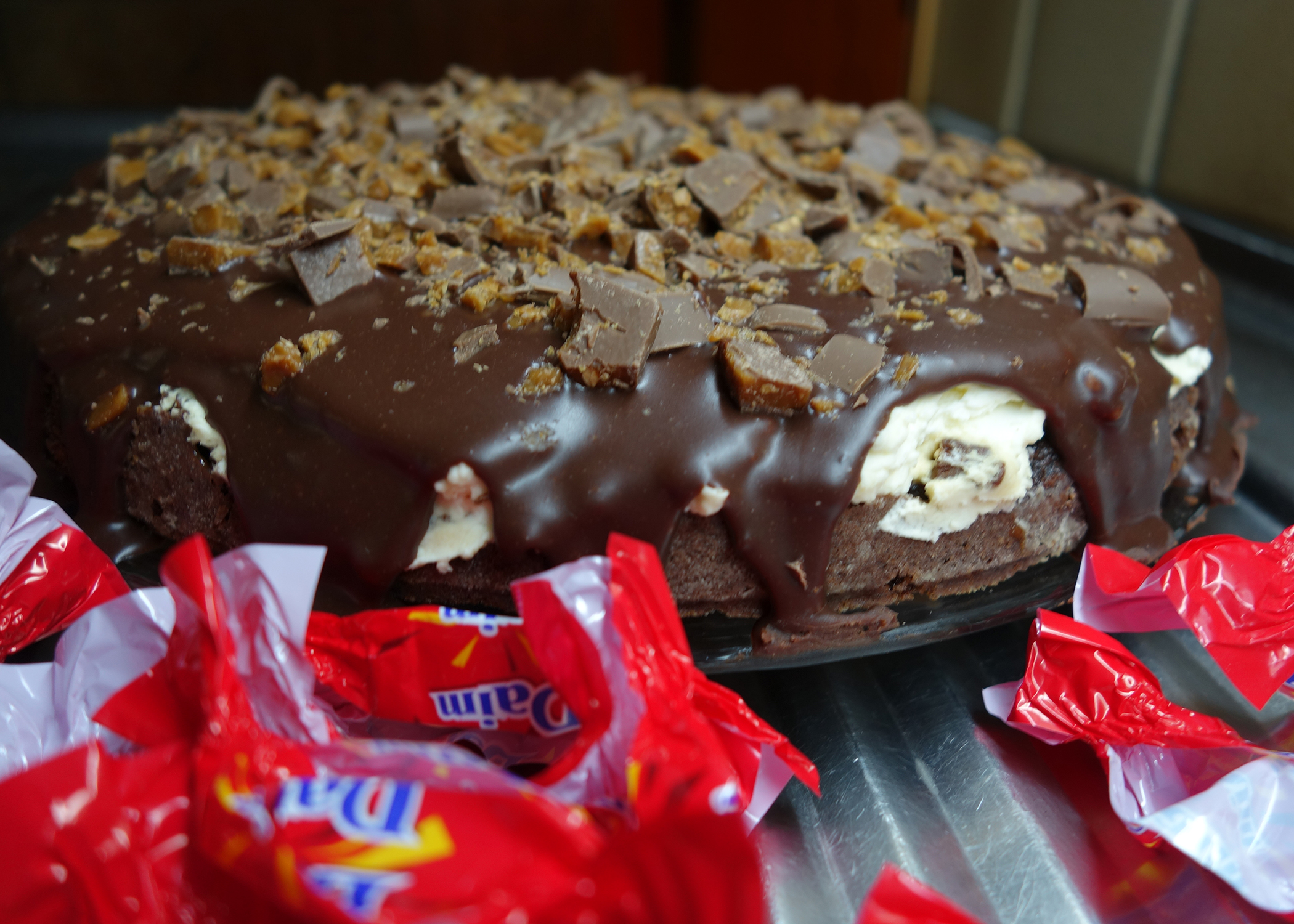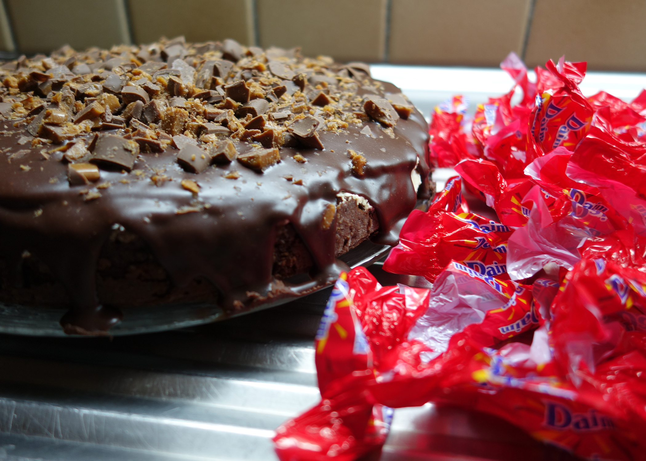 Das Mehl, brauner Zucker, Kakaopulver, Backpulver, Vanillezucker und Salz in einer grossen Schüssel vermischen. Die Eier während 7min sehr schaumig schlagen, sodass die Masse hell und luftig ist. Anschliessend die Mehlmischung unterrühren. Zum Schluss zuerst die Crème Fraîche unterrühren und die gehackte Schokolade unterheben. Den Teig in die vorbereitete Form streichen und für 9min backen. Nach diesen 9min ca. 70g der Daims daraufstreuen und für weitere 15-20min backen. Anschliessend vollständig auskühlen lassen und auf eine Tortenplatte legen.