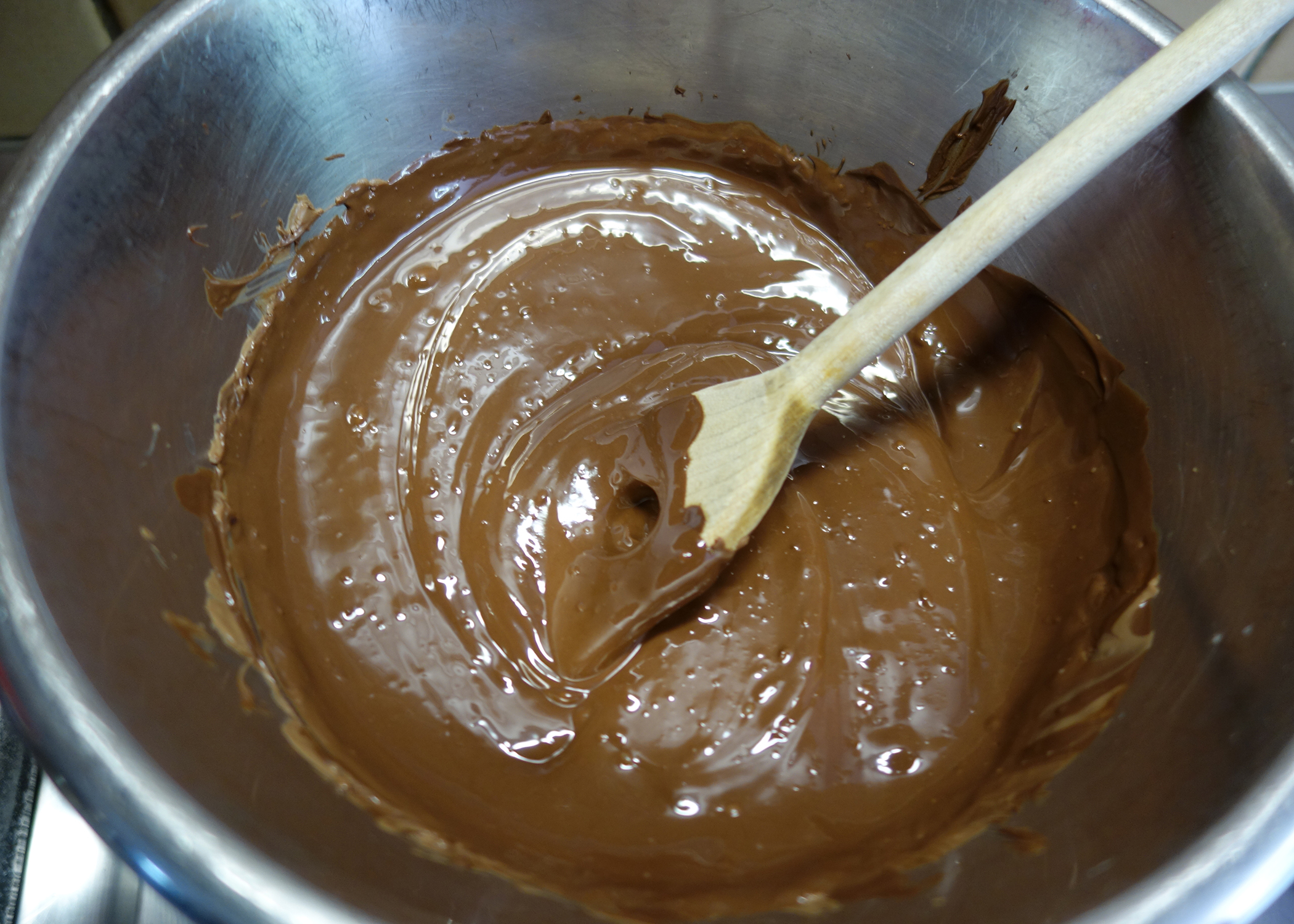 Als erstes die dunkle Schokolade und die Milchschokolade grob hacken und im Wasserbad schmelzen. Die Eier in einer kleinen Schüssel verklopfen und das Incarom-Pulver unterrühren.