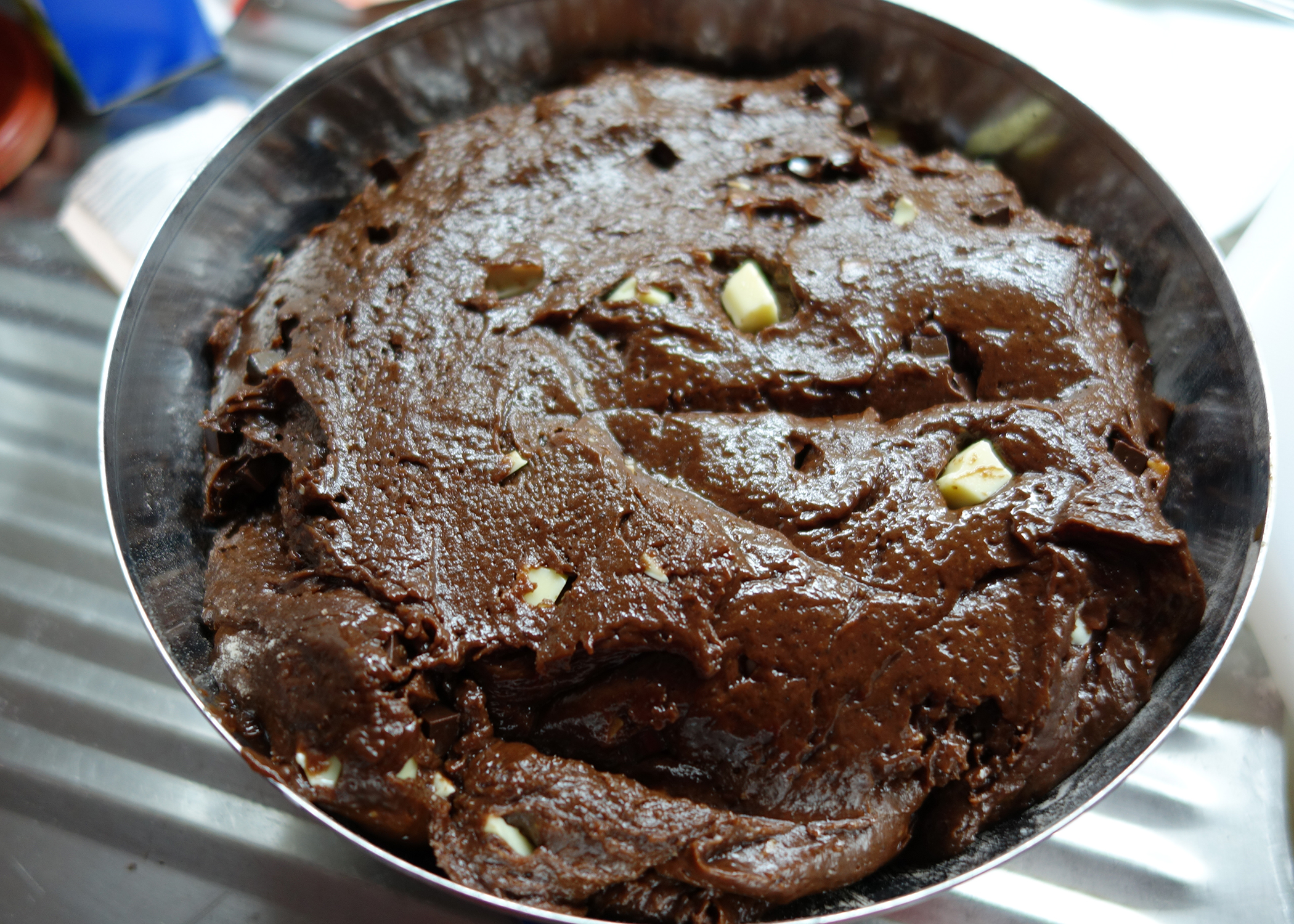 Als nächstes das Mehl mit dem Schokoladenpulver, Backpulver und Salz vermischen. Zuerst die geschmolzene Schokolade und im Anschluss die Mehlmischung unter die Masse rühren. Zum Schluss die weisse Schokolade hacken und gemeinsam mit den Schokoladen- und Caramelwürfel unter die Masse rühren. Den Teig für mindestens eine Stunde kühl stellen.