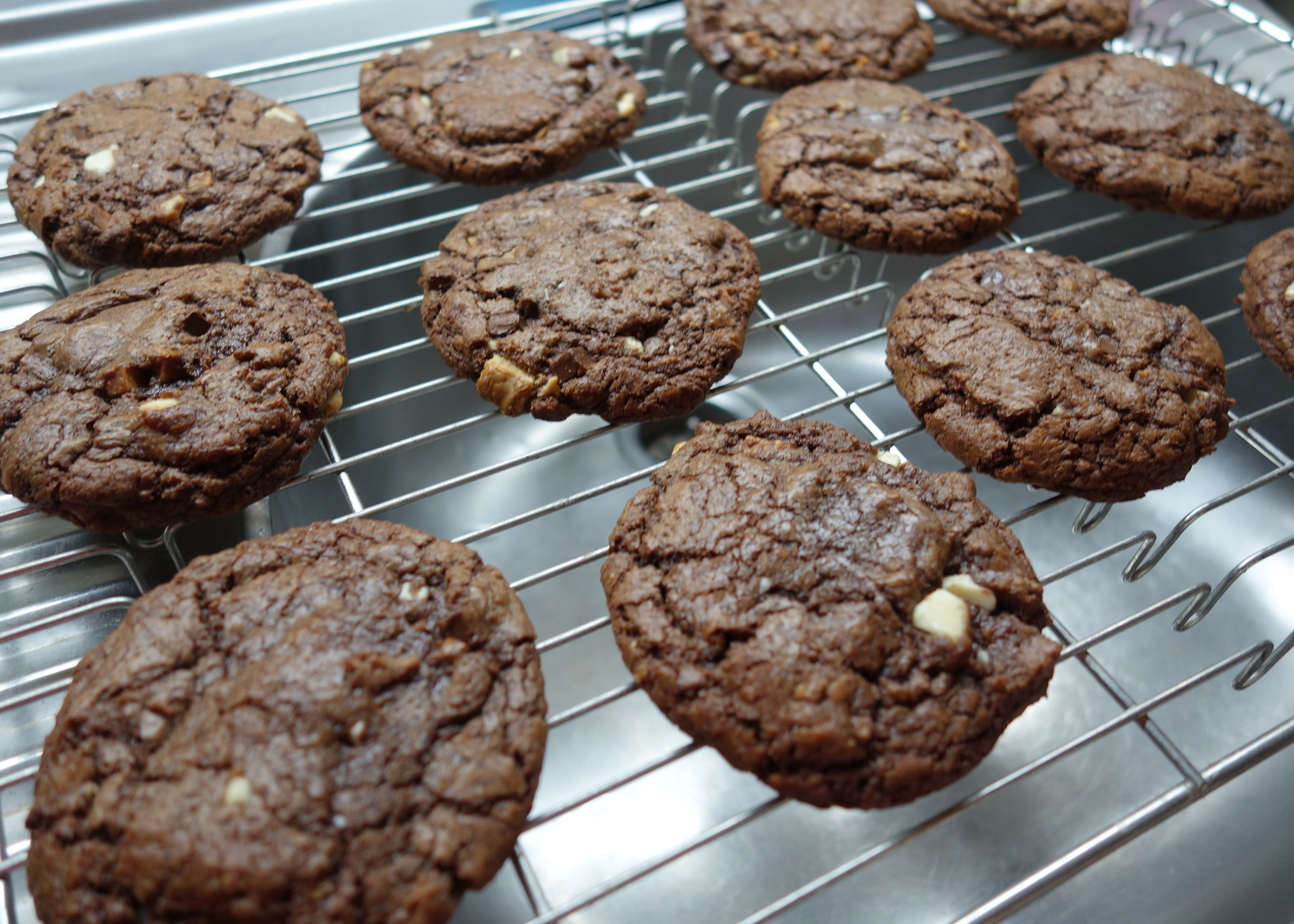 Was drin ist? Schokolade, Schokolade und noch viel mehr Schokolade! Von dunkel bis hell, geschmolzen bis gewürfelt, alles ist dabei. Ausserdem sorgen ein paar Caramel Würfel doch noch für eine kleine Geschmacksüberraschung neben all der Schokolade. Dadurch dass ich den Teig vor dem Backen kühl gestellt habe und die Cookies nur 10min im Ofen gelassen habe, sind sie innen noch herrlich weich geblieben. Eins habe ich noch warm verspeist und es war innen sogar noch etwas flüssig, einfach göttlich!