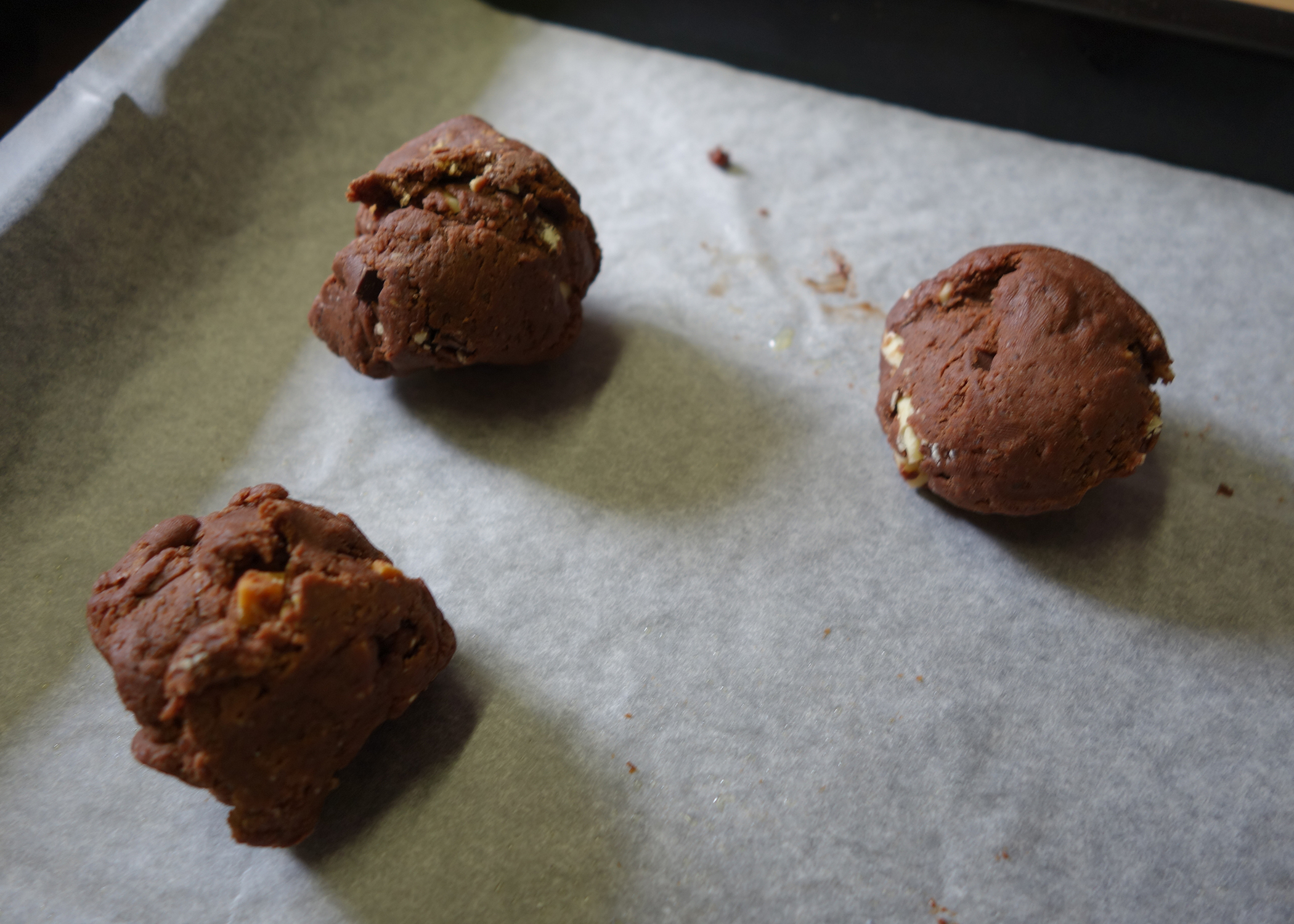 Fürs Backen den Ofen auf 175°C Umluft vorheizen und 2 Bleche mit Backpapier belegen. Anschliessend Kugeln mit einem Eisportionierer formen und in grossen Abständen auf das Blech legen. Die Cookies für jeweils 10min backen, etwa fünf Minuten auf dem Blech und anschliessend auf einem Gitter auskühlen lassen.