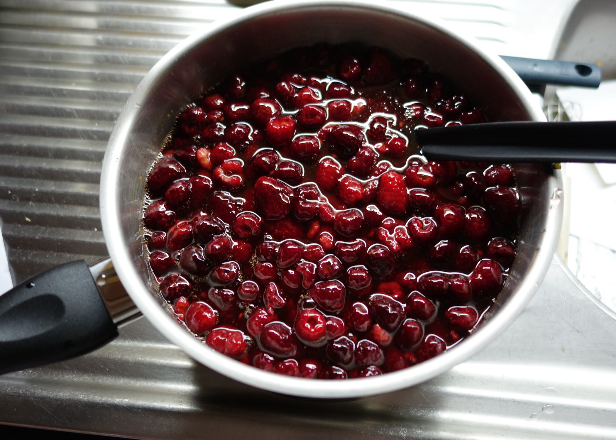 Für den Himbeerpudding den Sirup mit 5dl Wasser aufkochen. Das Puddingpulver mit 2.5dl Wasser verrühren und zum siedendem Sirup geben. Wiederum aufkochen und unter rühren für etwa eine Minute weiterkochen. Die Mischung in eine Schüssel giessen und die gefrorenen Himbeeren unterrühren. Solange kühl stellen bis die Masse fast fest wird. Bei mir ist sie leider die ganze Zeit ziemlich flüssig geblieben, sodass ich die Geduld verloren habe und sie einfach auf das Biskuit gestrichen habe. Anschliessend für mehrere Stunden kühl stellen.