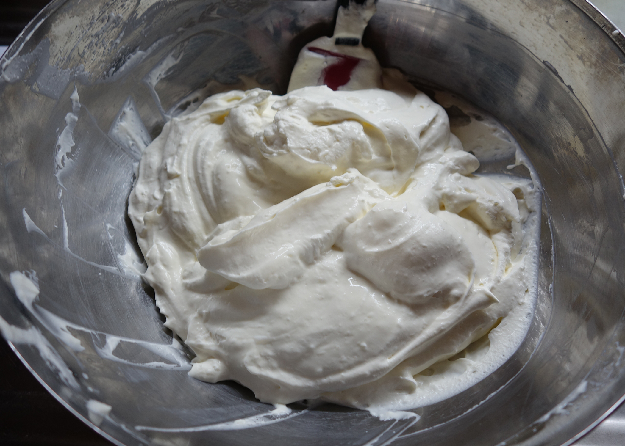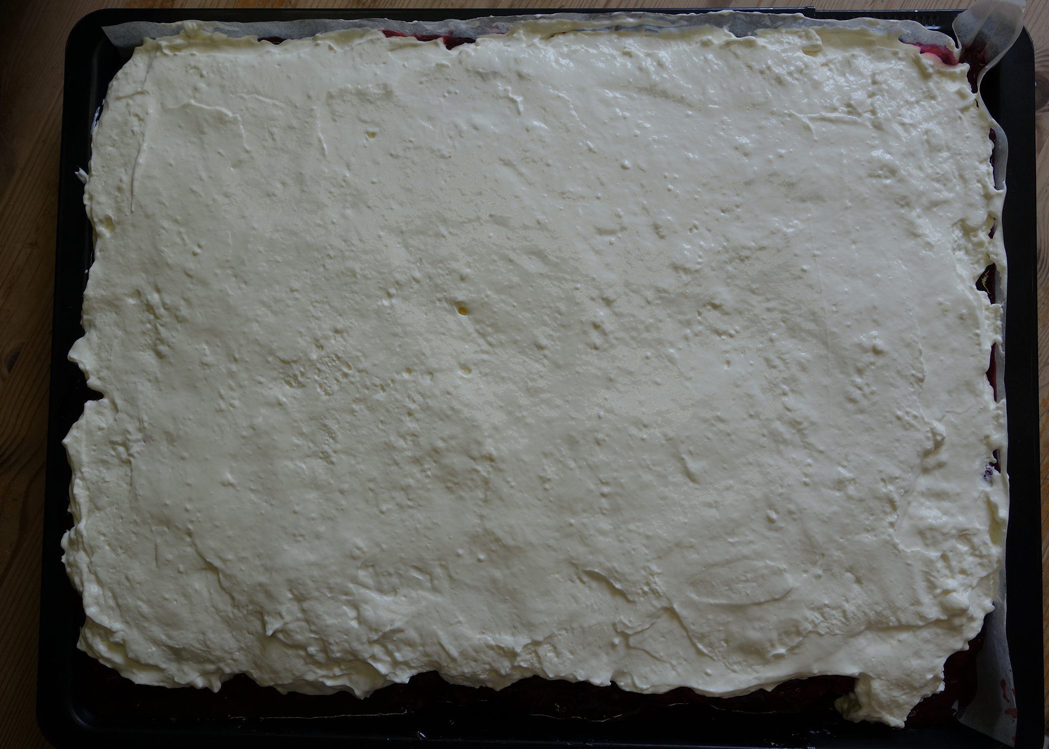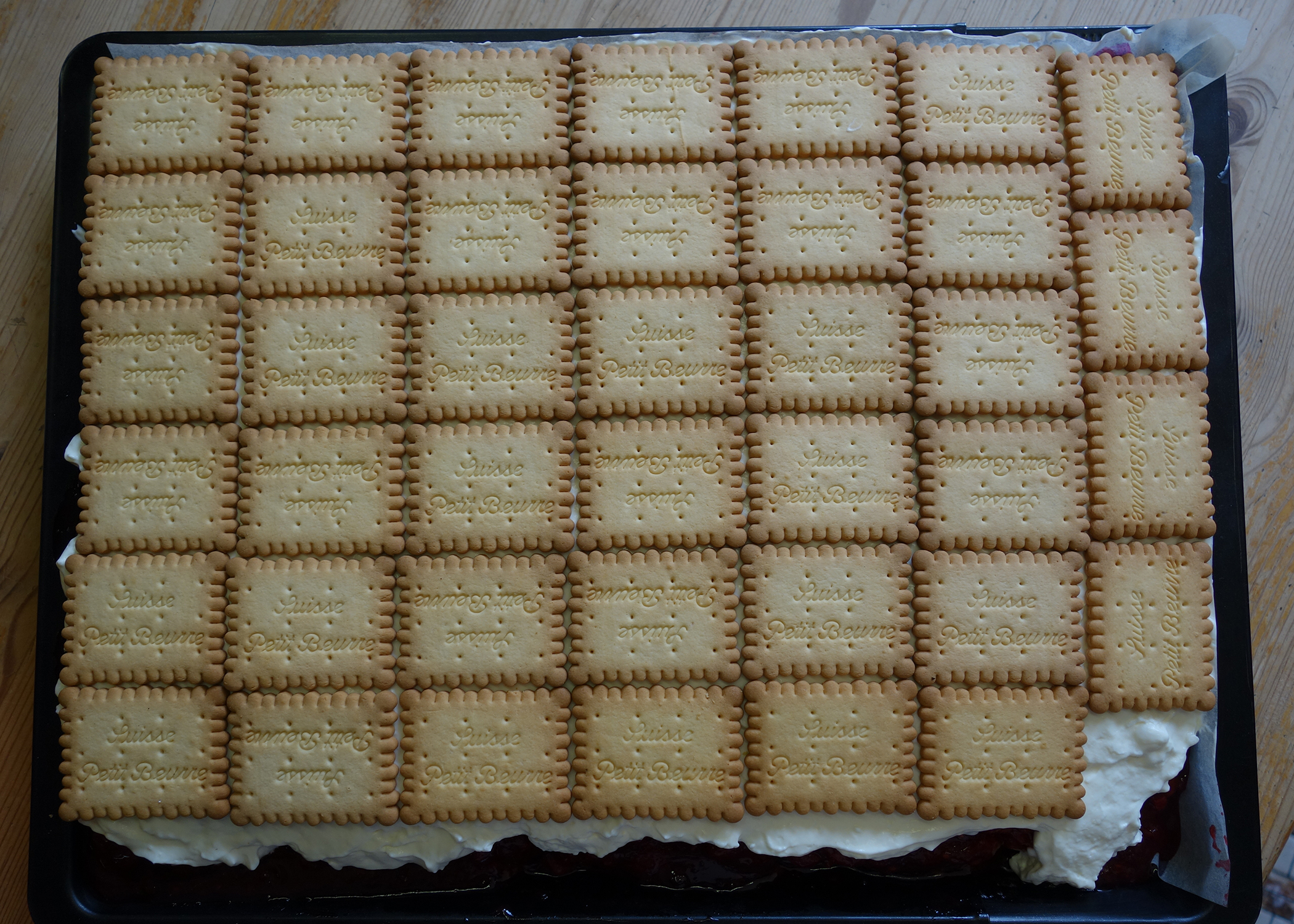 Zum Schluss den Rahm mit dem Rahmhalter steif schlagen. Die Qimiq Masse glattrühren und anschliessend den geschlagenen Rahm unterziehen. Das Ganze auf die Himbeer-Pudding Schicht streichen und die Petit Beurre Kekse darauf legen (siehe Foto). Vor dem Schneiden und Servieren erneut kühl stellen (über Nacht oder für ca. 5 Stunden)