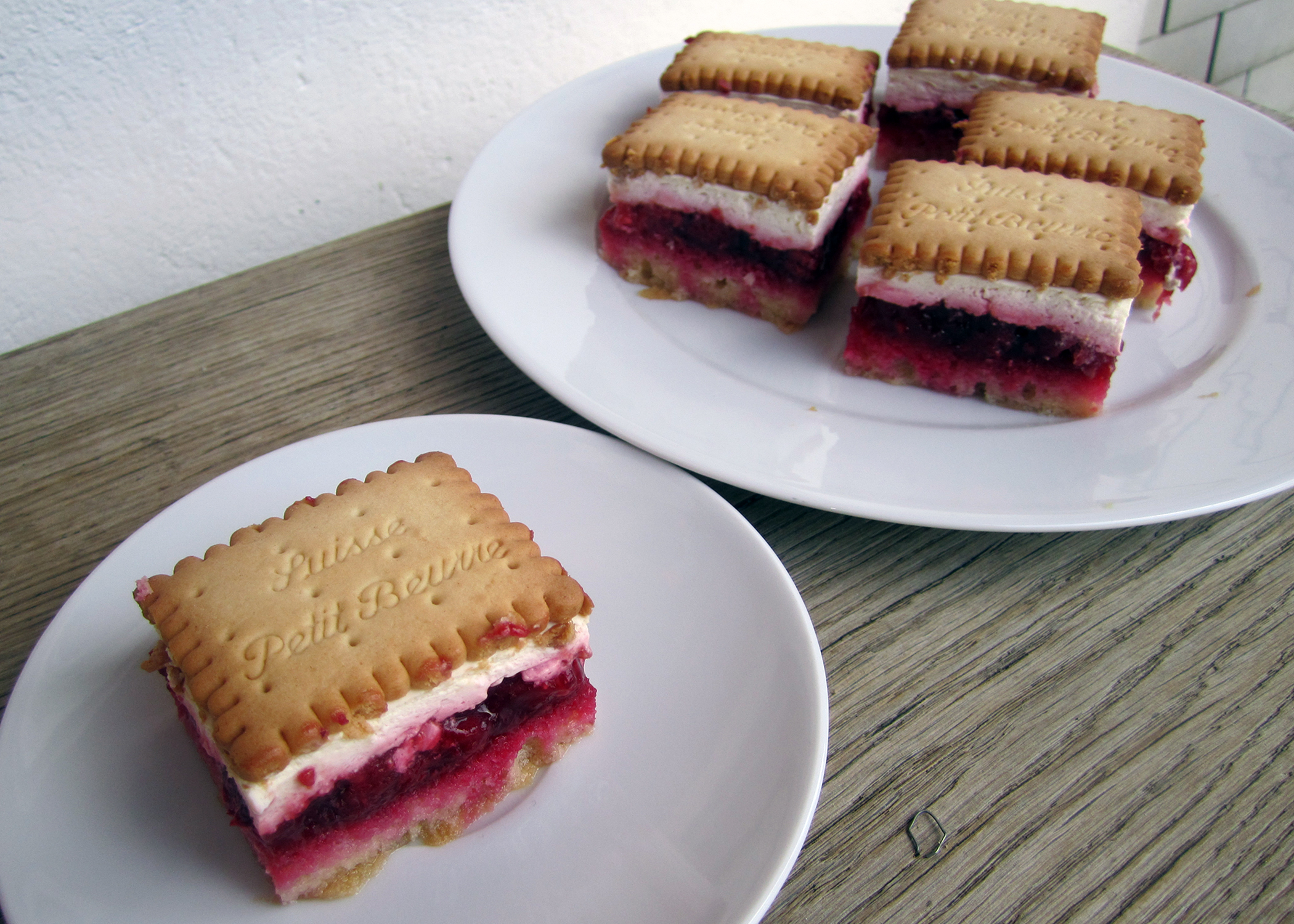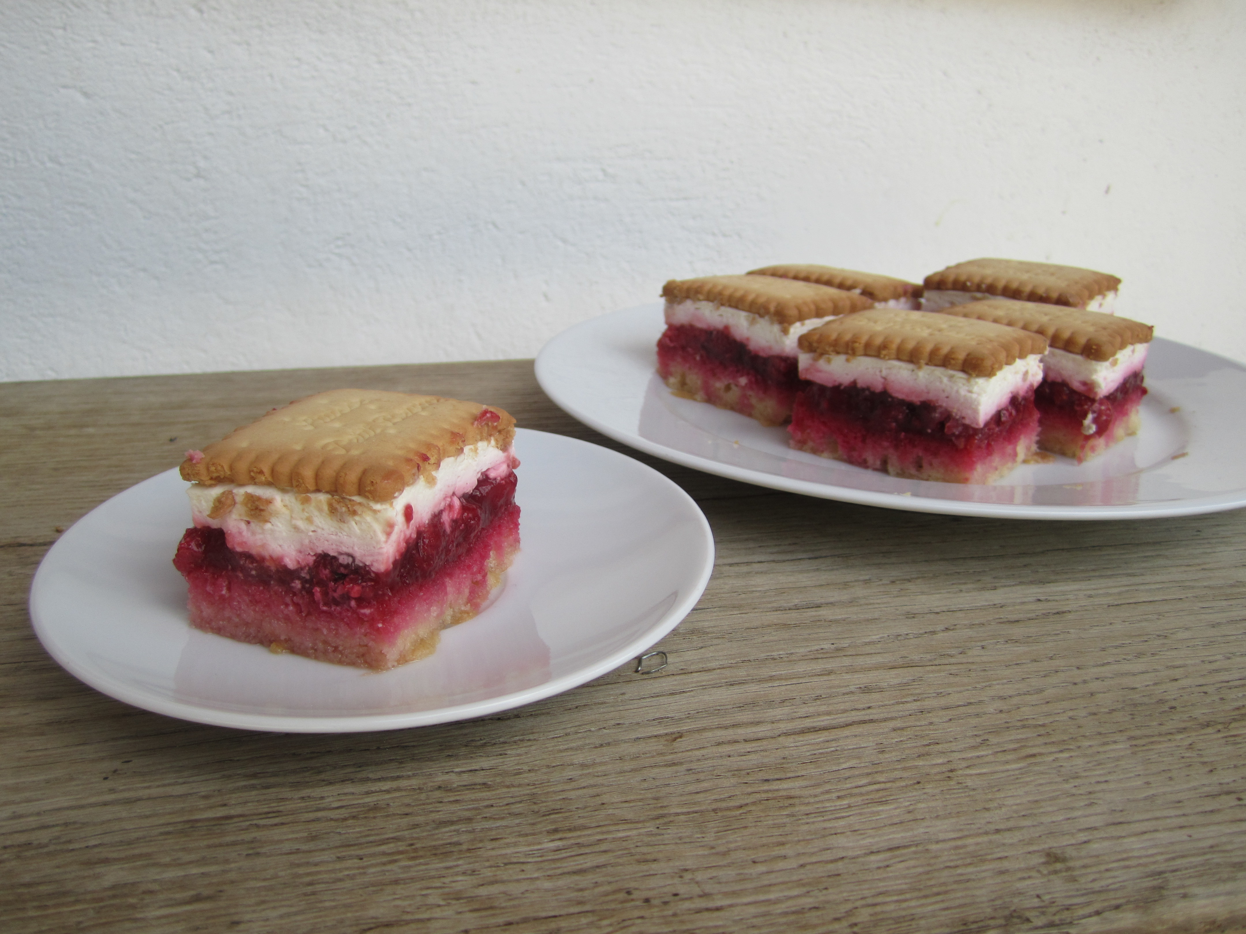 Nichtsdestotrotz war das Geschmackserlebnis einfach riesig. An die Zitronen-Pudding-Schnitten kam diese Himbeerversion nicht ganz heran, die Kombination von Biskuit, Pudding, Frucht, Sahne und Petit-Beurre Keksen lässt jedoch ebenfalls jedes Dessert-Herz höher schlagen. Zum Schluss sollte man noch erwähnen, dass man unbedingt ein paar Freunde und Bekannte fürs Verkosten einladen sollte, die Stückmenge von 40 ist nämlich relativ gross und die Schnitten sind auch nicht gerade leichte Kost 😉