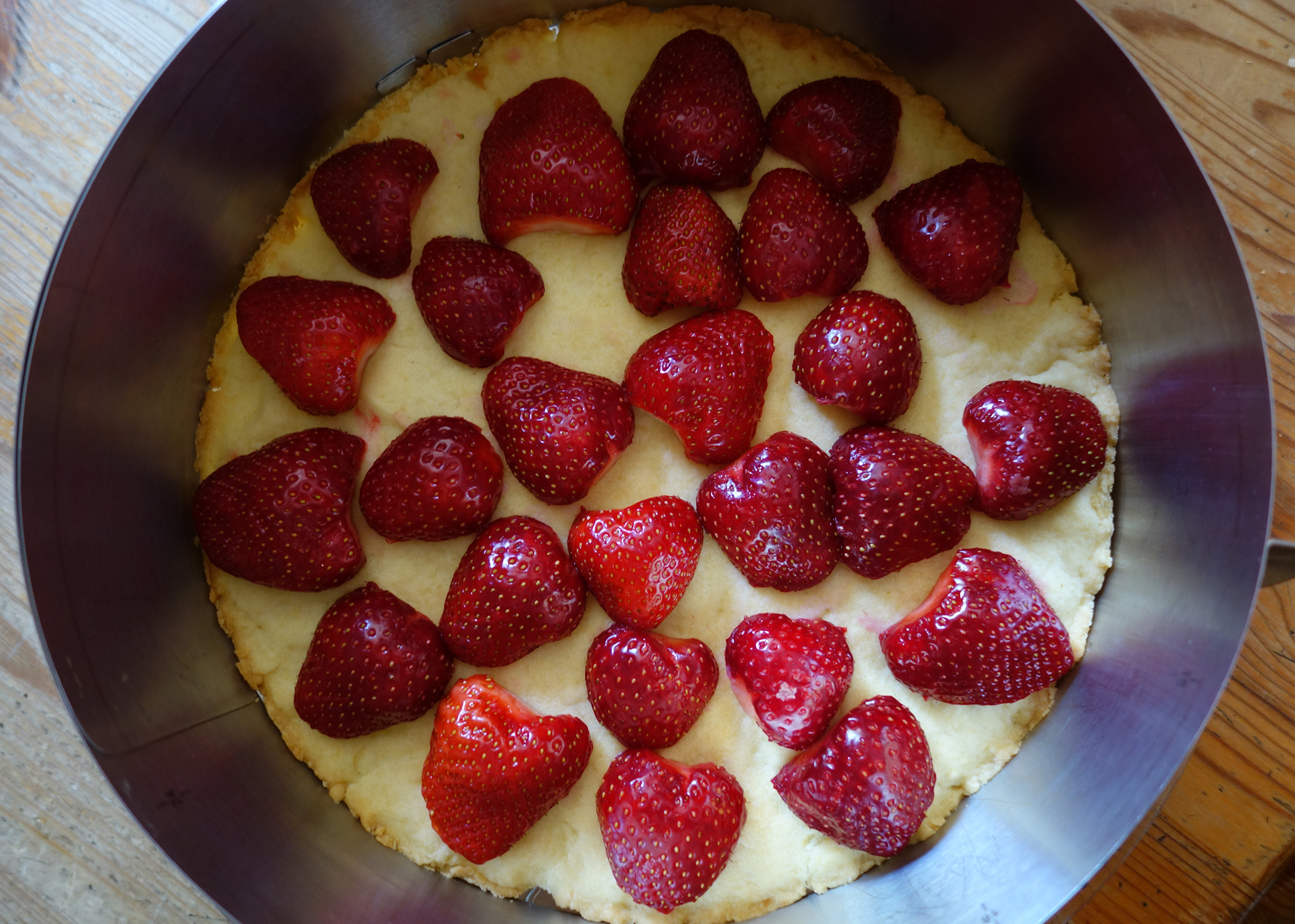 Jetzt muss die Torte noch zusammengebaut werden. Dazu den gebackenen Mürbeteig auf eine Torteplatte geben und einen Tortenring darum spannen. 300g der Erdbeerenhälften darauf verteilen und mit der Hälfte der Quarkmasse überdecken. Danach das Biskuit vorsichtig darüber legen und die restlichen 300g Erdbeerenhälften auf dem Biskuit verteilen. Noch die restliche Quarkcreme darüber giessen und die Torte für mindestens 3 Stunden kühl stellen.