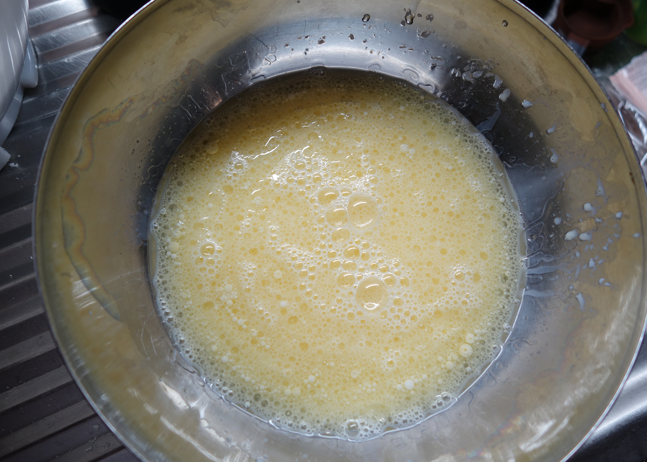 In einer zweiten Schüssel die Milch mit dem Öl und dem Ei verrühren.