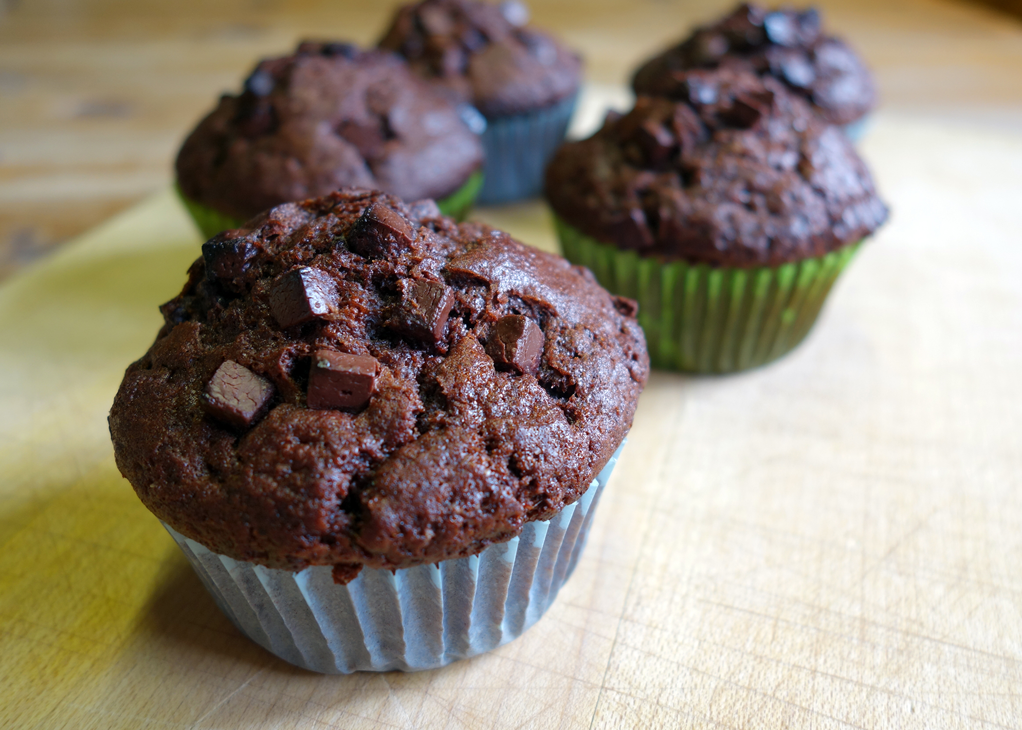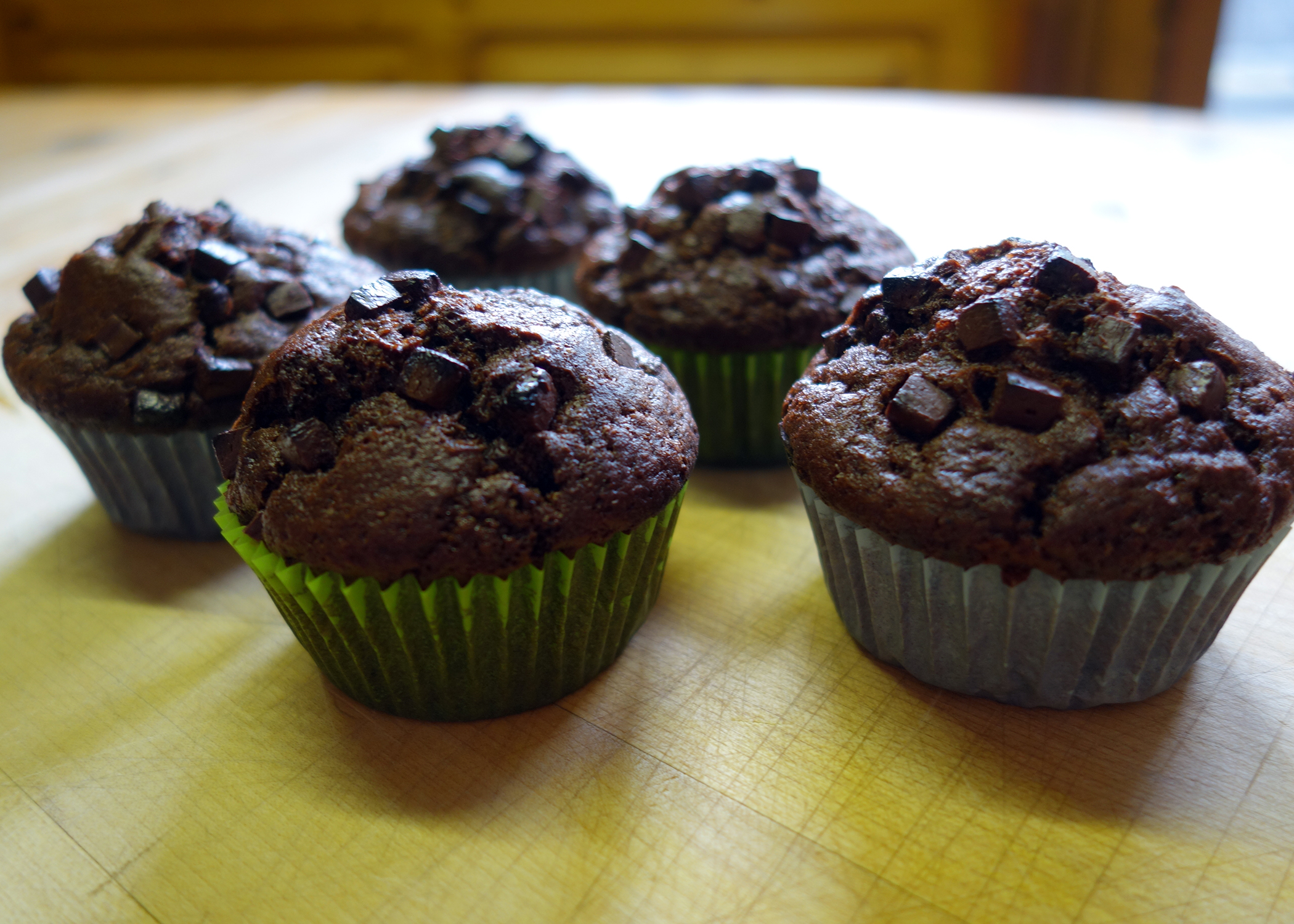 Anschliessend die flüssige Mischung zur Mehlmischung geben und kurz verrühren, sodass der Teig immer noch klumpig ist. Anschliessend auf die Förmchen verteilen und die 60g Schokoladenwürfel darüber streuen. Während ca. 18-20 Minuten im Ofen backen und auf einem Gitter auskühlen lassen.