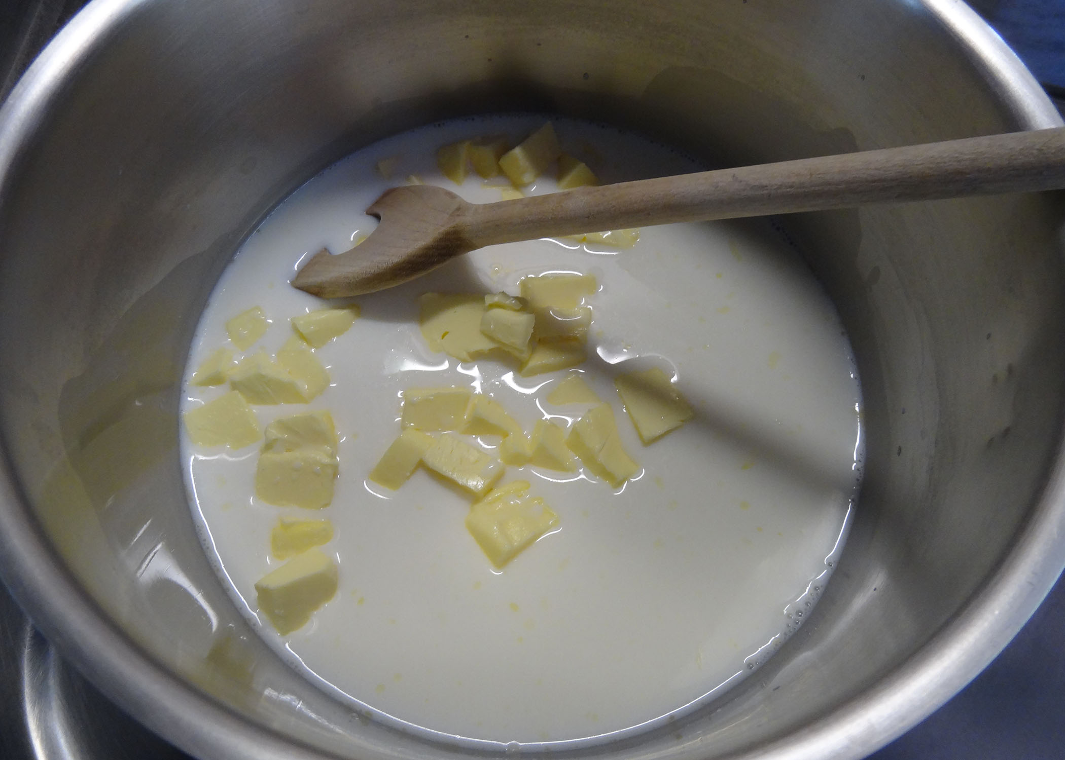 Für den Hefeteig die Butter in kleine Stücke schneiden. Die Milch in einer Pfanne bei niedriger Stufe erwärmen und die Butter darin schmelzen. Sobald die Butter geschmolzen ist, von der Herdplatte ziehen und etwas abkühlen lassen.