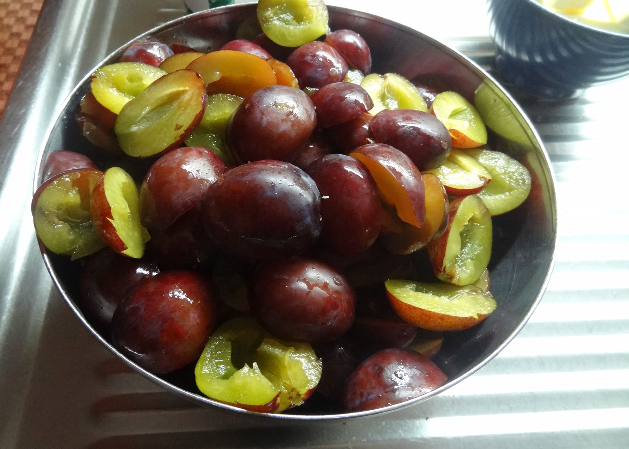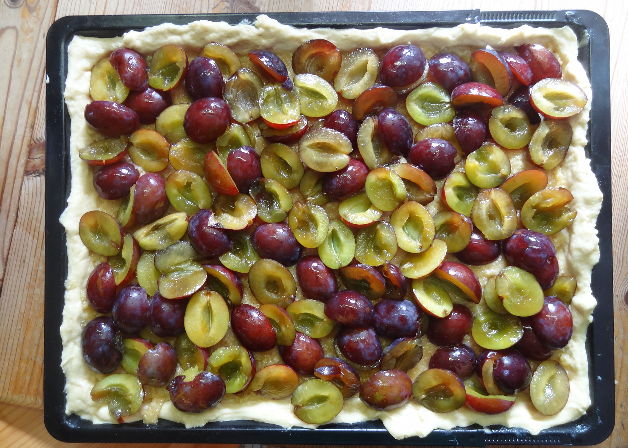 Währenddessen ein tiefes Blech (3.5-4cm tief) mit den ungefähren Massen von 30x40cm einfetten und bemehlen. Die Pflaumen waschen, halbieren und entsteinen. Den Backofen auf 160°C Umluft vorheizen.
