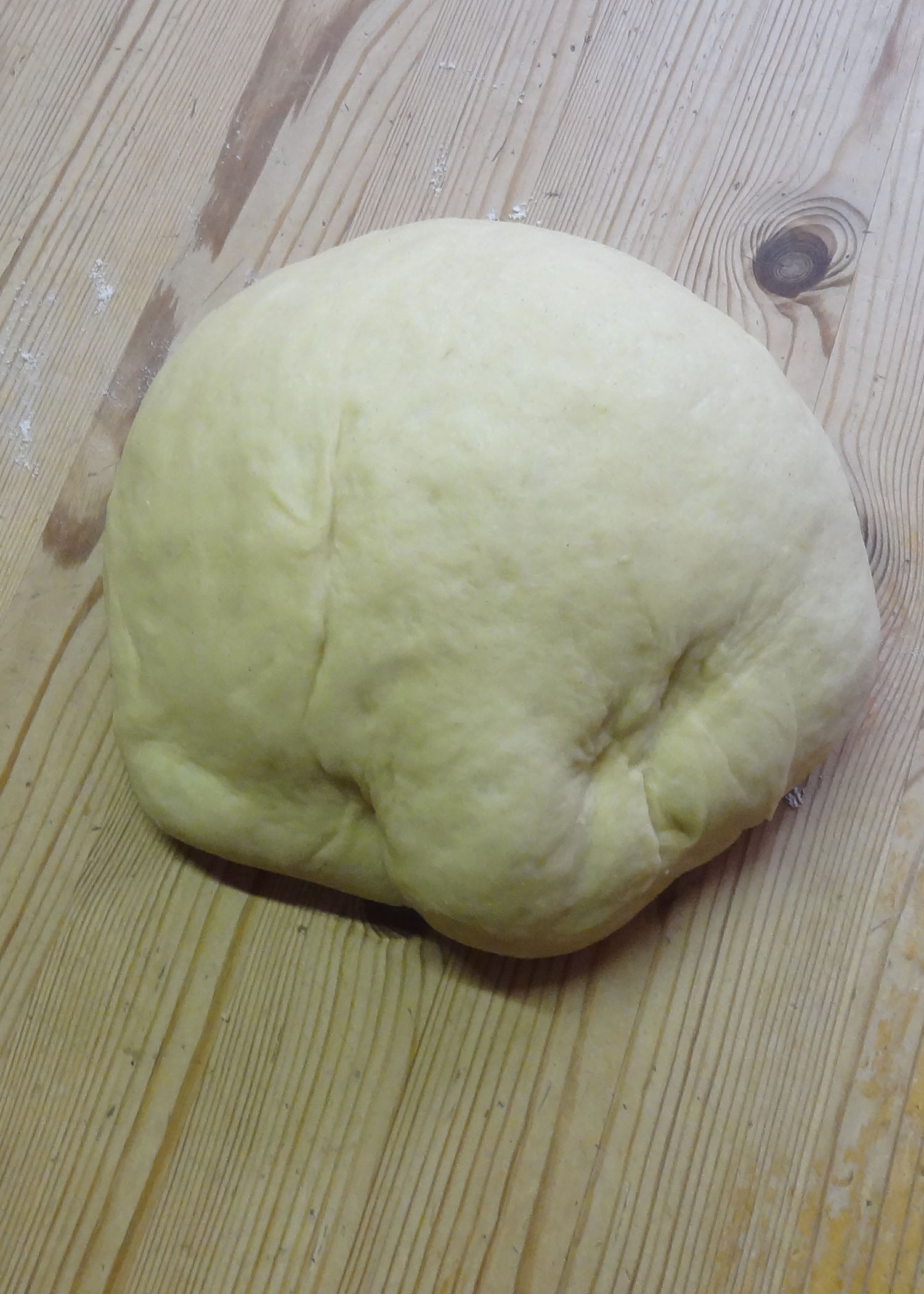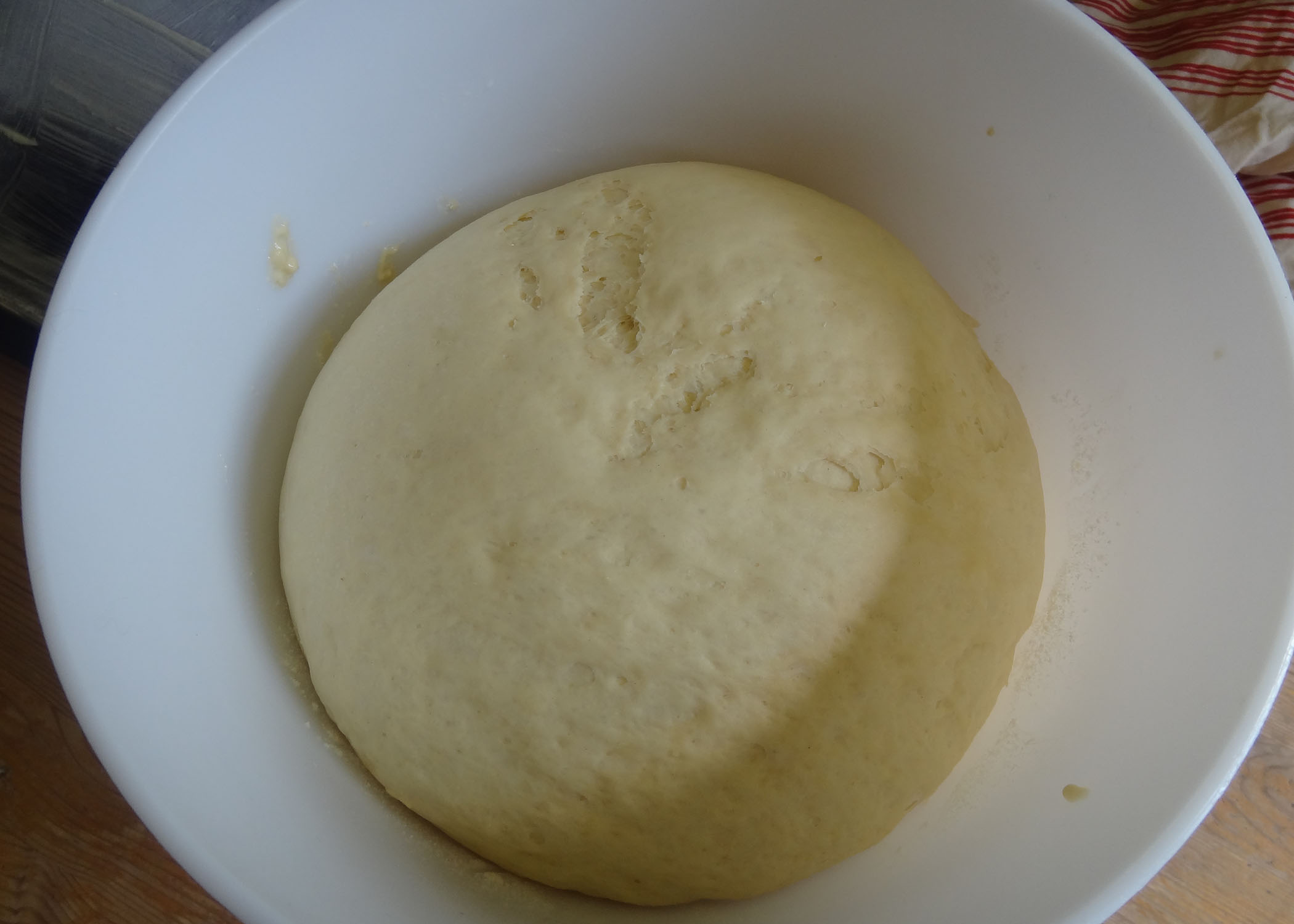 In der Zwischenzeit das Mehl mit der Trockenhefe, Rohrzucker und Salz vermischen. Eine kleine Mulde in der Mitte formen. Nun die zwei Eier, den Rum und die Milch in die Mulde giessen. Mit dem Knethacken zu einem glatten Teig verkneten. Da ich relativ grosse Eier verwendet habe und auch mit dem Rum nicht unbedingt sparsam war, war der Teig mit nur 500g Mehl noch viel zu nass. Darum gegebenenfalls etwas Mehr hinzugeben, bis der Teig nicht mehr klebt. Den Teig nochmals kurz von Hand durchkneten und zurück in die Schüssel legen. Die Schüssel mit einem feuchten Geschirrtuch zudecken und den Teig an der Wärme für etwa 45-60min aufgehen lassen. (Das zweite Bild zeigt den bereits aufgegangenen Teig nach einer Stunde)
