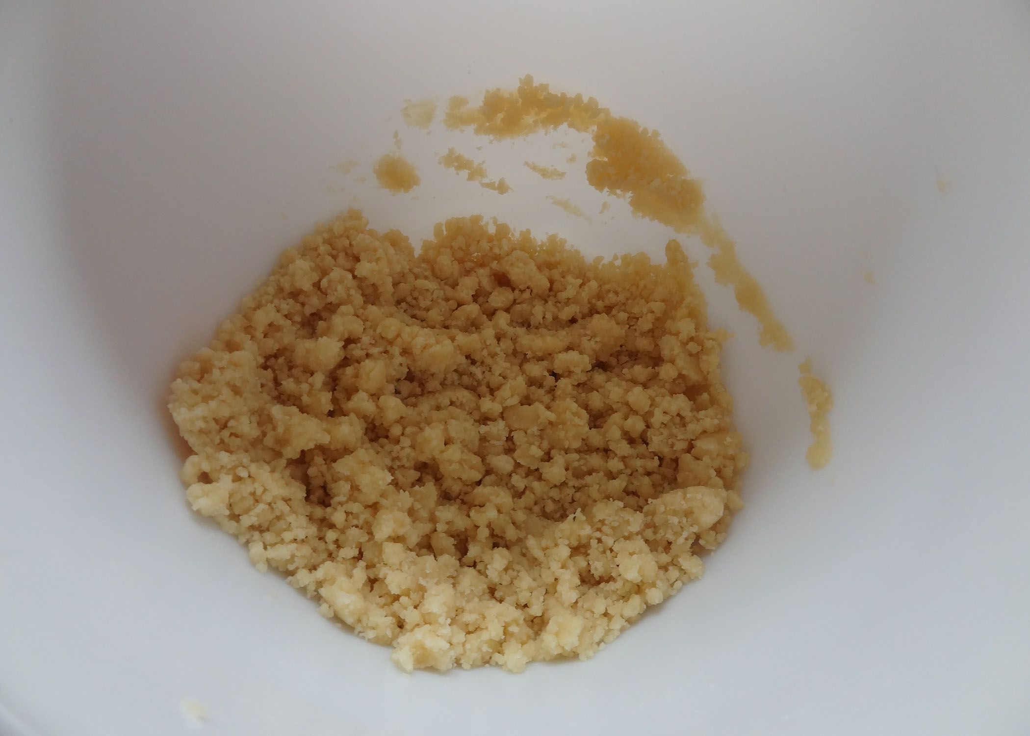 Nun müssen noch die Streusel vorbereitet werden. Dazu die Butter bei schwacher Hitze schmelzen und mit dem Mehl, Zucker, Vanillezucker und Salz zu Streuseln vermischen.