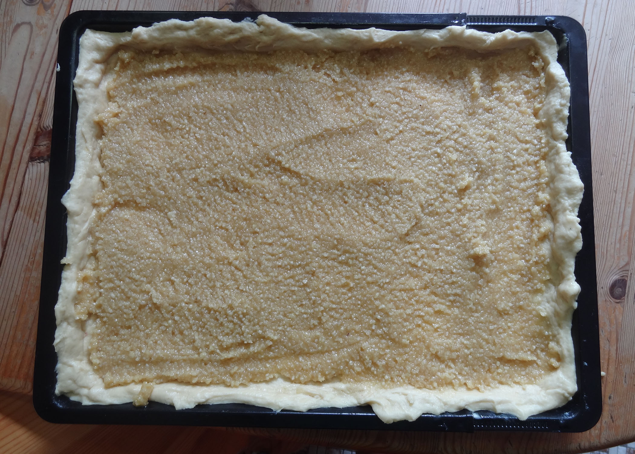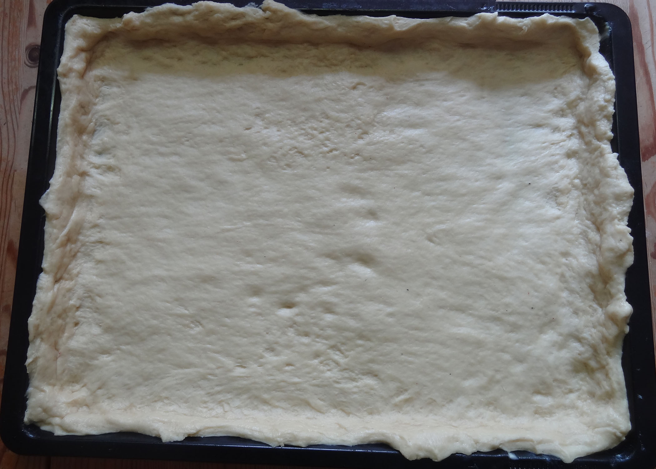Den aufgegangenen Teig kurz durchkneten und auf dem Blech auswallen und am Rand gut hochdrücken. Die Teigschicht sollte relativ dünn sein. Da ich etwas mehr Flüssigkeit und auch mehr Mehl verwendet habe, hatte ich überschüssigen Teig. Mit diesem habe ich ein kleines Brötchen geformt und gebacken. Falls vorhanden, kann man natürlich auch einfach ein etwas grösseres Blech verwenden.
