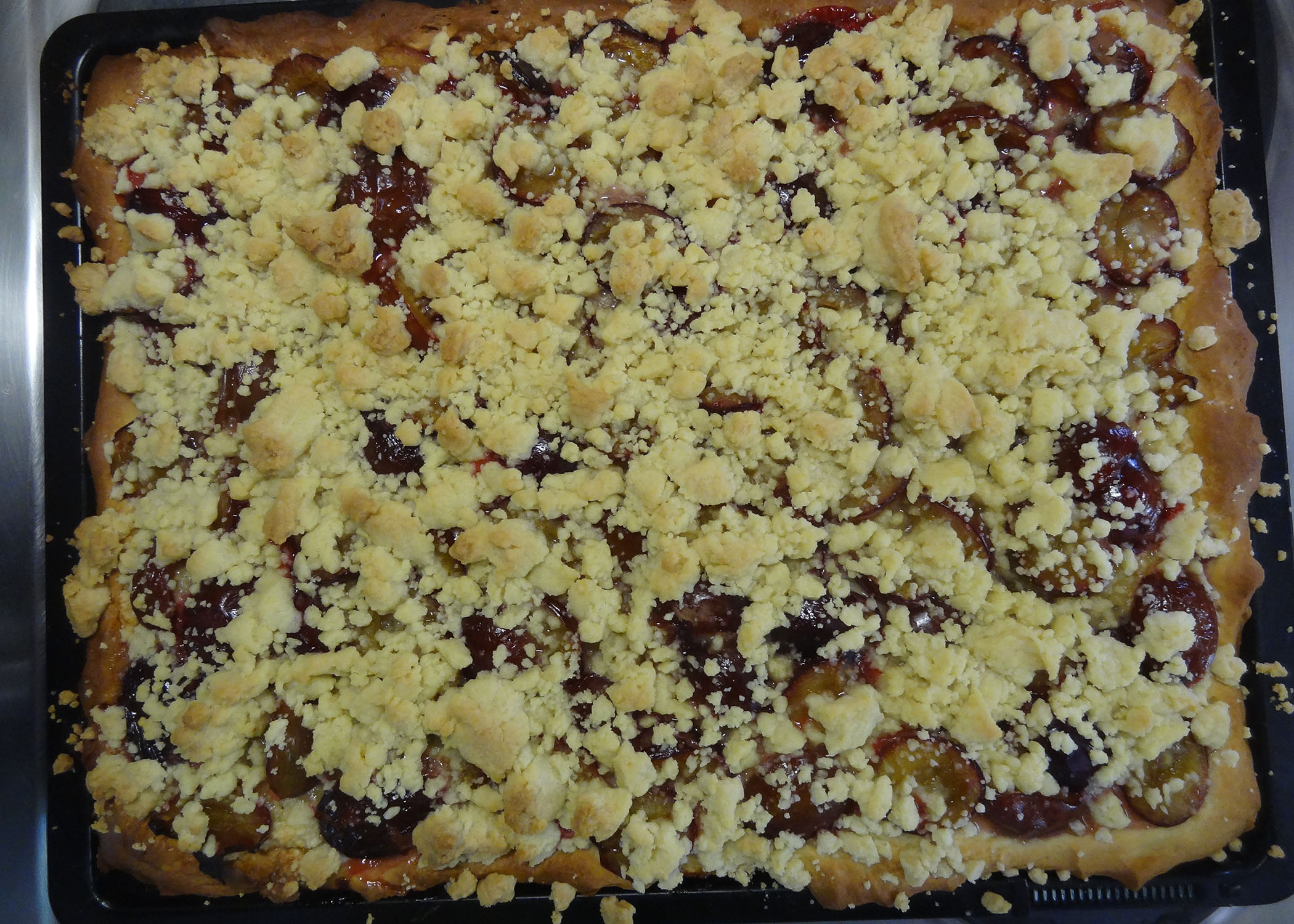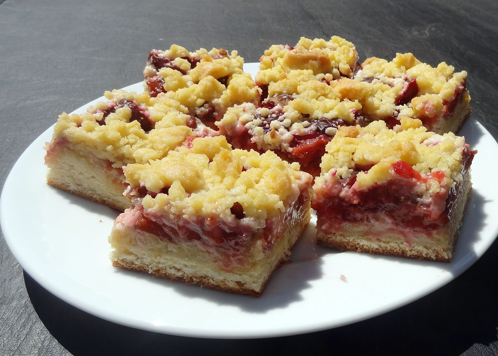 Das Originalrezept aus für diese Schnitten habe ich aus einem Backbuch, jedoch habe ich es relativ stark nach meinem Gusto abgeändert. Einfach eine normale Zwetschgenwähe zu backen wäre mir etwas zu öde gewesen und da Zwetschgen beim backen immer sehr weich und etwas „matschig“ werden, war ich der Meinung das ein paar knsuprige Streusel einen tollen Kontrast bieten.