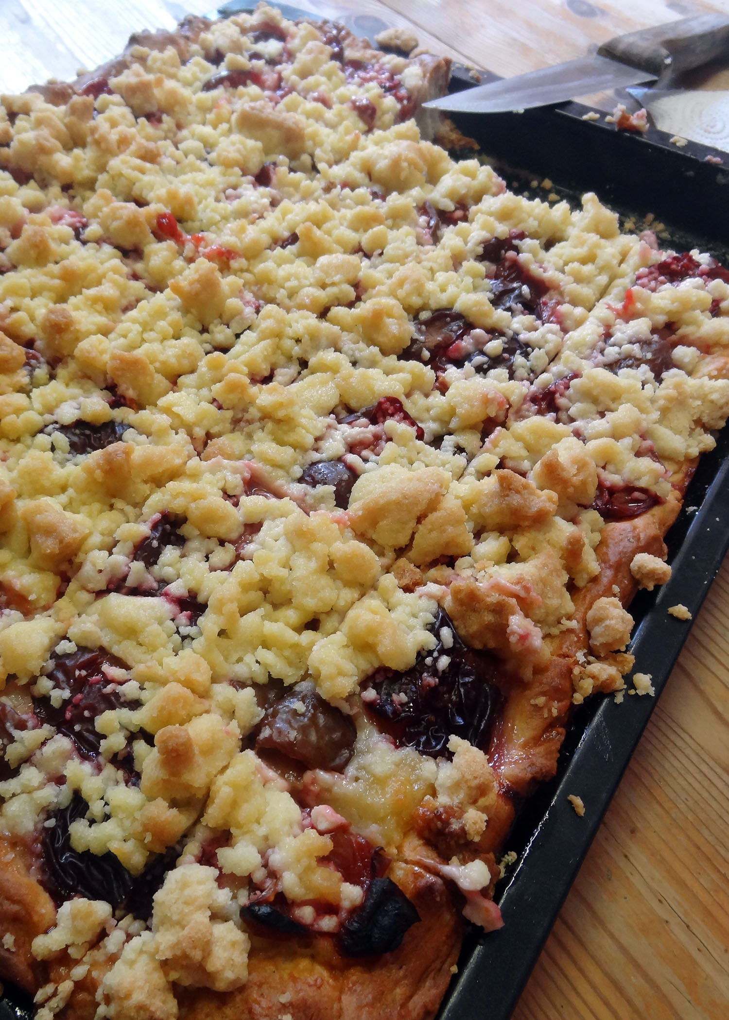 Jetzt die Mandelfüllung auf dem Teig verstreichen und die Zwetschgen darauf verteilen. Zum Schluss die Streusel darüberstreuen und das Ganze für ca. 45-50min Backen. Auskühlen lassen und in beliebig grosse Stücke schneiden.
