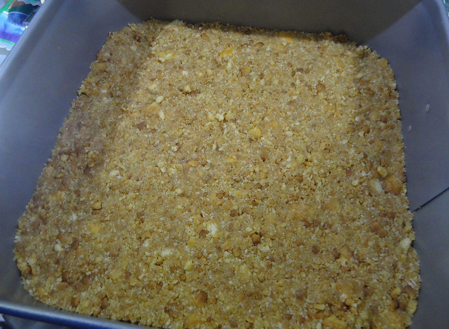 Eine quadratische Springform (24x24cm) mit Backpapier auslegen. Die Petit-Beurre Kekse in einen Gefrierbeutel geben und mit einem Fleischhammer oder Wallholz fein zerbröseln. Die Brösel in eine Schüssel geben, die Butter schmelzen und dazu giessen. Sofort sehr gut vermischen, in die vorbereitete Form geben und fest andrücken. Den Boden für mindestens 30min kühl stellen.