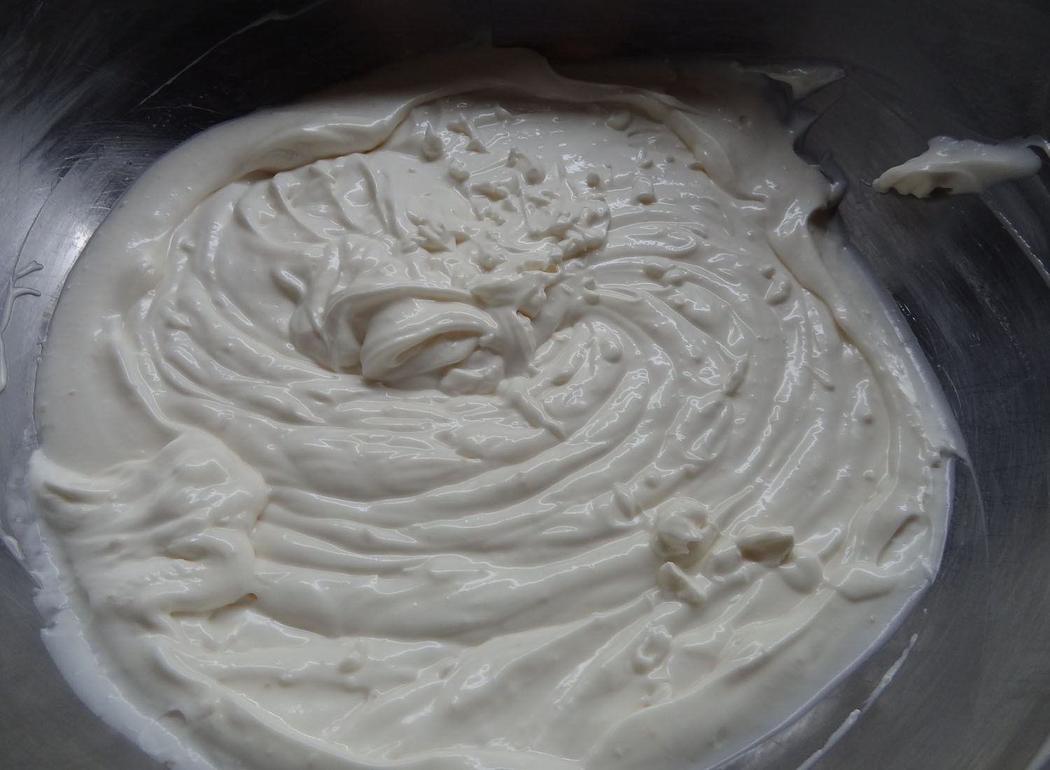 Jetzt den Sirup in einem Topf auf geringer Stufe erhitzen. Daneben die einweichenden Gelatineblätter bereit stellen. (siehe Foto). Sobald der Sirup heiss ist (er sollte nicht aufkochen), die Gelatineblätter nacheinander ausdrücken und in den Sirup rühren. Den Topf sofort vom Herd ziehen und 2 Esslöffel der Mascarponemasse unterrühren. Diese Mischung dann zur gesamten Mascarponemasse giessen und gut verrühren. Die Creme anschliessend kühl stellen, bis sie zu gelieren beginnt. Sobald das der Fall ist, den geschlagenen Rahm unterheben und die Masse auf den gekühlten Keksboden geben. Kurz glattstreichen und für 5 Stunden kühl stellen.
