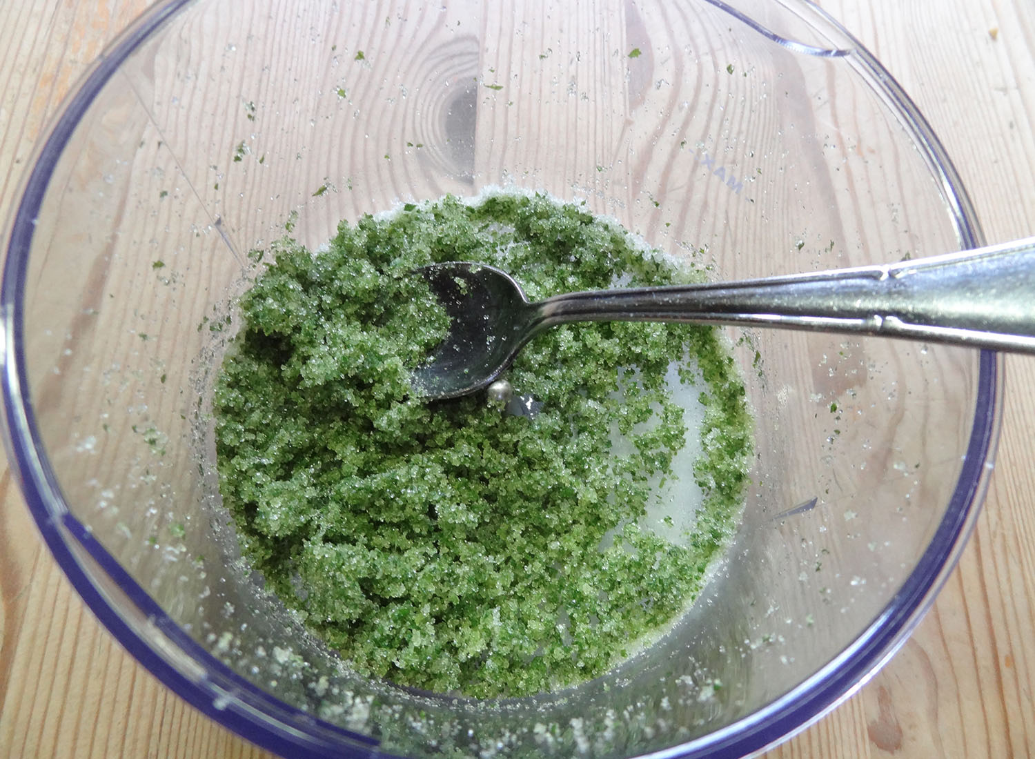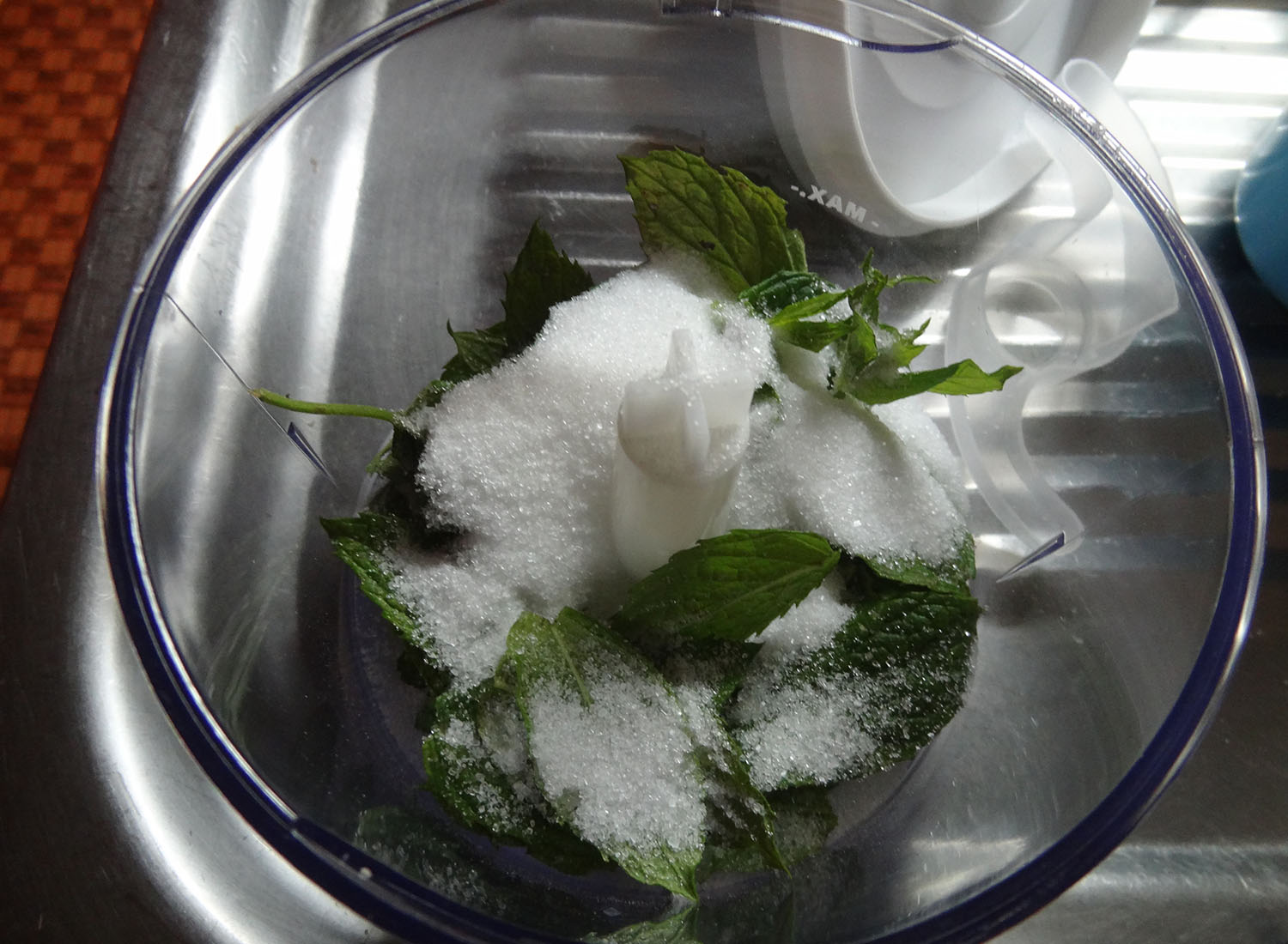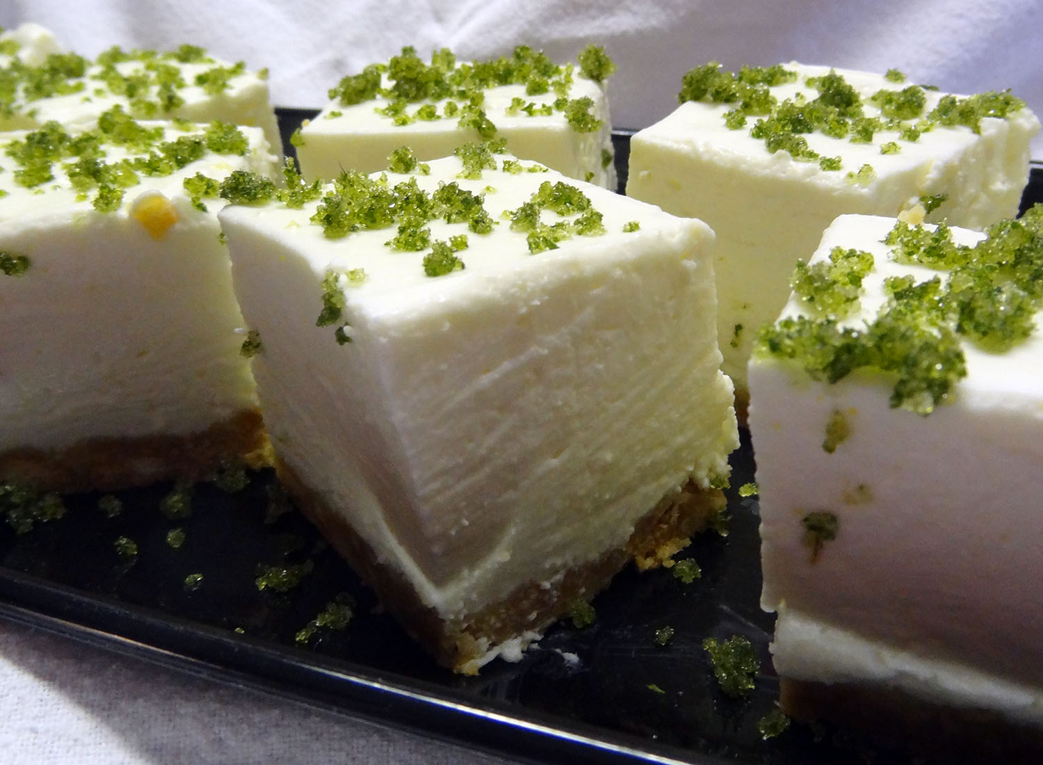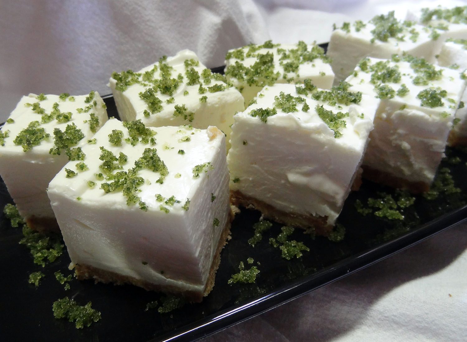 Nach dem Kühlen die Springform lösen und den Kuchen in beliebig grosse Quadrate schneiden. Diese wiederum bis zum Servieren kühl stellen. Die Schnitten sollten erst kurz vor dem Servieren garniert werden, da der Minzzucker sonst zerläuft und ziemlich unappettlich aussieht. Für die Garnitur die Minzblätter mit dem Zucker in einem elektrischen Zerkleinerer fein hacken und auf die einzelnen Schnitten verteilen.