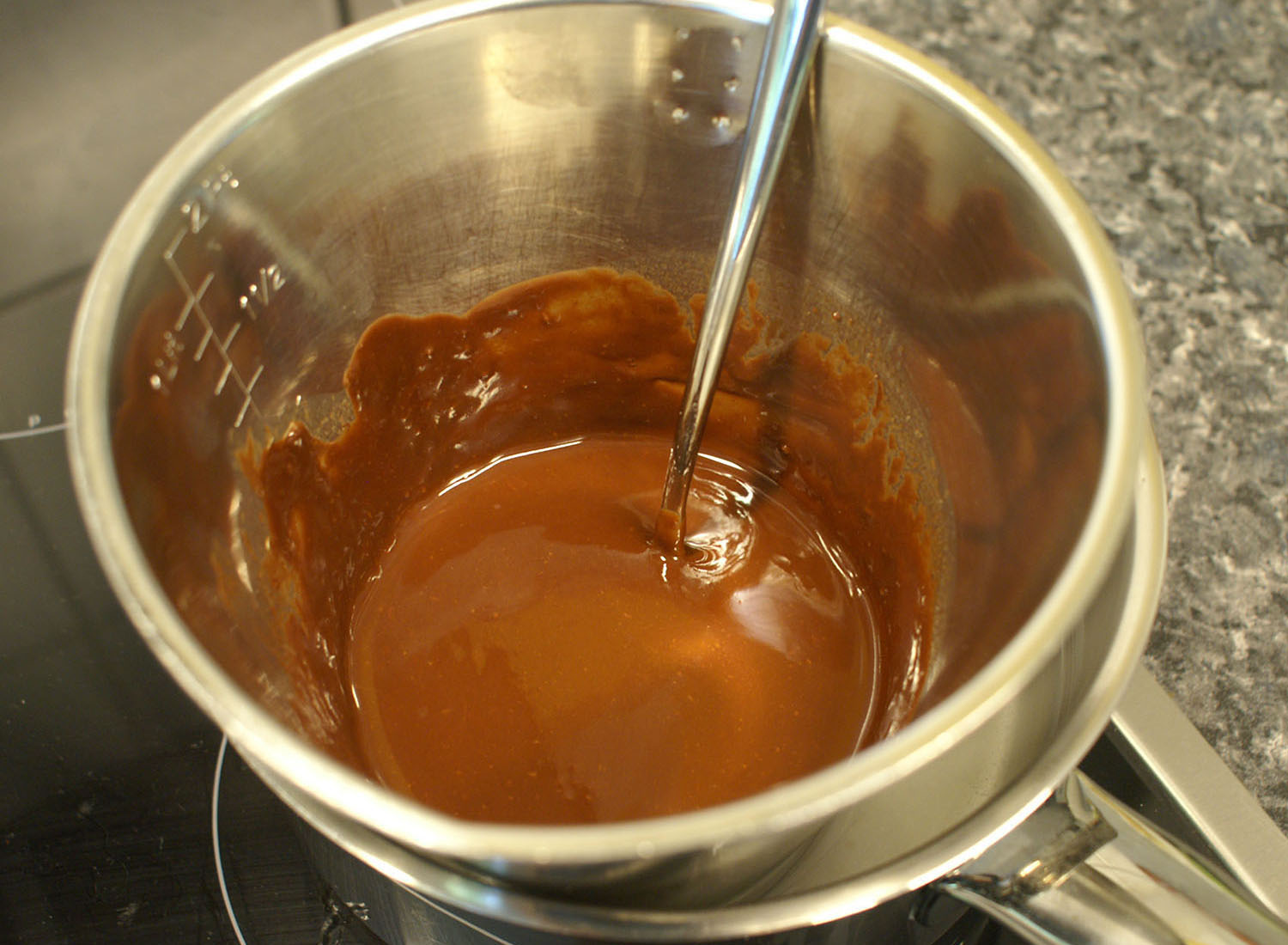 Für die Schokoladenglasur muss man die Butter und Schokolade in einem Wasserbad schmelzen. Anschliessend kann die Torte damit eingestrichen werden. Als Dekoration nun noch einige Schokoladenwürfel auf die Torte geben solange die Glasur noch flüssig ist.