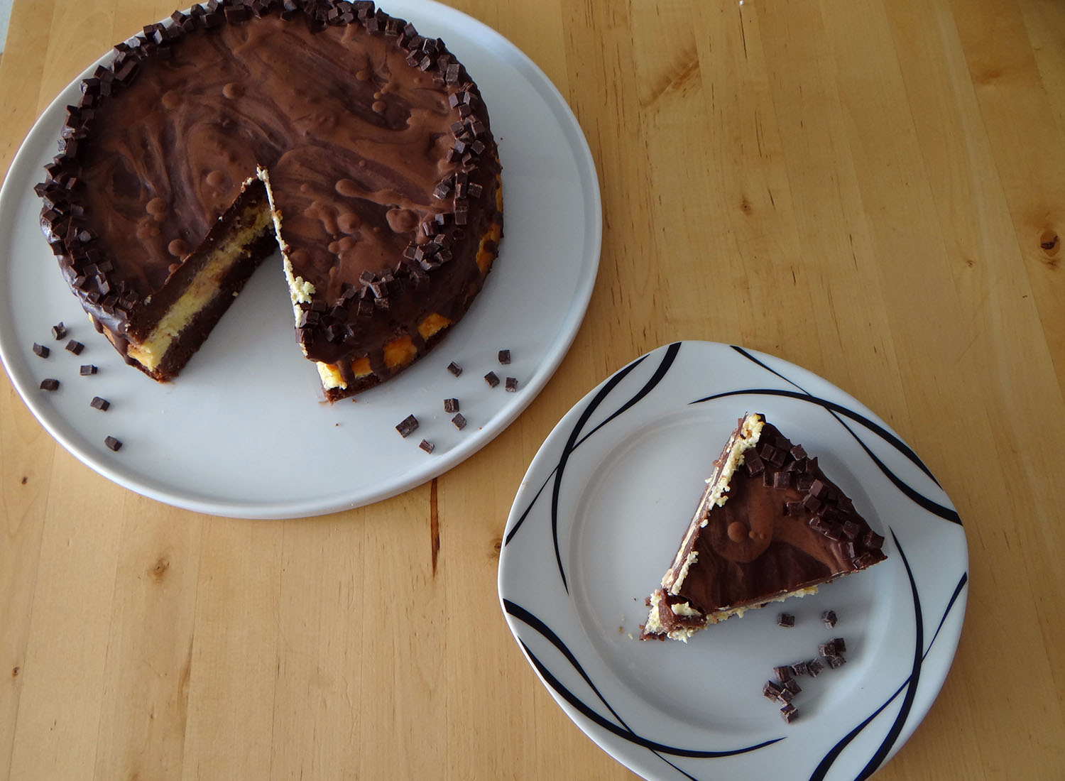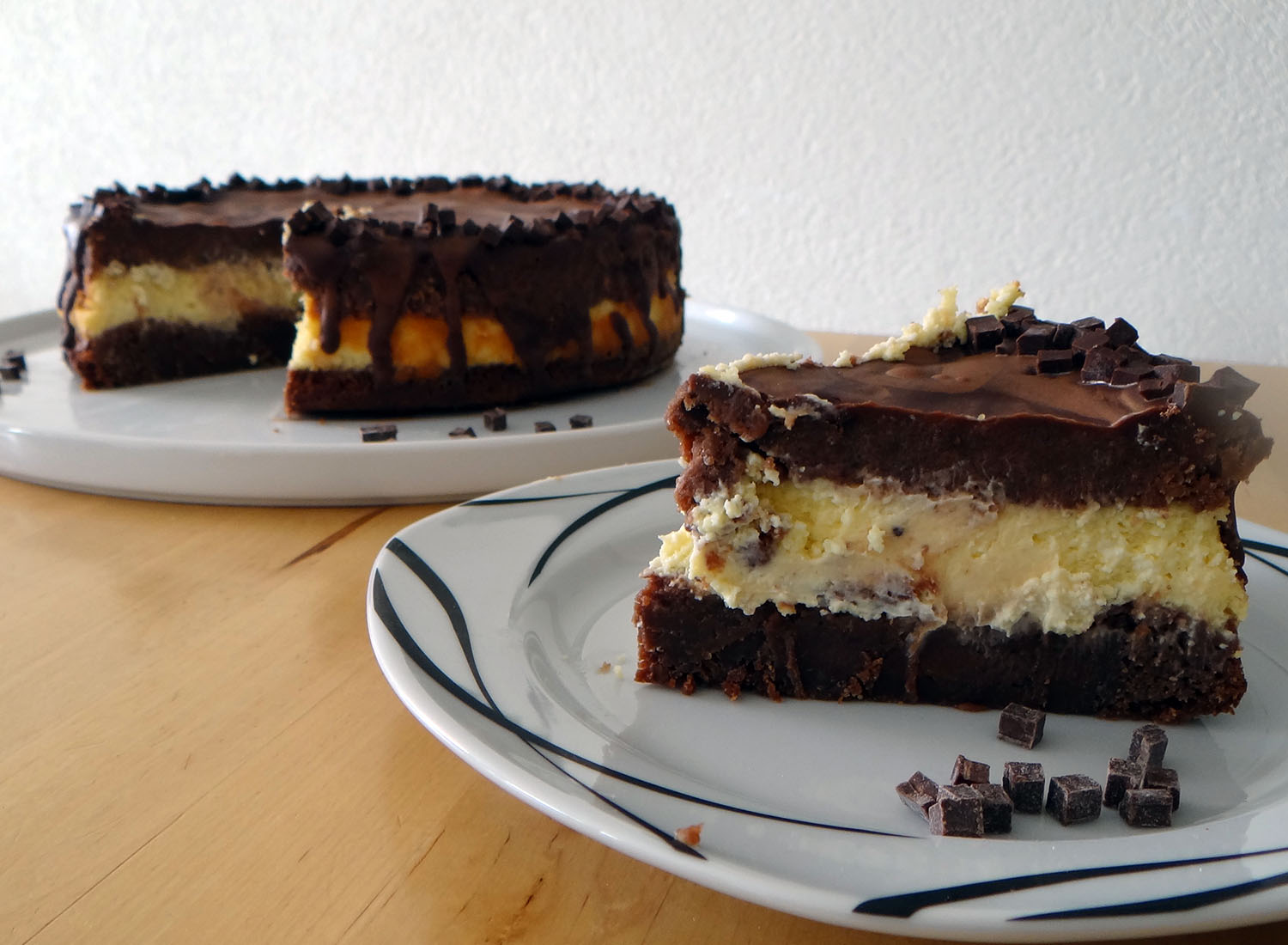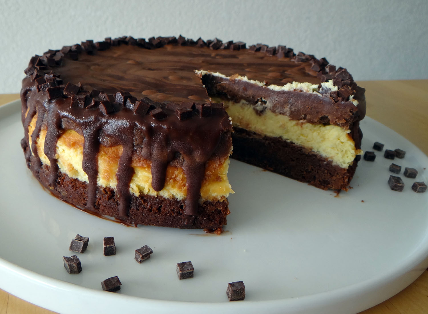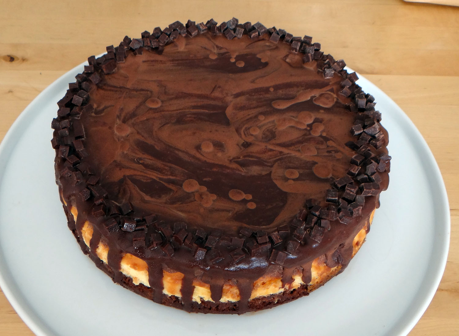 Vor kurzem hatte wieder einmal eine liebe Freundin von uns Geburtstag. Wie eigentlich die meisten in unserem Freundeskreis, ist sie eine Dessert-, aber noch viel mehr eine Schokoladenliebhaberin. Ausserdem kann sie auch von Cheesecakes nicht die Finger lassen. Betrachtet man nun diese Torte und deren Zutaten, wird schnell ersichtlich, dass sie wie die Faust aufs Auge passt.