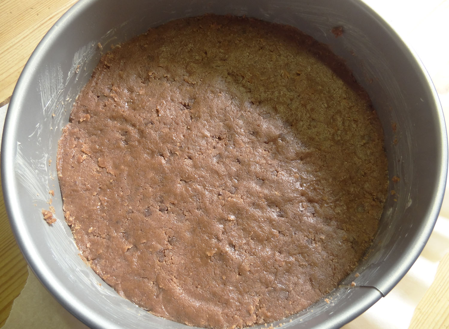 Als erstes muss die Cookie Dough-Schicht zubereitet werden, da diese tiefgefroren wird. Eine Springform (ø24cm) mit Backpapier auslegen und einfetten. Das Mehl mit dem Kakaopulver, Zucker und Vanillezucker vermischen. Die Butter schmelzen und mit der Mehlmischung verrühren. Die Schokoladenwürfel untermischen und die Milch zum Schluss unterrühren. Den eher trockenen Teig in die vorbereitete Form geben, sehr gut andrücken und in den Tiefkühler stellen.