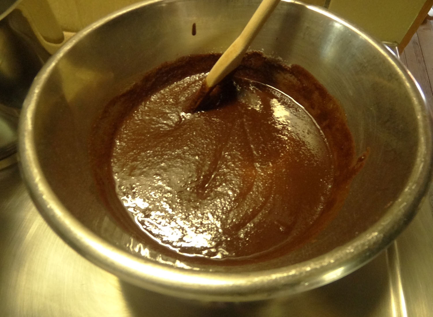 Die Schokolade hacken. Die Butter in Stücke schneiden und gemeinsam mit der Schokolade in einem heissen Wasserbad schmelzen. Die Mischung in eine grosse Schüssel geben und den Zucker, sowie Vanillezucker unterrühren.