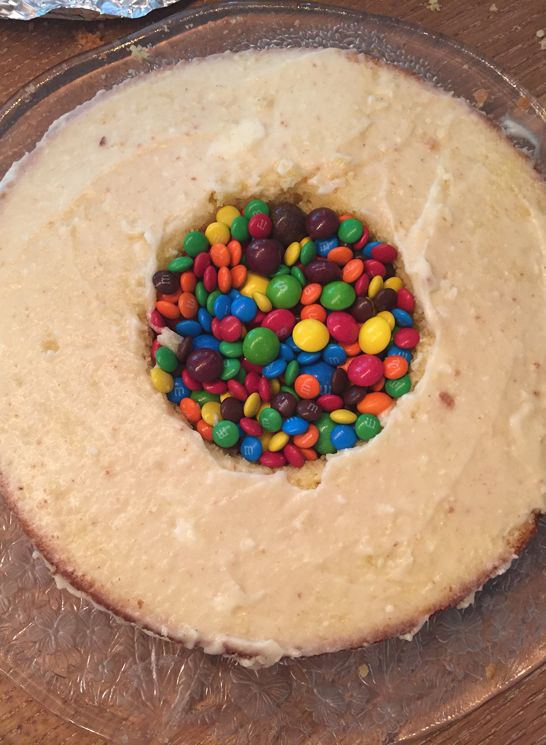 5. Wenn die beiden Küchen ausgekühlt sind, muss man sie horizontal auseinander schneiden und dann kann mit dem Zusammenstellen der Torte begonnen werden. Dazu ein Biskuit auf die Tortenplatte legen und mit einer Schicht Frosting bestreichen. Anschliessend das zweite darauf setzen und erneut bestreichen und dann noch das dritte aufsetzen. In diese drei aufeinandergetürmten Biskuits muss nun ein Loch in der Mitte herausgeschnitten werden. Am besten verwendet man dazu eine Form von ca, 10cm. In den entstandenen Hohlraum können nun die Süssigkeiten gefüllt werden und zum Schluss setzt man das letzte Biskuit als Deckel oben drauf.