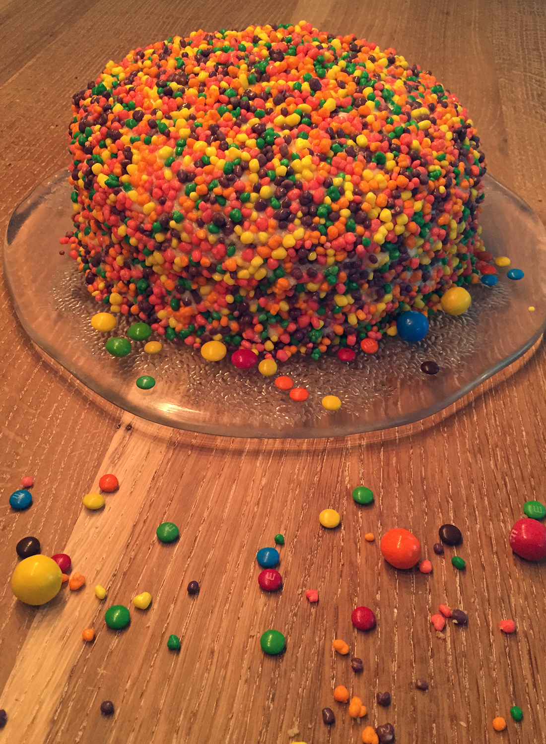 6. Die Torte muss rundherum mit dem restlichen Frostig eingestrichen werden. Dabei kann man sehr grosszügig sein. Als letzten Schritt müssen noch die Nerds-Süssigkeiten oder auch die Streusel an die Torte gedrückt werden.