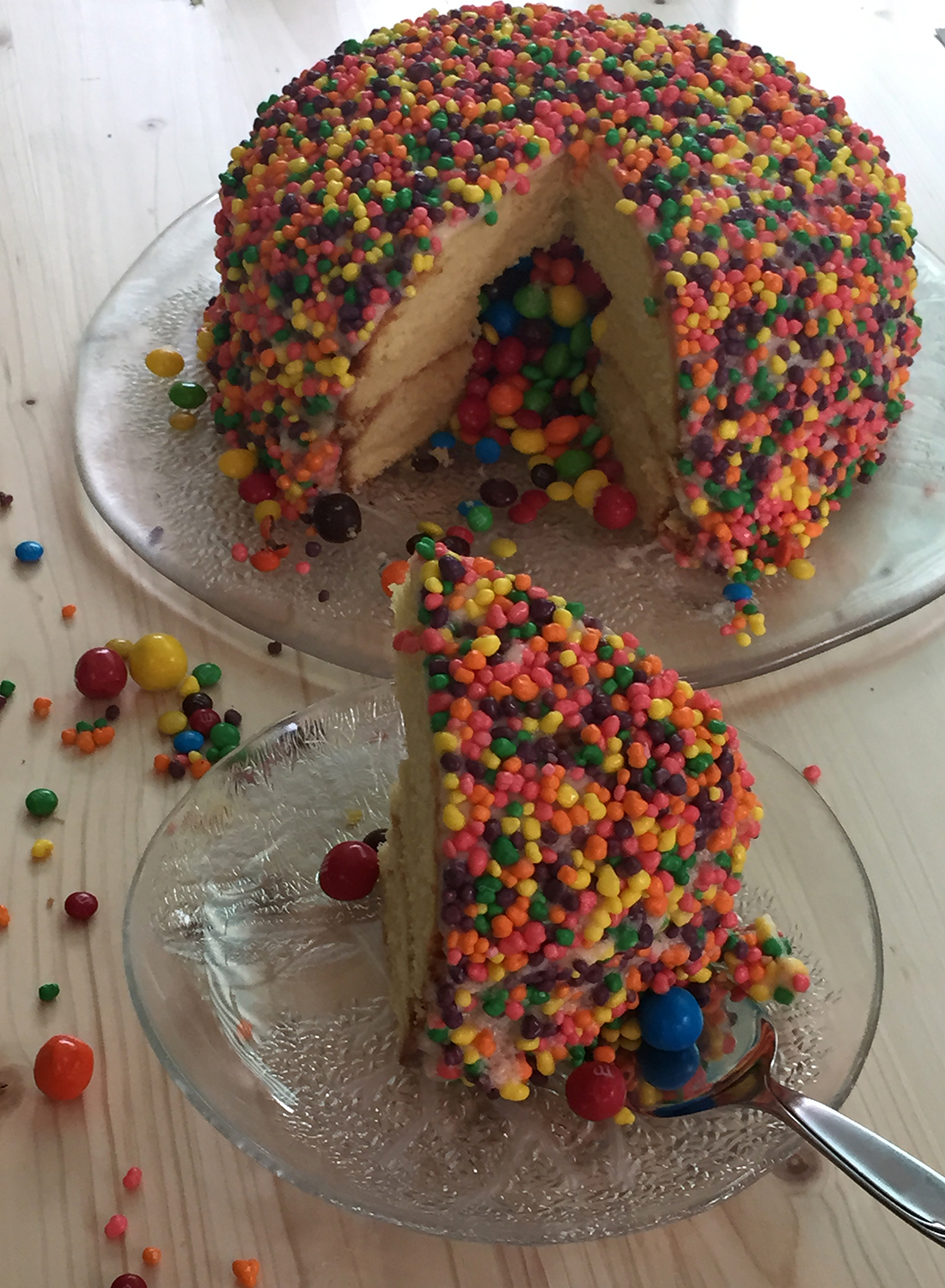 Soll es wieder mal etwas Farbiges sein? Dann ist diese Torte mehr als perfekt. Denn sie erstrahlt nicht nur von Aussen in vielen Farben, sondern auch von Innen. Grund dafür ist ein Hohlraum in der Torte, der mit vielen Süssigkeiten wie z.B. M&M’s gefüllt ist. Somit kann die Torte auch beim Anschneiden mit einem Überraschungseffekt punkten.