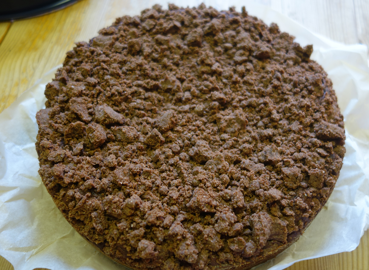 4. Während diese Mischung etwas abkühlt, das Mehl, Kakao und Backpulver in einer Schüssel vermischen und beiseite stellen. In einer weiteren Schüssel die Eier, Zucker und Vanillezucker für 2-3min rühren, sodass die Masse cremig und luftig wird. Unter rühren die Schokolade hinzufügen und im Anschluss die Mehlmischung ebenfalls unterrühren. Zum Schluss die Crème Fraîche und Mandelstäbe mit dem Handrührgerät unterrühren und den fertigen Teig in der Form verstreichen. Die Streusel darauf verteilen und ca. 40-45min backen.