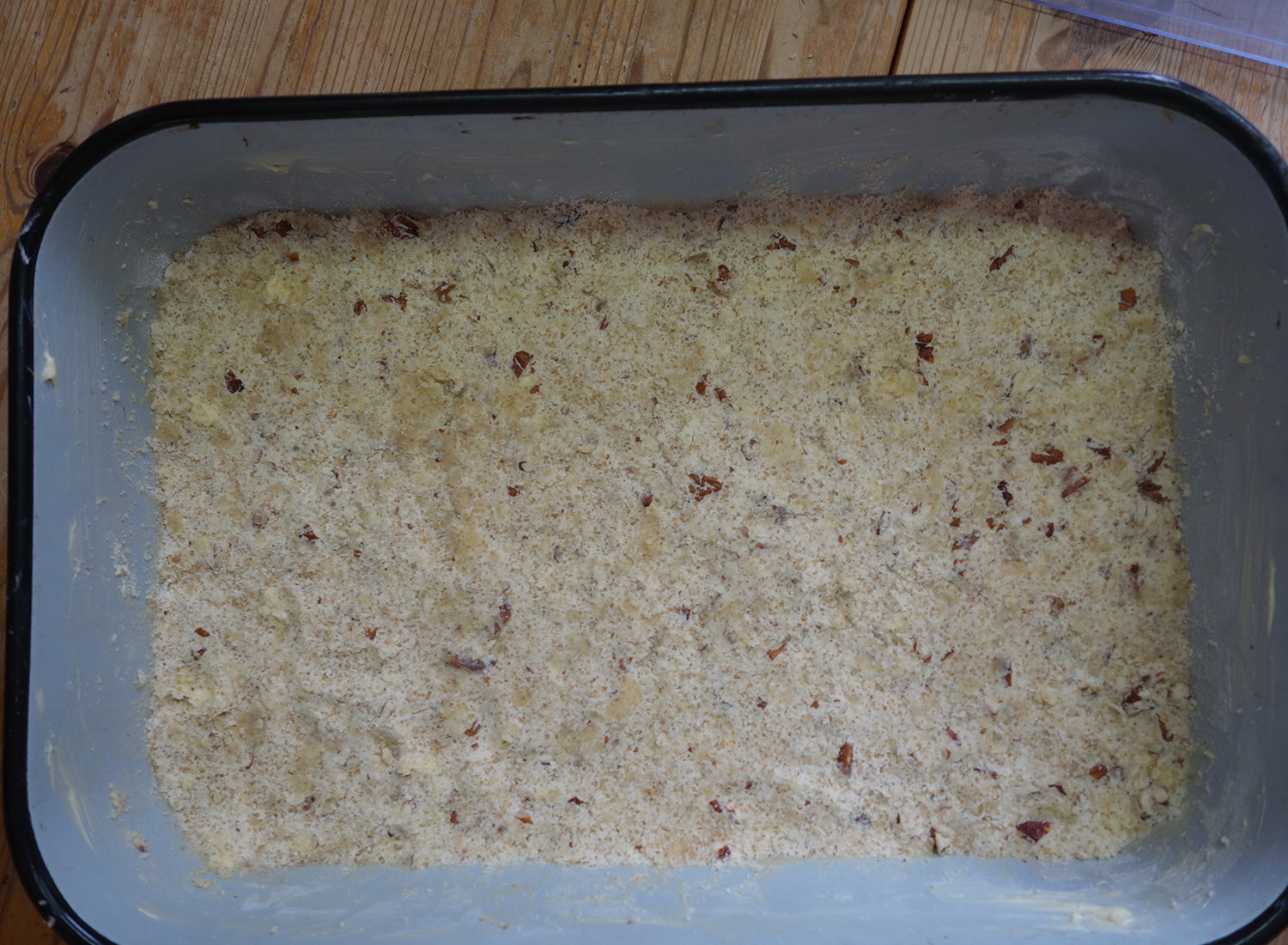 2. Für den Boden das Mehl mit dem Rohrzucker vermischen. Die Butter in kleinen Stücken dazugeben und mit dem Mehl verreiben. Die Pekannüsse fein hacken und mit dem krümeligen Teig vermischen. Anschliessend in die Form geben, verteilen und fest andrücken. Den Boden für 10min backen und 10min auskühlen lassen.