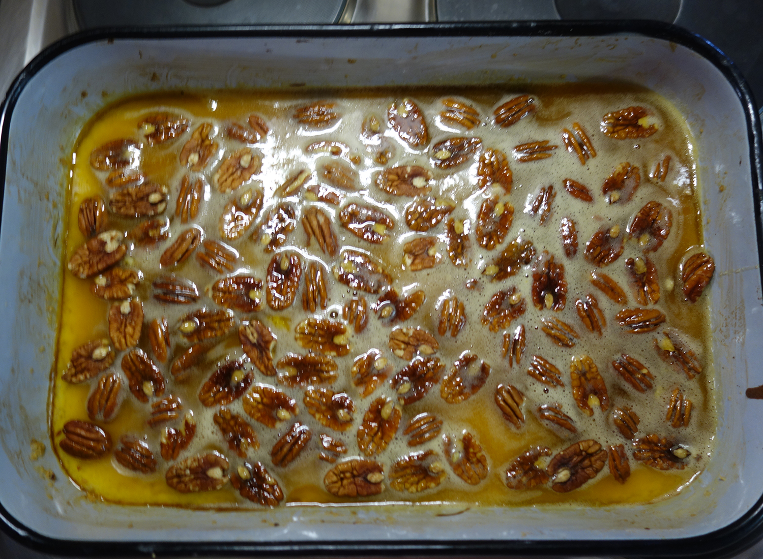 1. Den Backofen auf 175°C Umluft vorheizen und eine rechteckige Form (22x33cm) gut einfetten und bemehlen. Für die Pekan-Schicht muss ein Zuckersirup vorbereitet werden. Dazu 225g Zucker mit 75ml aufkochen, bis sich der Zucker aufgelöst hat. Den Sirup beiseite stellen.