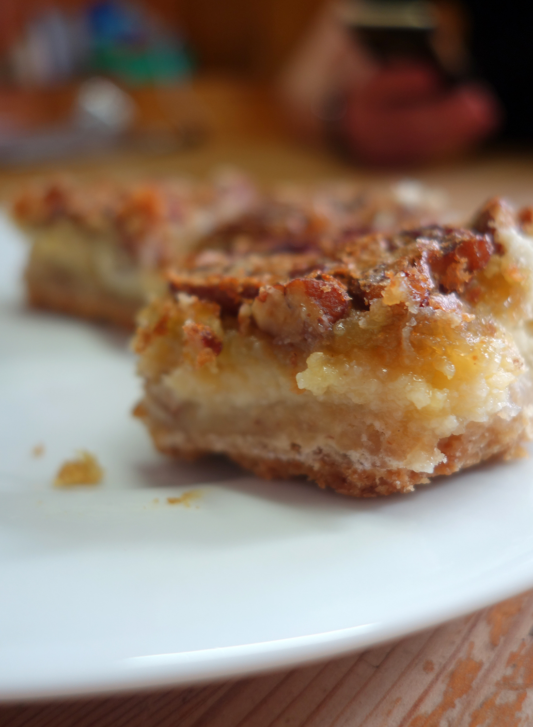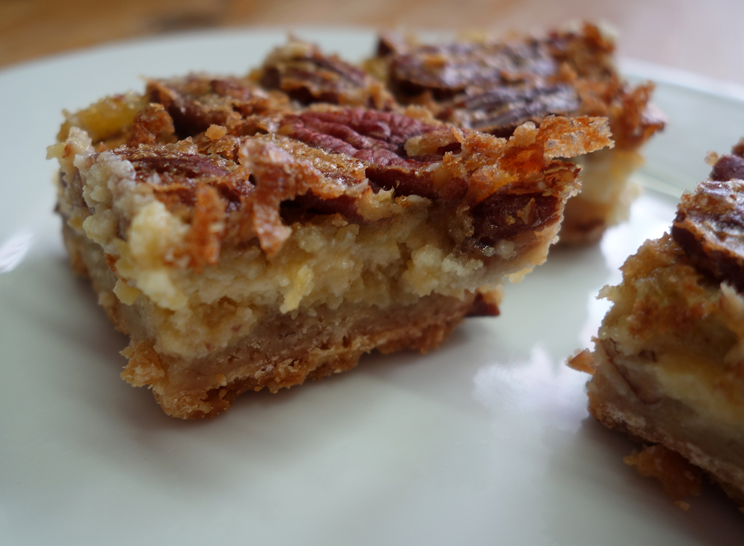 Die Menge an verarbeitetem Zucker ist durchaus beträchtlich und lässt einen bereits erahnen, dass es sich bei diesen Schnitten nicht unbedingt um ein leichtes und erfrischendes Dessert handelt. Das Resultat ist süss und leicht caramelisiert, aber auch sehr abwechslungsreich durch die Kombination von verschiedenen Konsistenzen (Teigboden, Cheesecake, und die knusprig-süsse Nussschicht). Obwohl dieses Rezept nicht das Liebste meines persönlichen Gaumens ist, erwärmt es mir jedoch jedes mal das Herz durch den emotionalen Wert welchen es für mich hat und welcher es mich immer und immer wieder mit Freude zubereiten lässt.