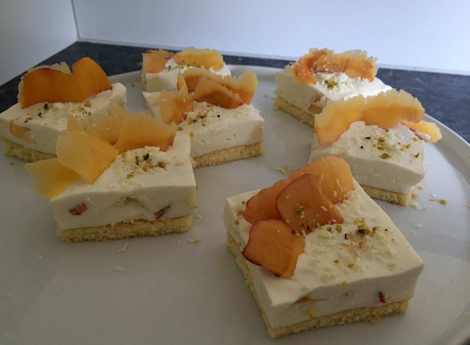 6. Für die Deko Pistazien hacken und die restlichen Nektarinen in Scheiben schneiden. Den Kuchen in ca. 20 Stück schneiden und mit den Schokoraspeln, Pistazien und Nektarinenscheiben verzieren.
