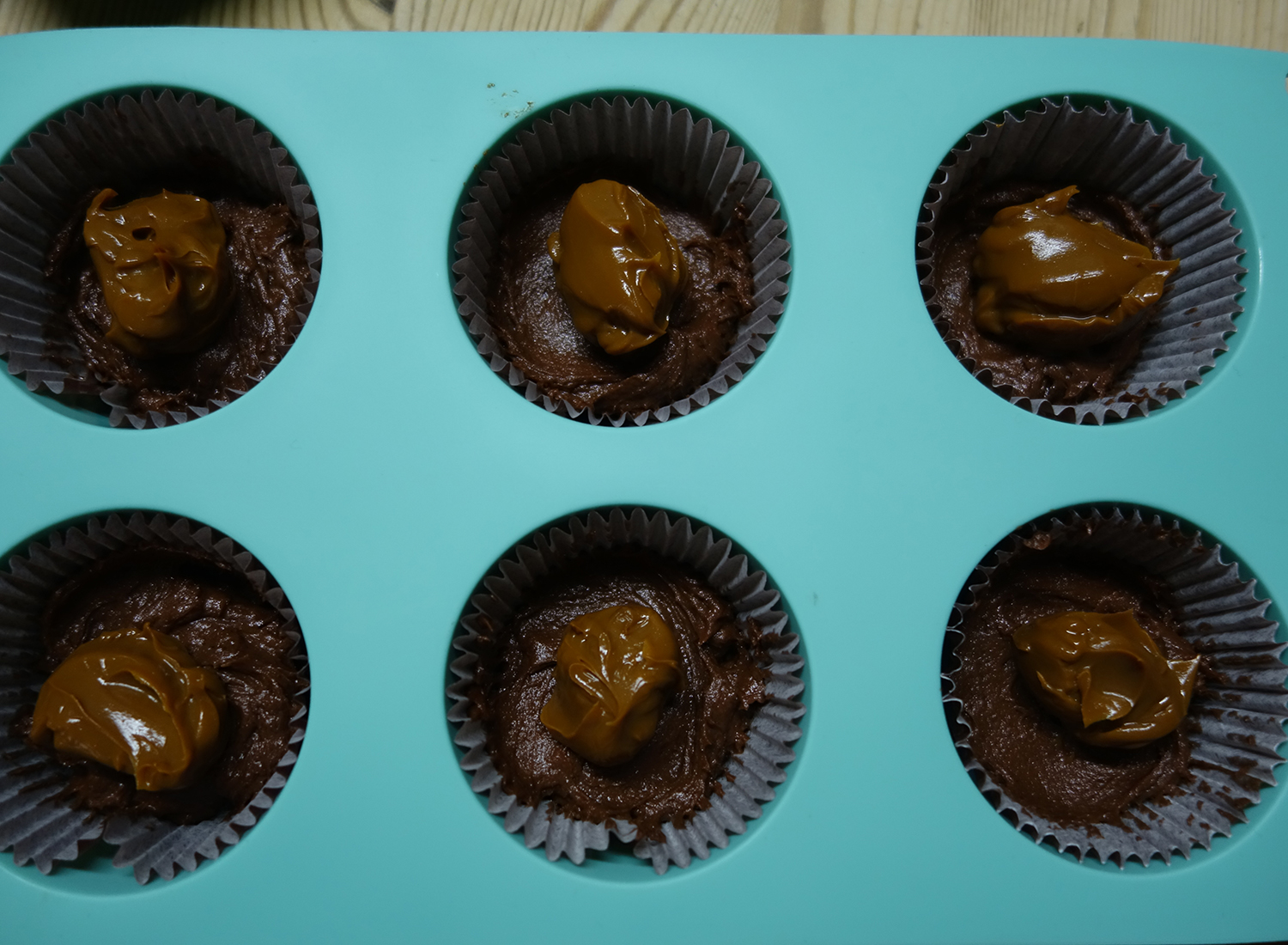 Sämtliche Böden der Papierförmchen mit Brownie-Teig bedecken (ca. 1 EL). Anschliessend einen grossen Teelöffel Dulce de leche in jedes Förmchen geben und den restlichen Teig auf die Förmchen verteilen. Die Förmchen sollten nicht mehr als ¾ voll sein. Falls zu viel Teig vorhanden ist, einfach zusätzliche Förmchen füllen.