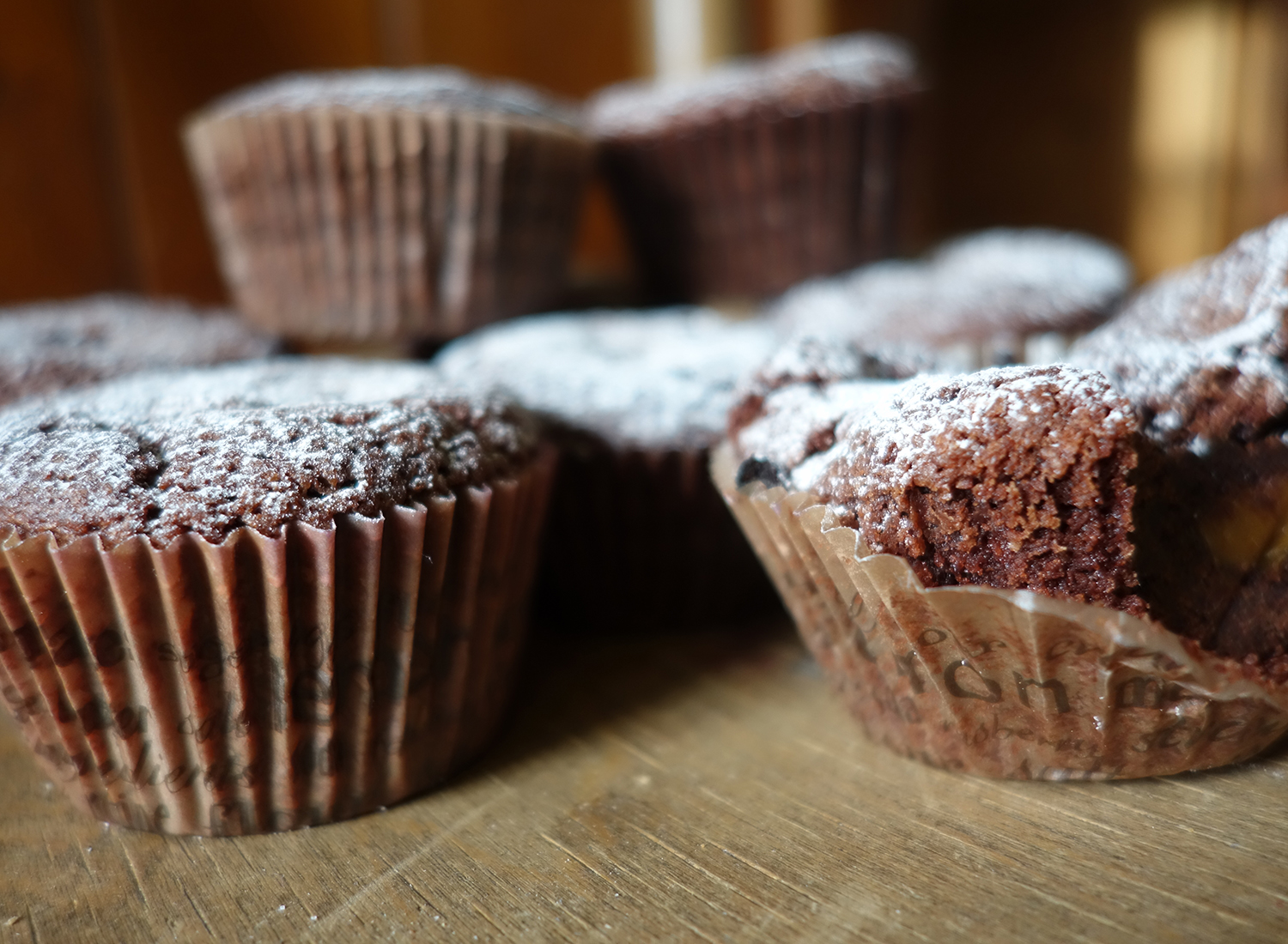 Die Muffins im Ofen während 10min backen und auskühlen lassen. Mit Puderzucker bestäuben.